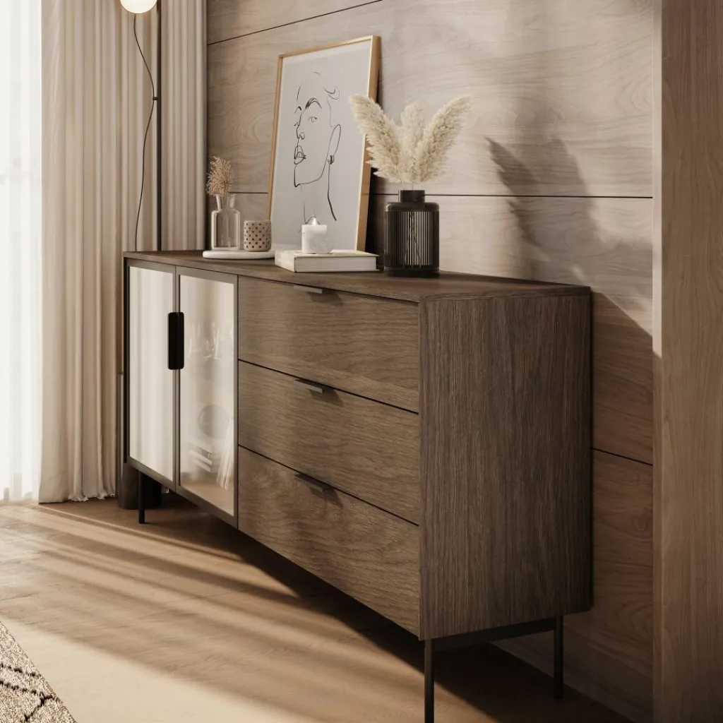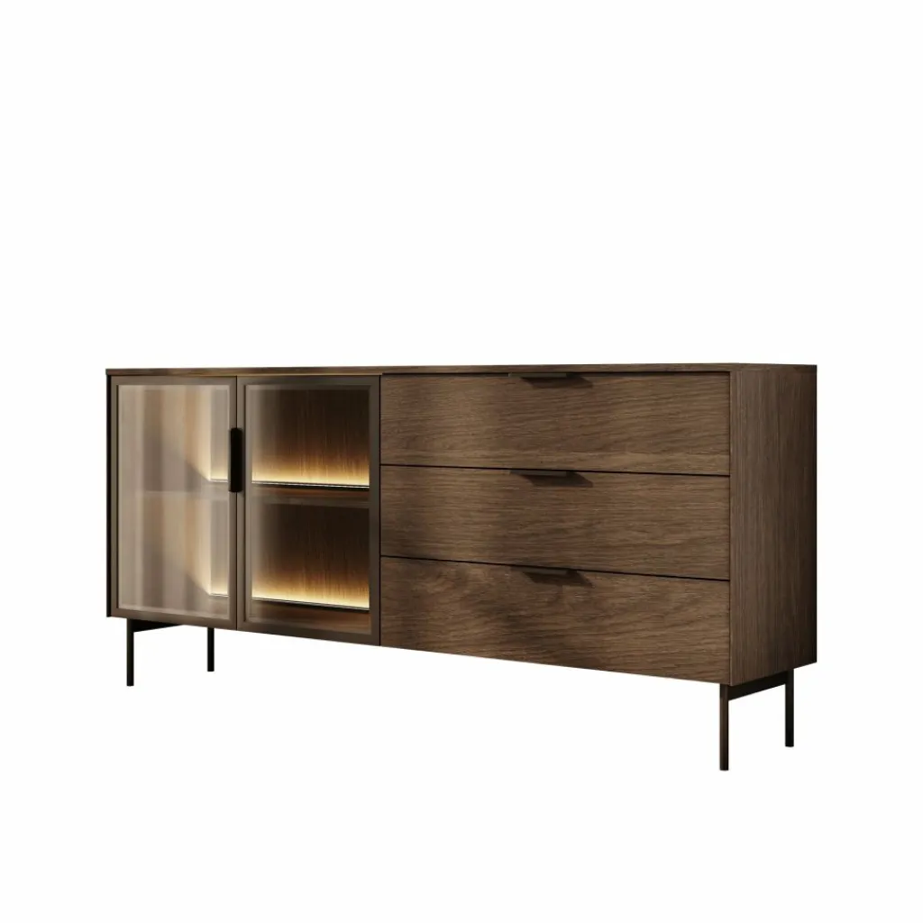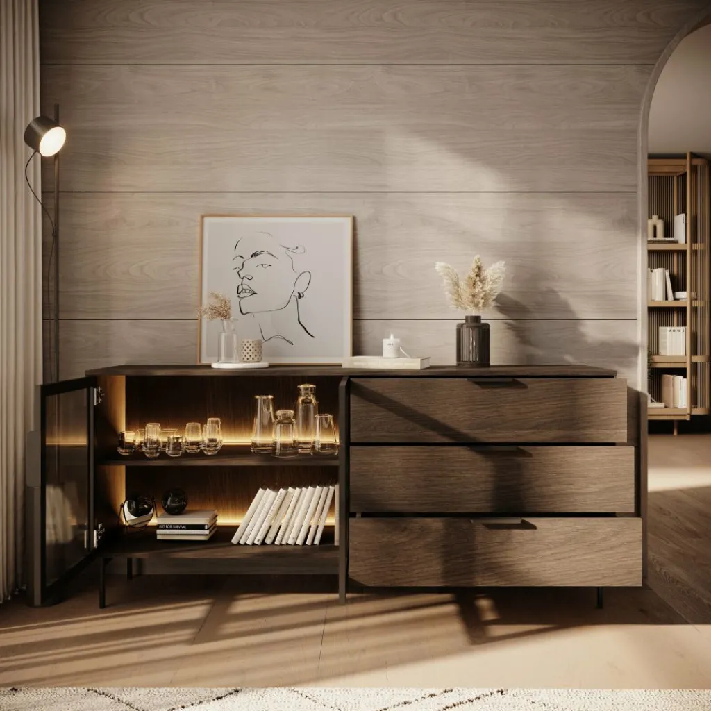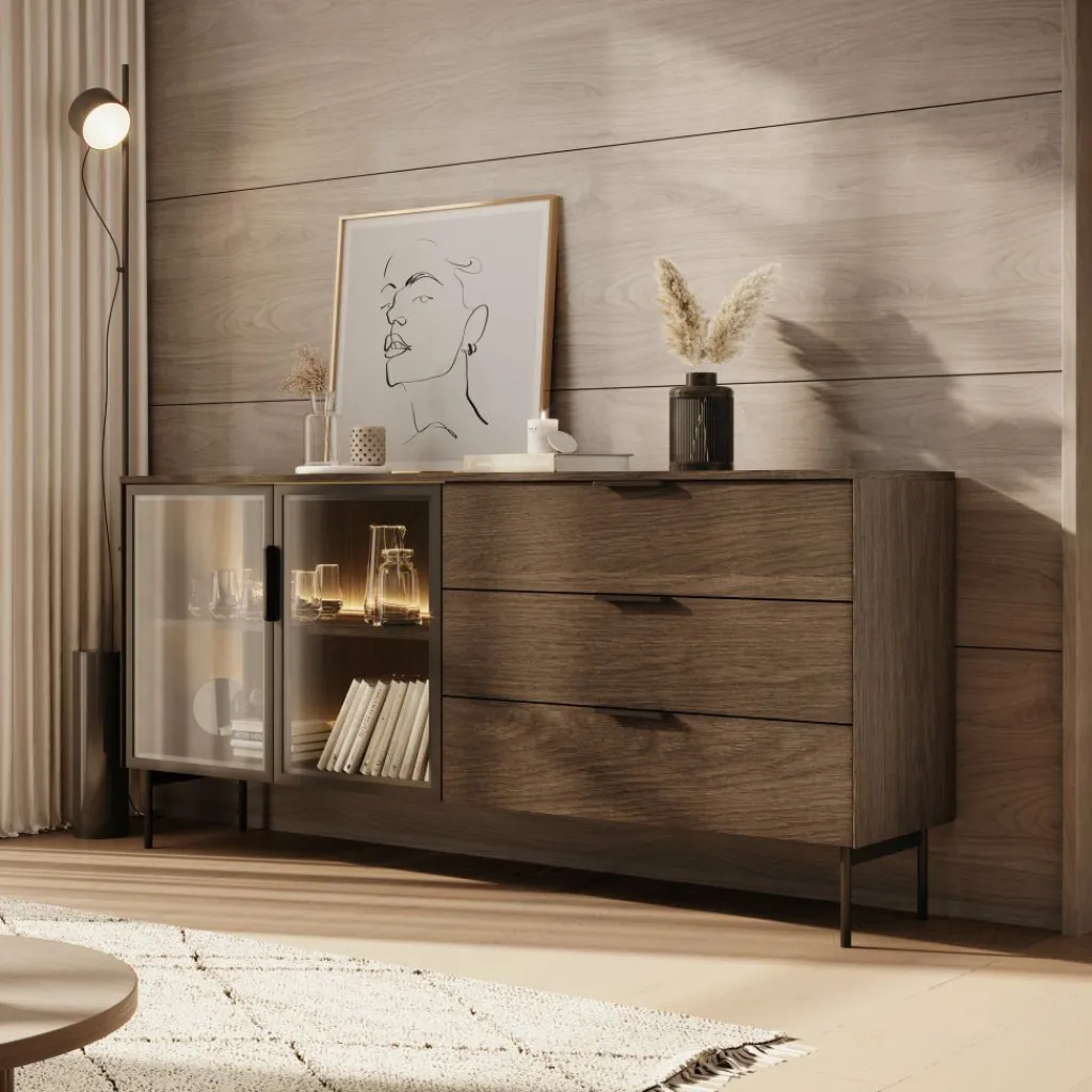 Het Lomo dressoir in donker eikenlook beschikt over drie ruime lades en een vitrinedeur met glas en geïntegreerde ledverlichting. Zo wissel je eenvoudig tussen gesloten en zichtbaar opbergen. Achter het glas kun je servies, boeken of decoratieve accessoires plaatsen, terwijl de lades geschikt zijn voor items die je liever uit het zicht houdt.