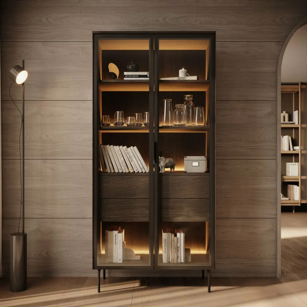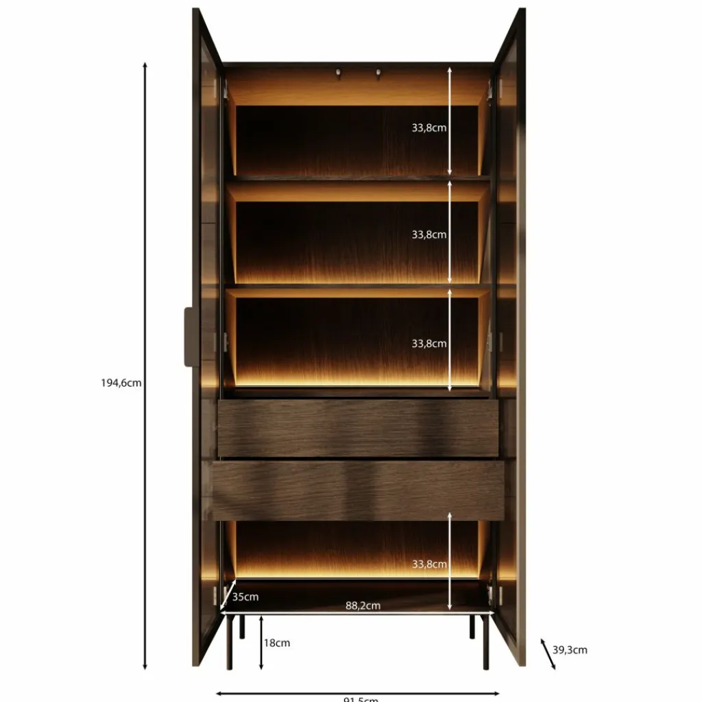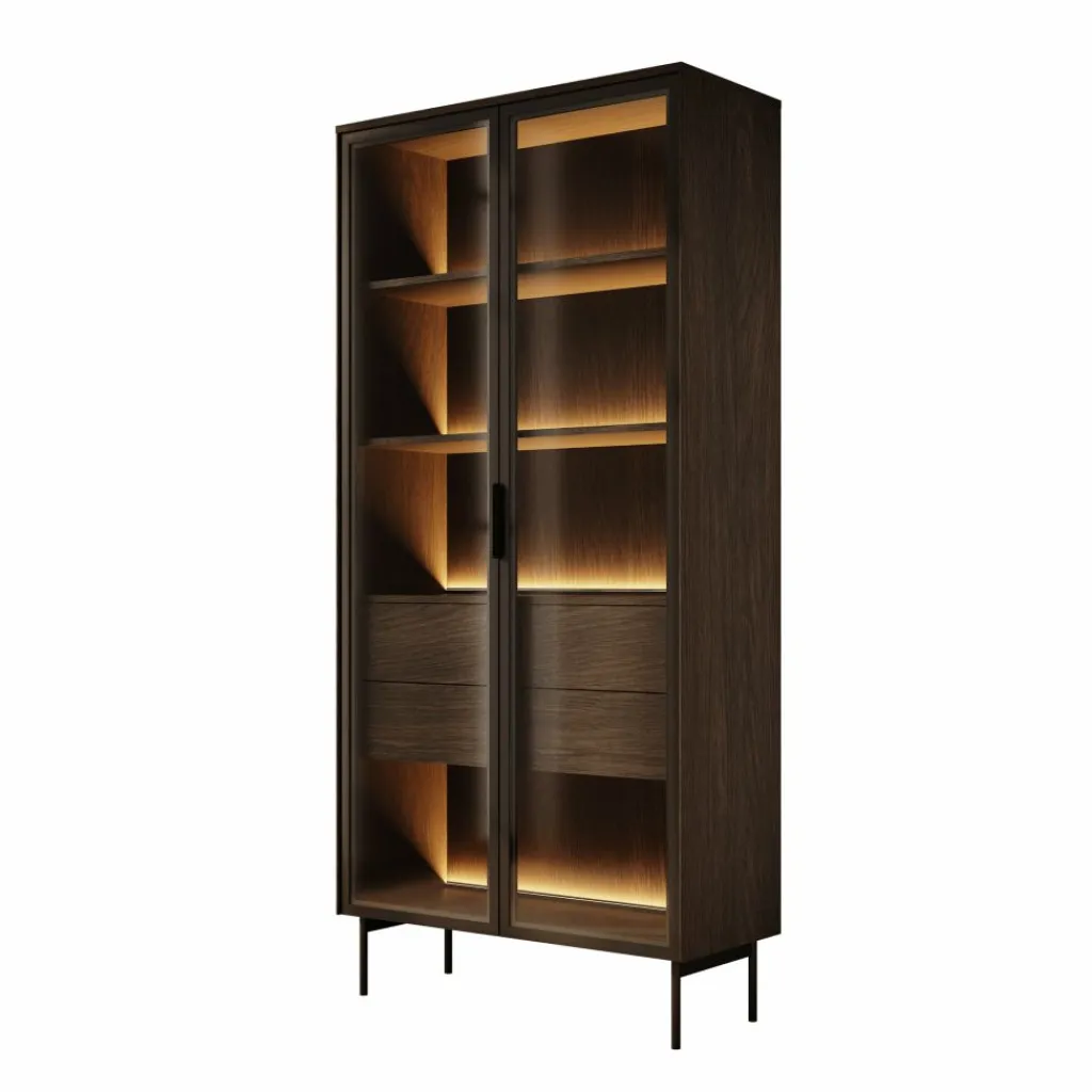 De Lomo vitrinekast in donker eiken is voorzien van twee glazen deuren met subtiele omlijsting en een warme houtstructuur. Binnenin bevinden zich meerdere legplanken en twee ruime lades, ideaal voor het opbergen van servies, boeken of decoratie.