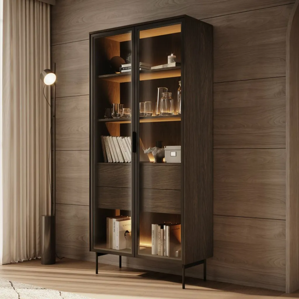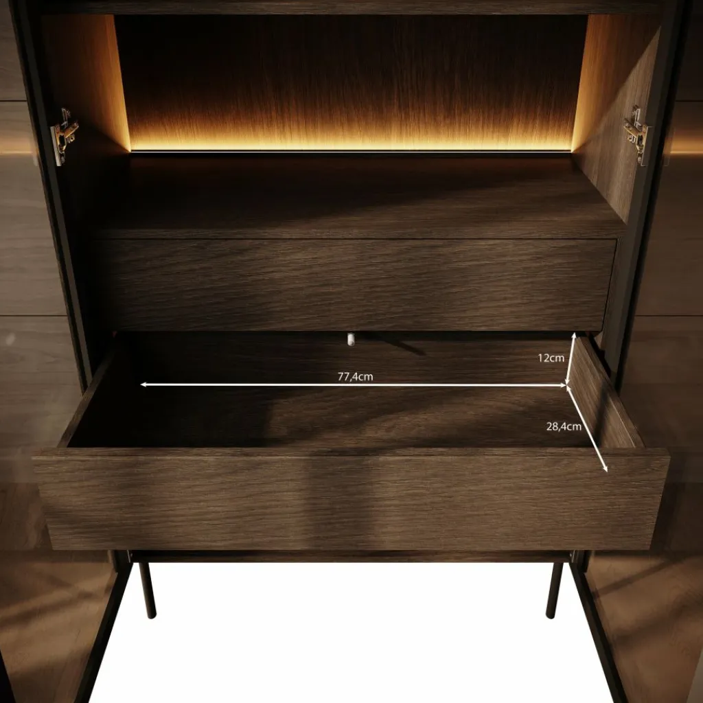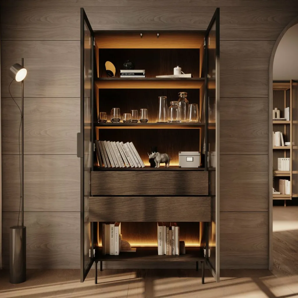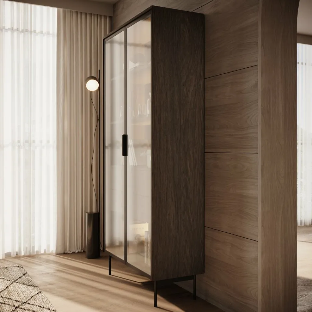 De Lomo vitrinekast in donker eiken is voorzien van twee glazen deuren met subtiele omlijsting en een warme houtstructuur. Binnenin bevinden zich meerdere legplanken en twee ruime lades, ideaal voor het opbergen van servies, boeken of decoratie.