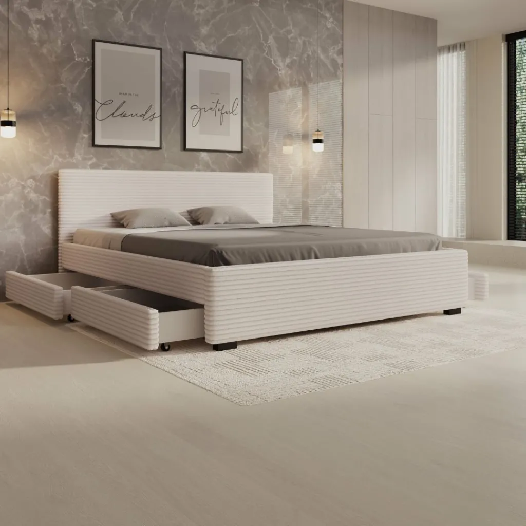 Het Loox bed in 180×200 cm is het grootste formaat binnen de serie en biedt een breed ligvlak voor twee personen. De ribstofbekleding en rechte vormgeving blijven ook in deze uitvoering duidelijk aanwezig. De constructie is stevig opgebouwd en geschikt voor dagelijks gebruik. Het bed wordt geleverd inclusief lattenbodem en zonder matras.