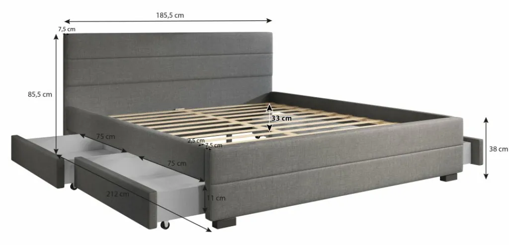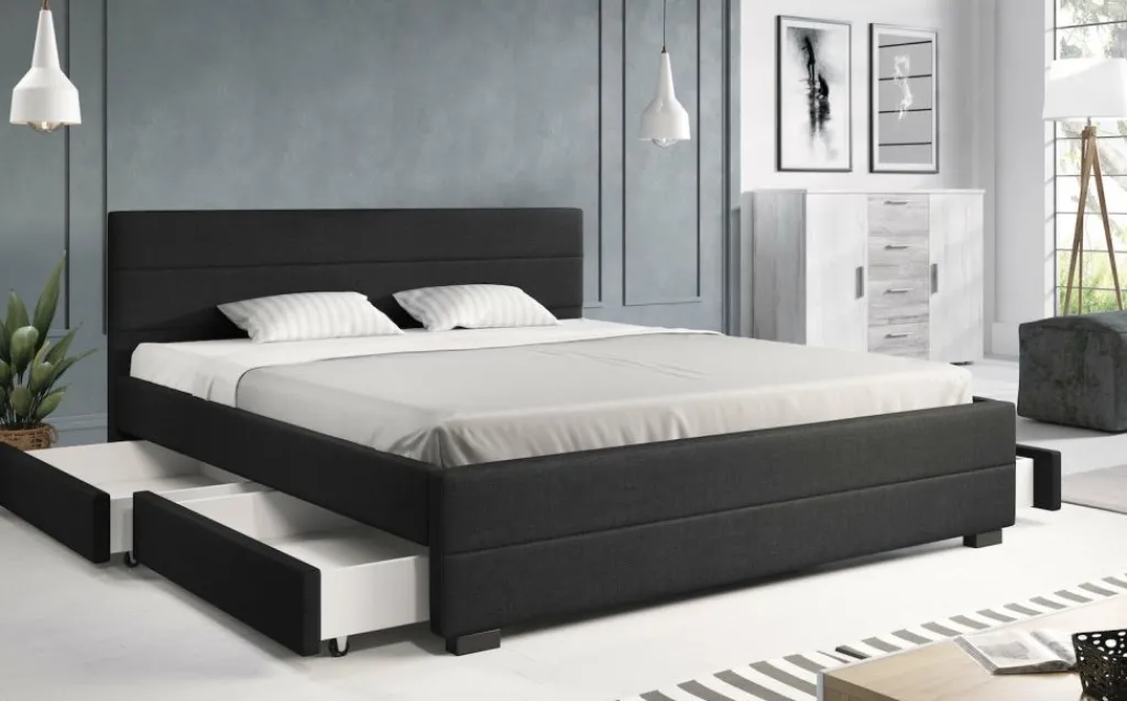 Tweepersoonsbed Loox is een praktisch, modern bed en een echte eyecatcher. Dit model is afgewerkt met onderhoudsvriendelijke stof in de kleur grijs. Het bed beschikt over een stevige constructie inclusief hoofdbord, voetbord en zijpanelen en staat op pootjes van 4,5 cm hoog. Bij de prijs is ook een standaard lattenbodem inbegrepen. Een matras wordt niet bijgeleverd. Het bed is ontzettend praktisch aangezien er in totaal vier lades met wieltjes in geplaatst zijn: twee aan iedere zijkant. Tweepersoonsbed Loox heeft een draagvermogen van 100 kg per ligzijde.