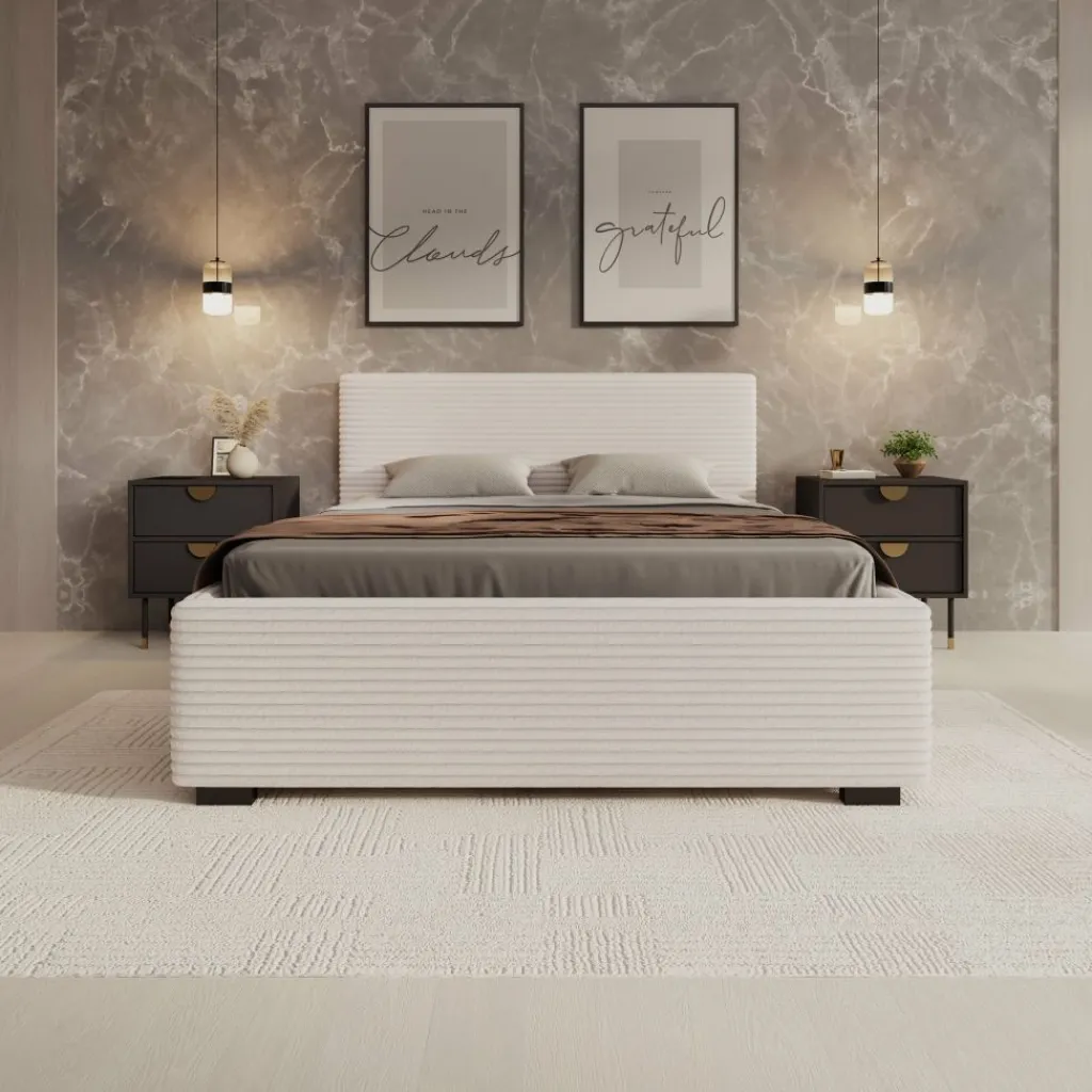 Het Loox bed heeft een strak en functioneel frame met een bekleding in beige ribstof. De verticale ribstructuur zorgt voor duidelijke lijnvoering, waardoor het bed goed aansluit bij hedendaagse interieurs. De stevige basis en de hogere rand rondom het liggedeelte geven het meubel een solide geheel. Het bed wordt geleverd inclusief lattenbodem en zonder matras.