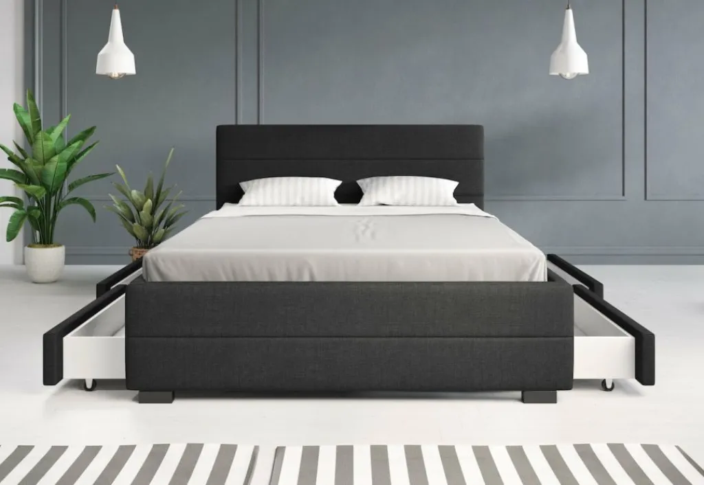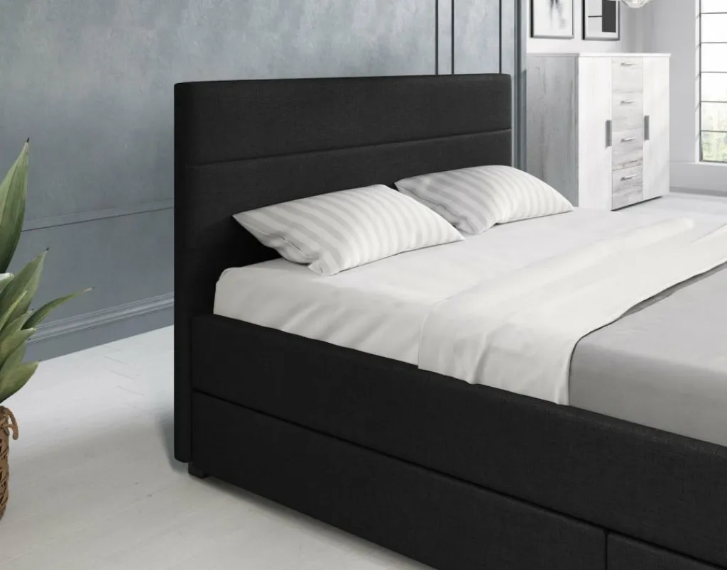 Tweepersoonsbed Loox is een praktisch, modern bed en een echte eyecatcher. Dit model is afgewerkt met onderhoudsvriendelijke stof in de kleur grijs. Het bed beschikt over een stevige constructie inclusief hoofdbord, voetbord en zijpanelen en staat op pootjes van 4,5 cm hoog. Bij de prijs is ook een standaard lattenbodem inbegrepen. Een matras wordt niet bijgeleverd. Het bed is ontzettend praktisch aangezien er in totaal vier lades met wieltjes in geplaatst zijn: twee aan iedere zijkant. Tweepersoonsbed Loox heeft een draagvermogen van 100 kg per ligzijde.