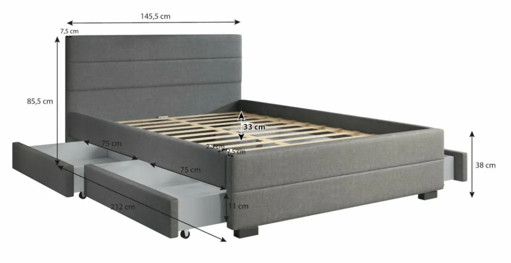 Tweepersoonsbed Loox is een praktisch, modern bed en een echte eyecatcher. Dit model is afgewerkt met onderhoudsvriendelijke stof in de kleur grijs. Het bed beschikt over een stevige constructie inclusief hoofdbord, voetbord en zijpanelen en staat op pootjes van 4,5 cm hoog. Bij de prijs is ook een standaard lattenbodem inbegrepen. Een matras wordt niet bijgeleverd. Het bed is ontzettend praktisch aangezien er in totaal vier lades met wieltjes in geplaatst zijn: twee aan iedere zijkant. Tweepersoonsbed Loox heeft een draagvermogen van 100 kg per ligzijde.