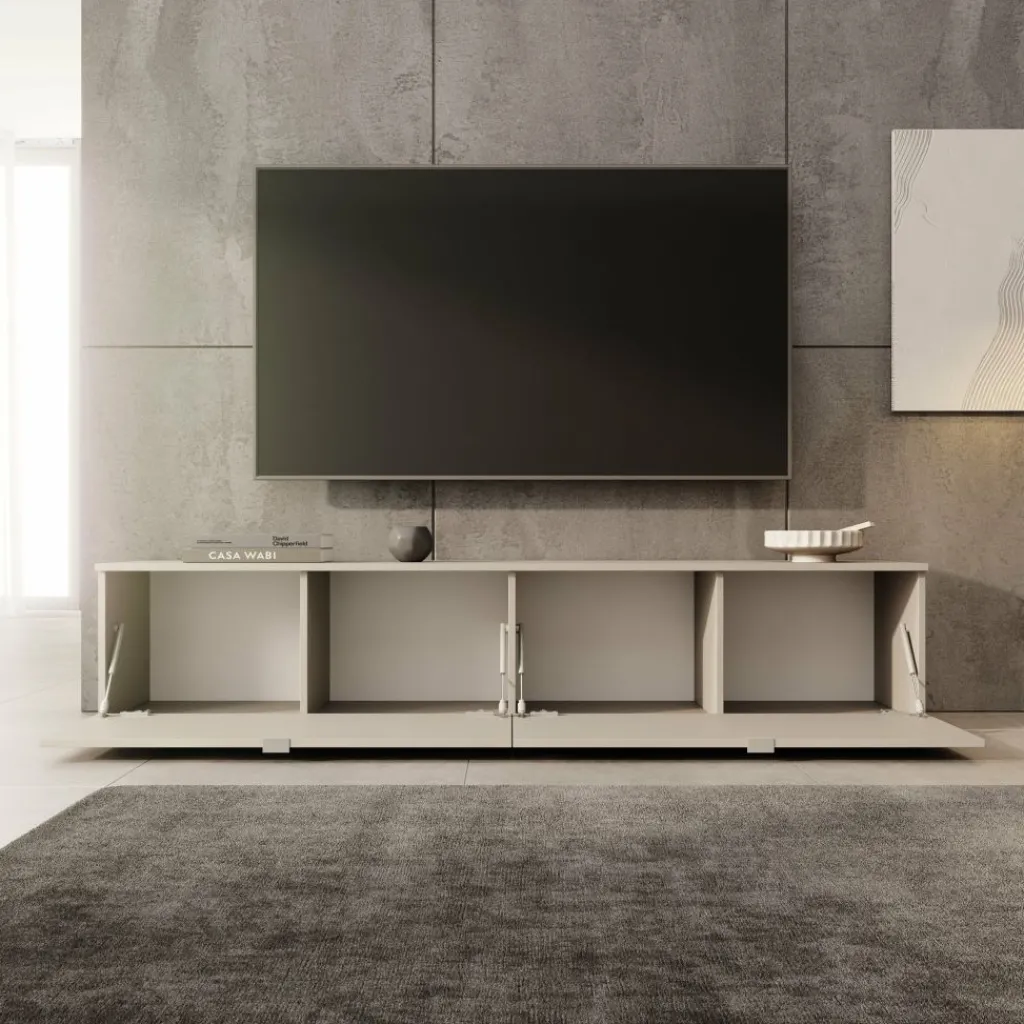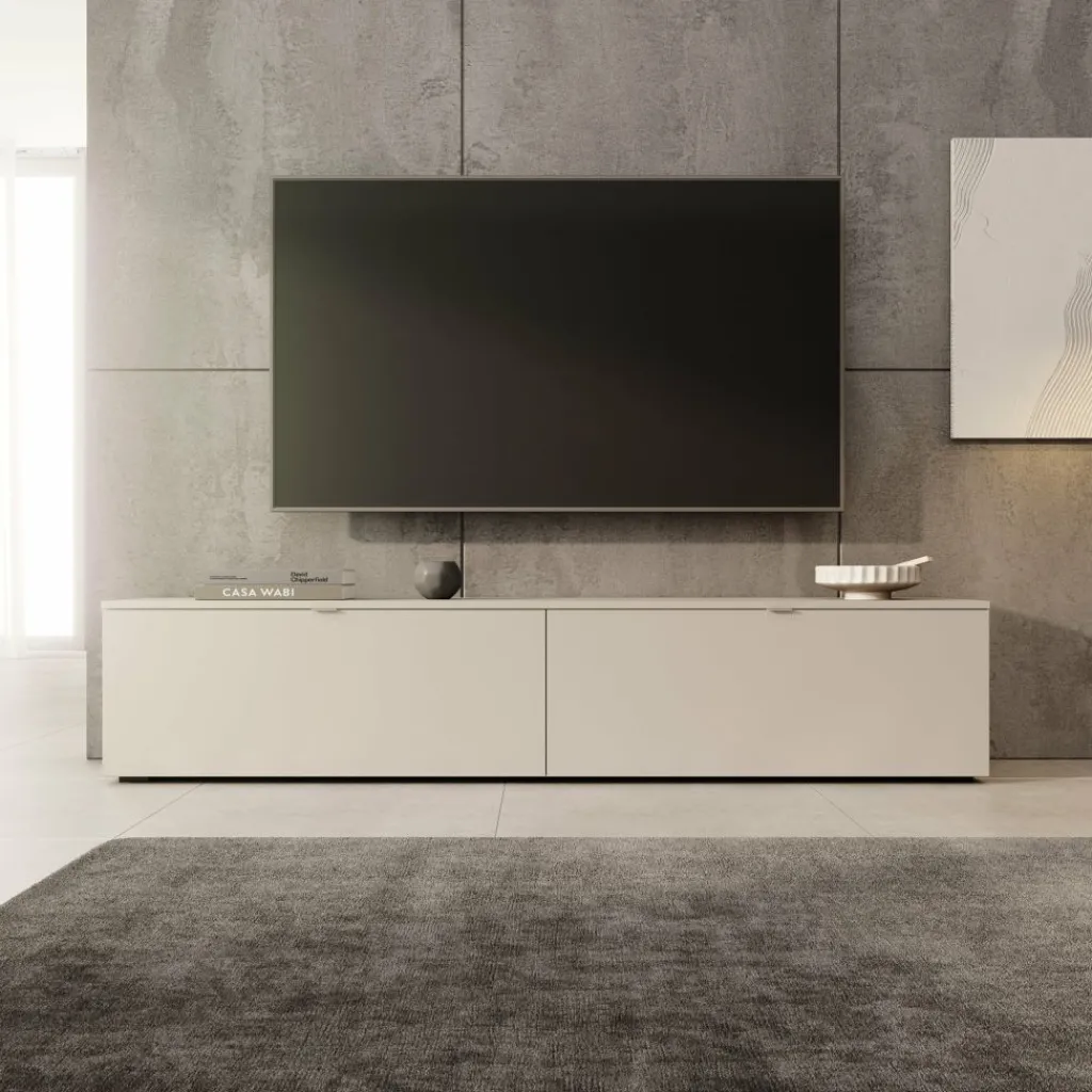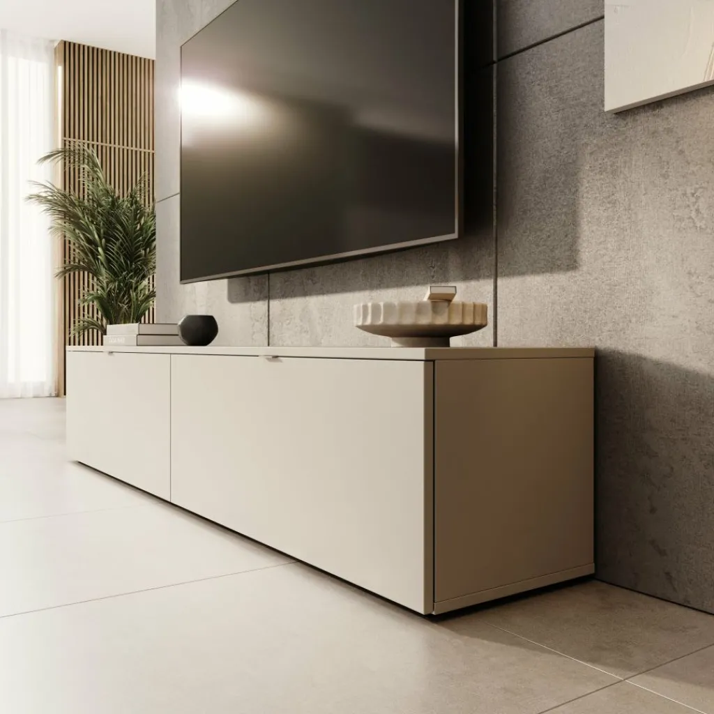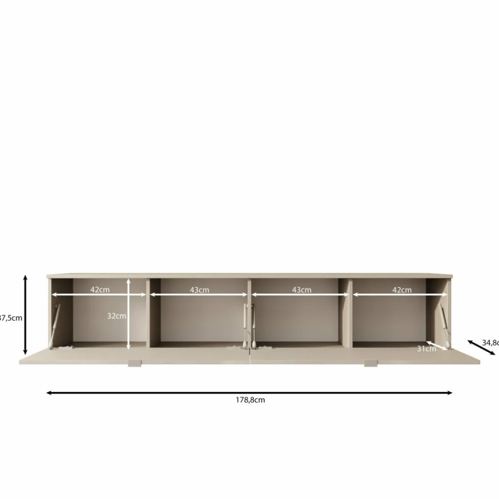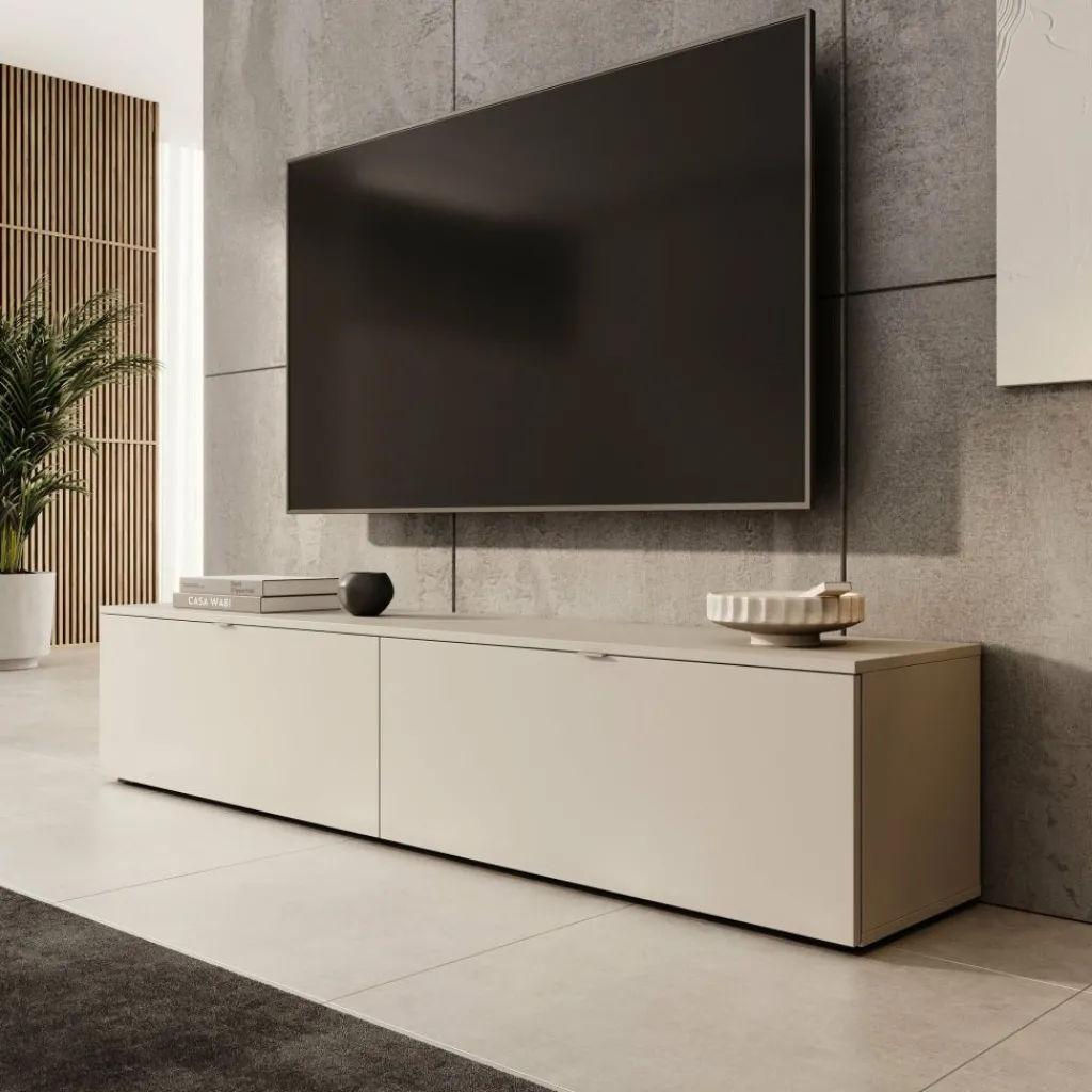 Het tv-meubel Lornes is uitgevoerd in beige en heeft een afmeting van 180 × 35 × 38 cm. Door de brede opzet is dit meubel geschikt voor grotere tv’s en biedt het voldoende opbergruimte in de woonkamer.