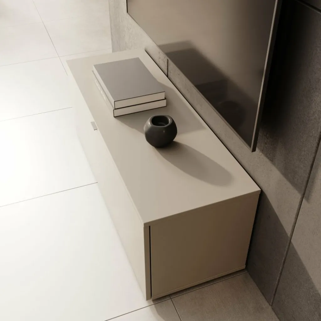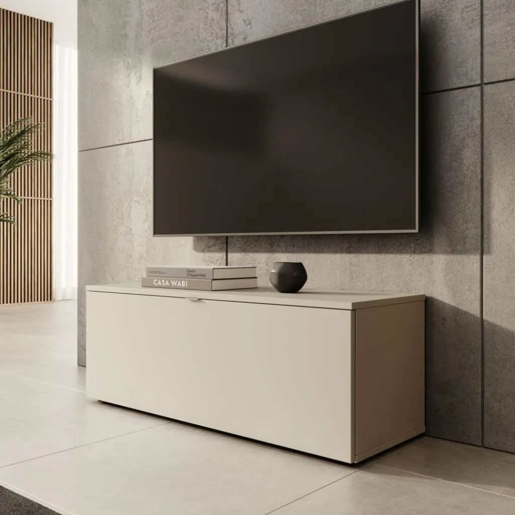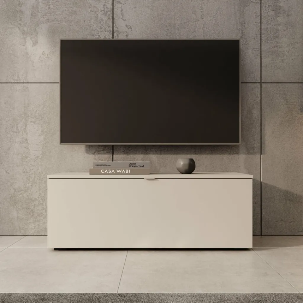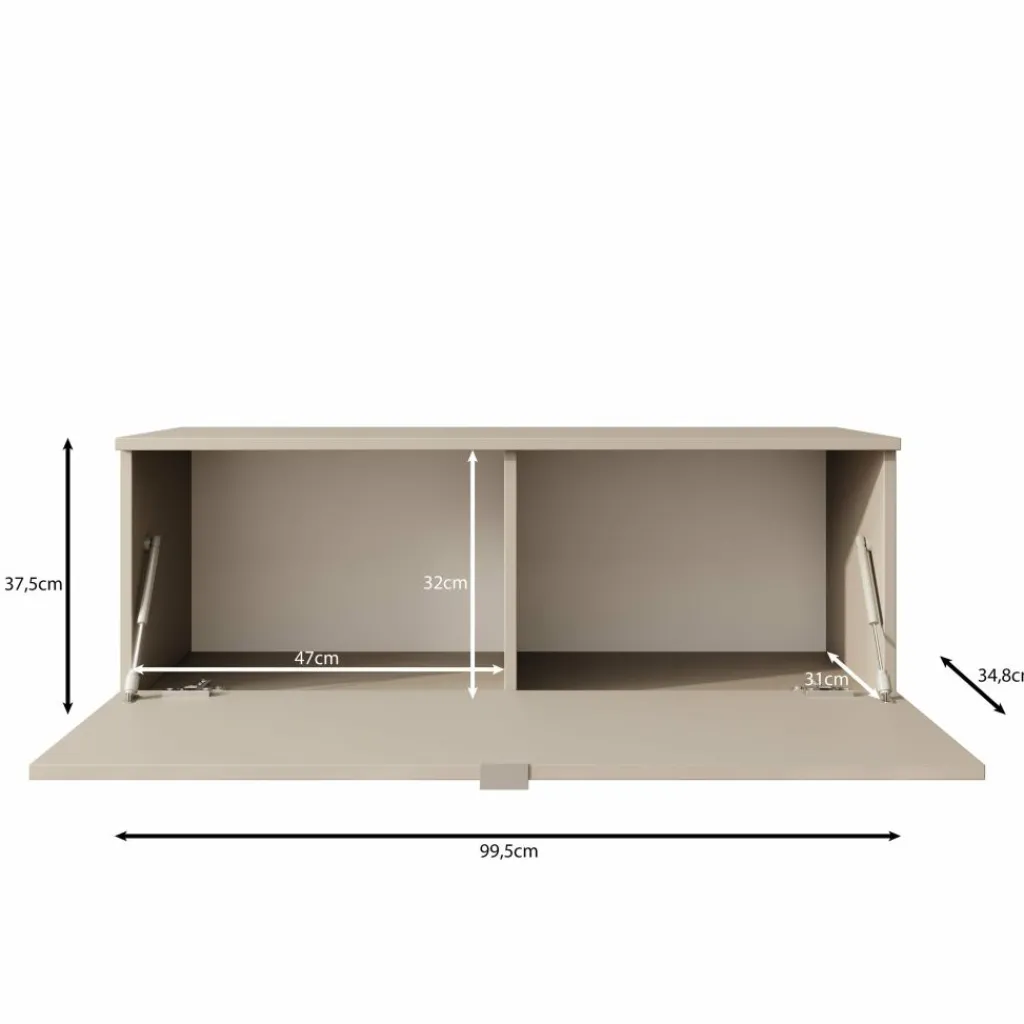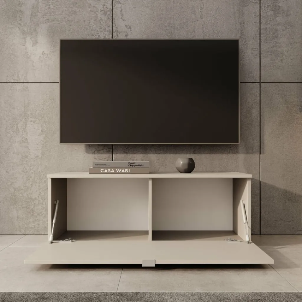 Het meubel is voorzien van één brede klep die naar beneden opent. Achter deze klep bevindt zich een open opbergvak over de volledige breedte, geschikt voor apparatuur, spelconsoles of accessoires. De klep wordt ondersteund door gasveren, waardoor openen en sluiten gecontroleerd verloopt en het vak goed toegankelijk blijft.