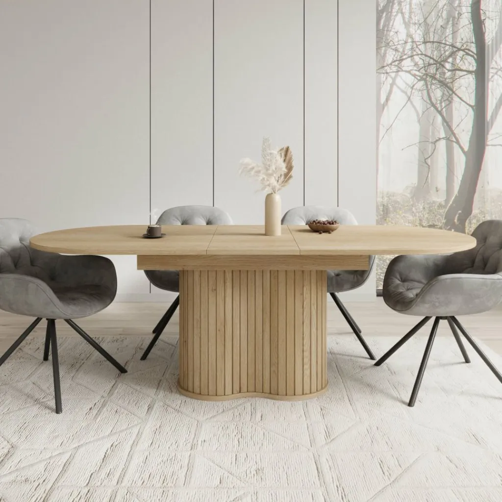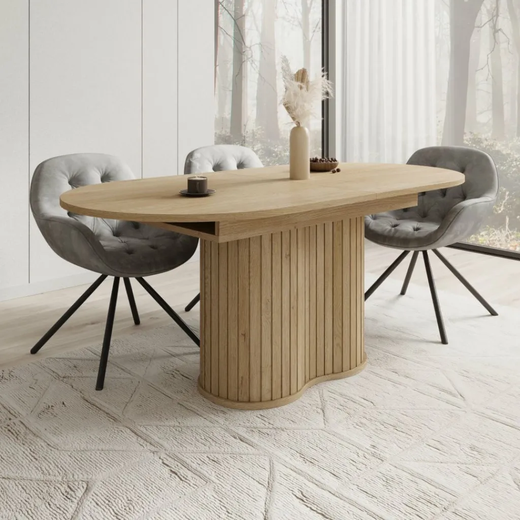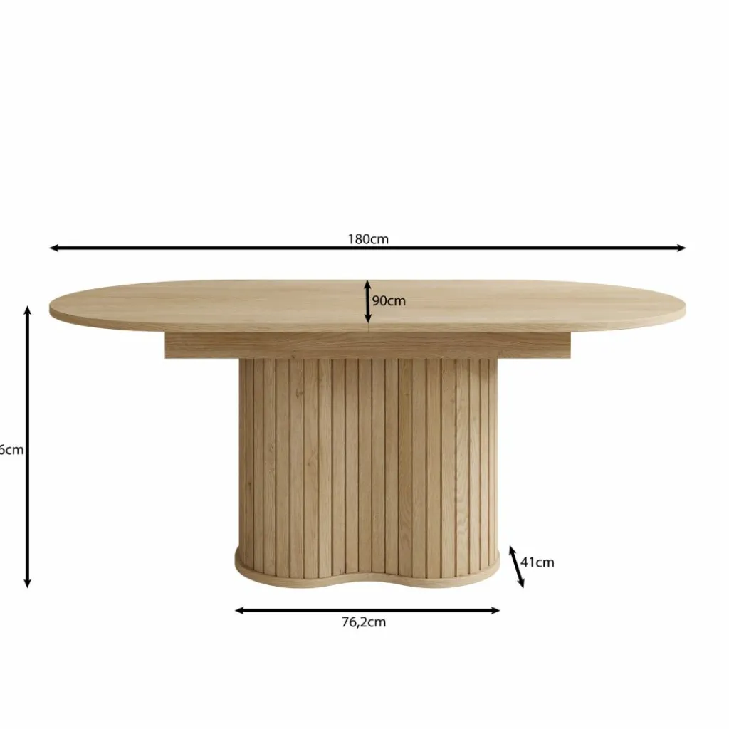 De eetkamertafel Loro is een ovale tafel uitgevoerd in een eikenpatroon met een afmeting van 180x90x76 cm. De tafel is uitschuifbaar en kan worden verlengd tot 220 cm, waardoor extra zitplaatsen kunnen worden gecreëerd wanneer dat nodig is. De ovale vorm zorgt voor een gelijkmatige verdeling van de ruimte rondom de tafel.