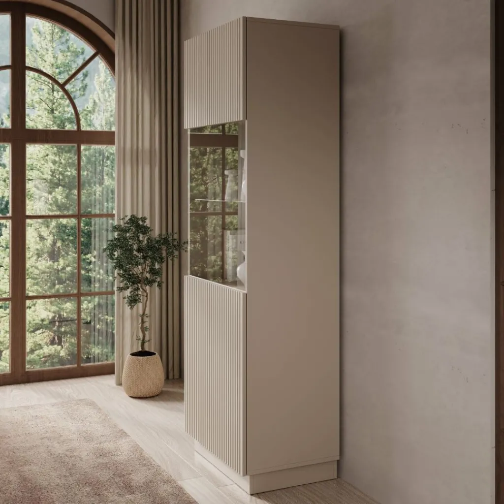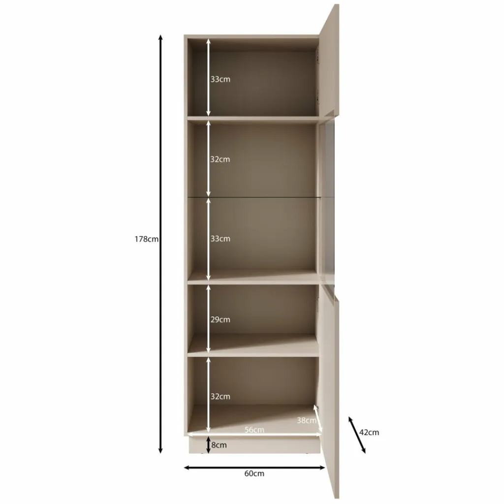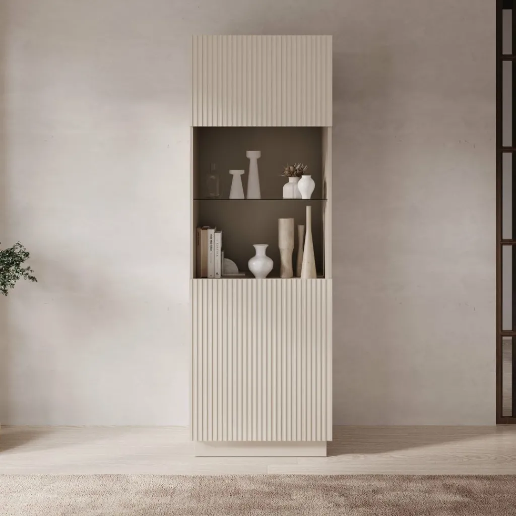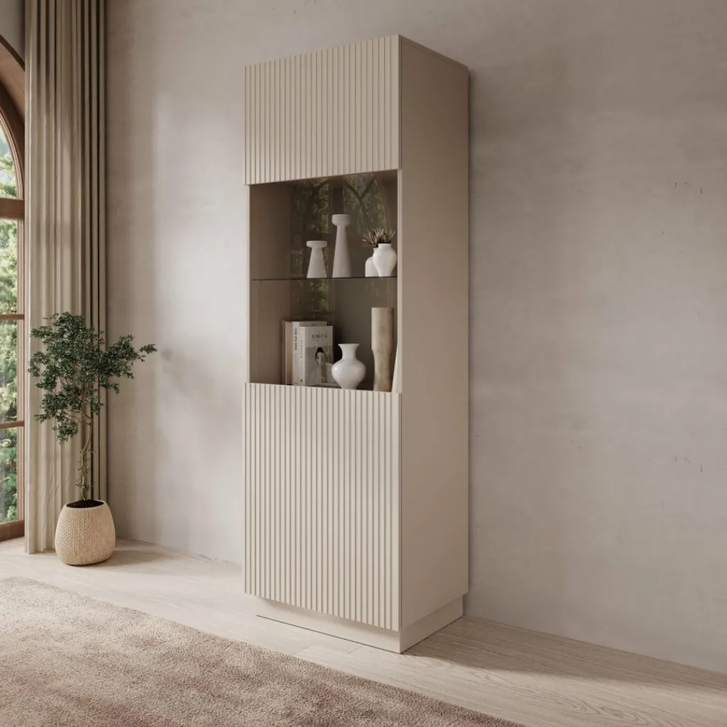 De Lucera vitrinekast in beige is een smalle en hoge kast die geschikt is voor het opbergen en presenteren van verschillende items. In het midden bevindt zich een open vak met een glazen plank, ideaal voor decoratie, servies of andere accessoires. Achter de deuren bevinden zich extra opbergvakken met legplanken voor spullen die je liever uit het zicht bewaart.