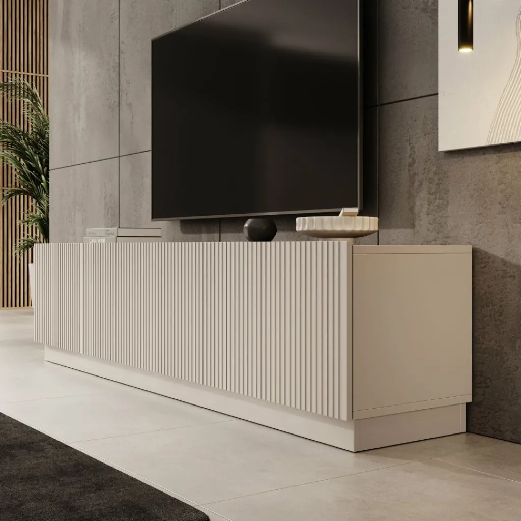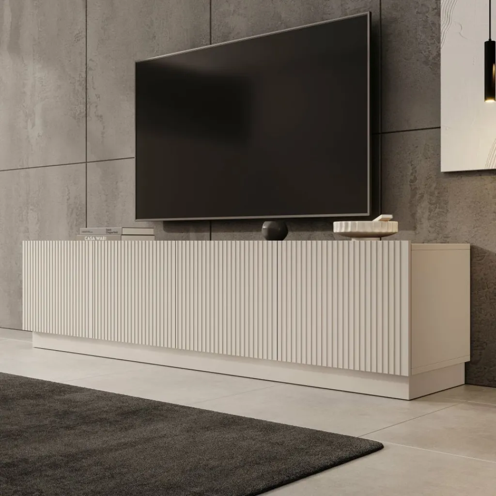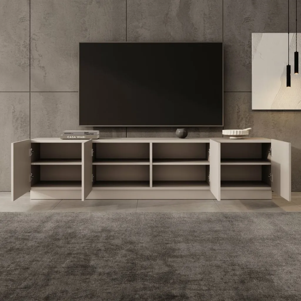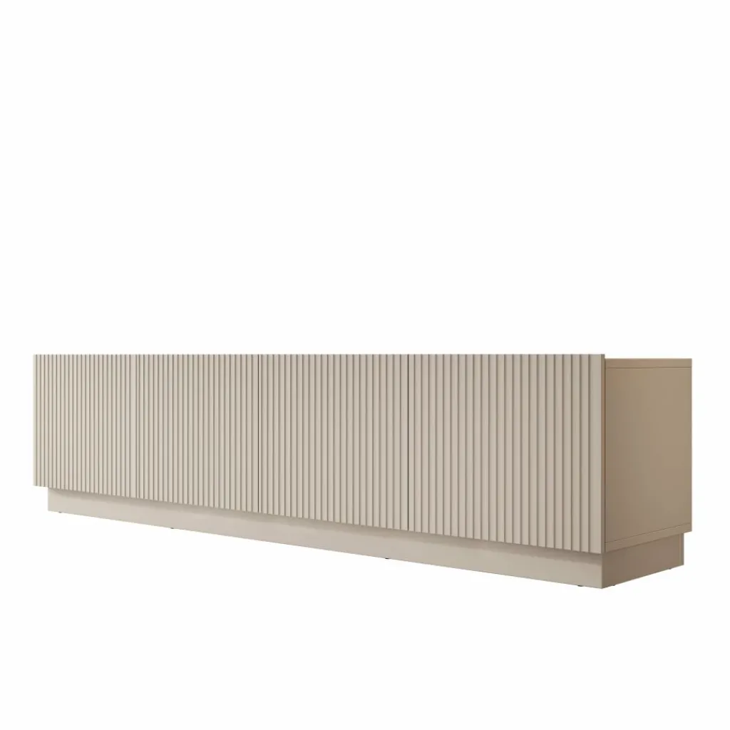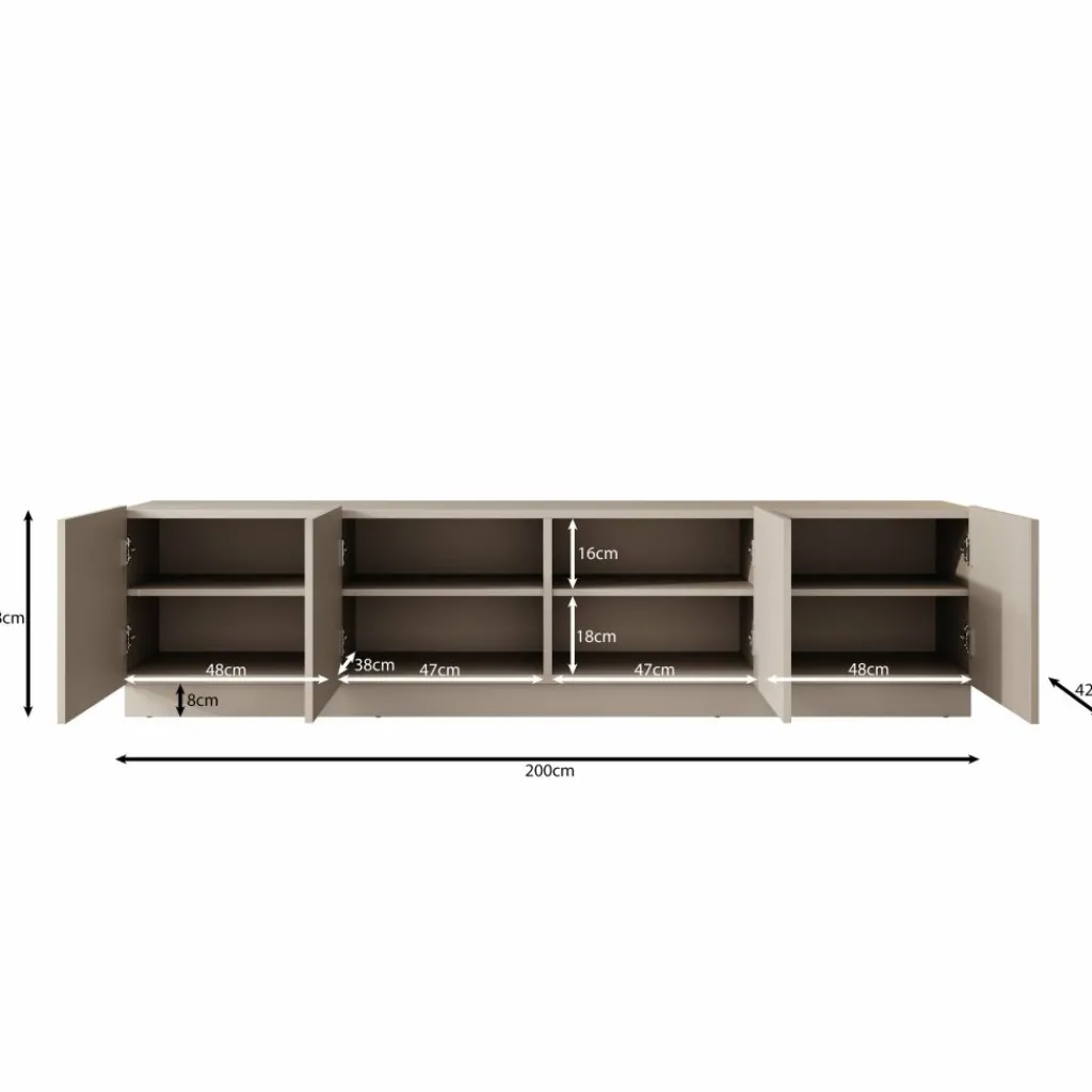 Het Lucera tv-meubel in beige is een ruim en strak vormgegeven meubel dat een stevige basis vormt onder je televisie. Met een breedte van 200 cm biedt het meubel veel ruimte voor een tv en verschillende media-apparaten. Achter de vier deuren bevinden zich opbergvakken met legplanken waarin je apparatuur, accessoires of andere spullen overzichtelijk kunt opbergen.