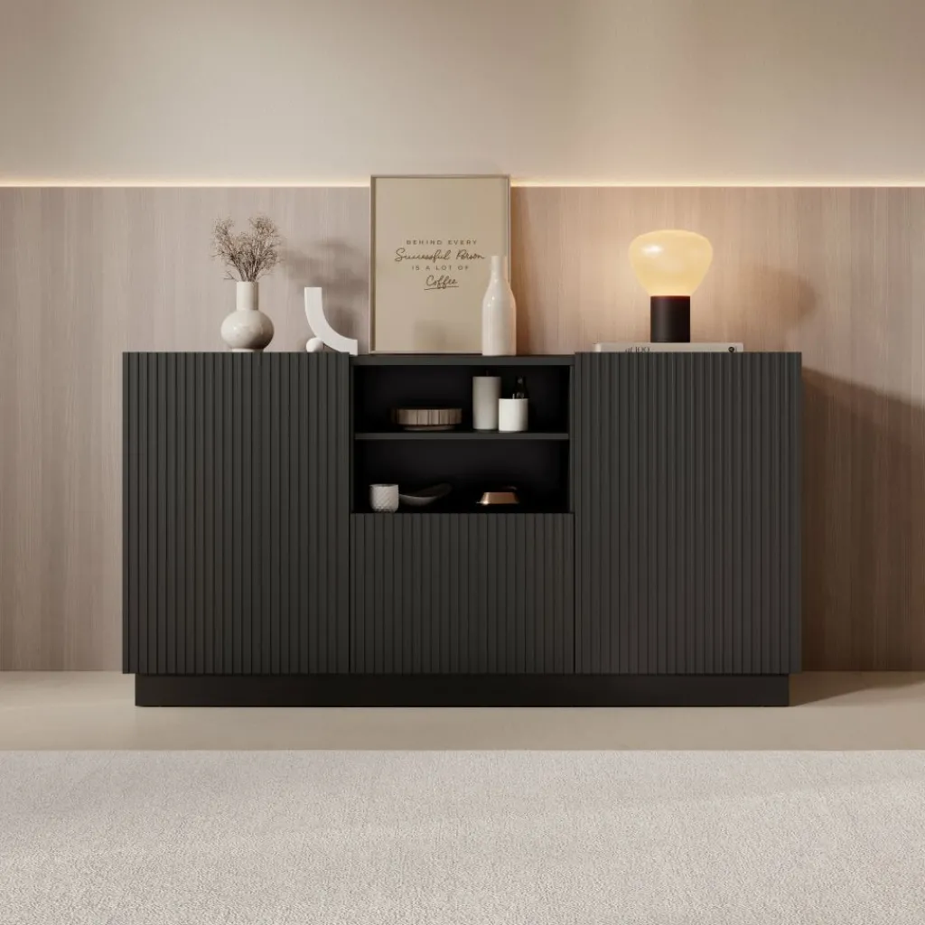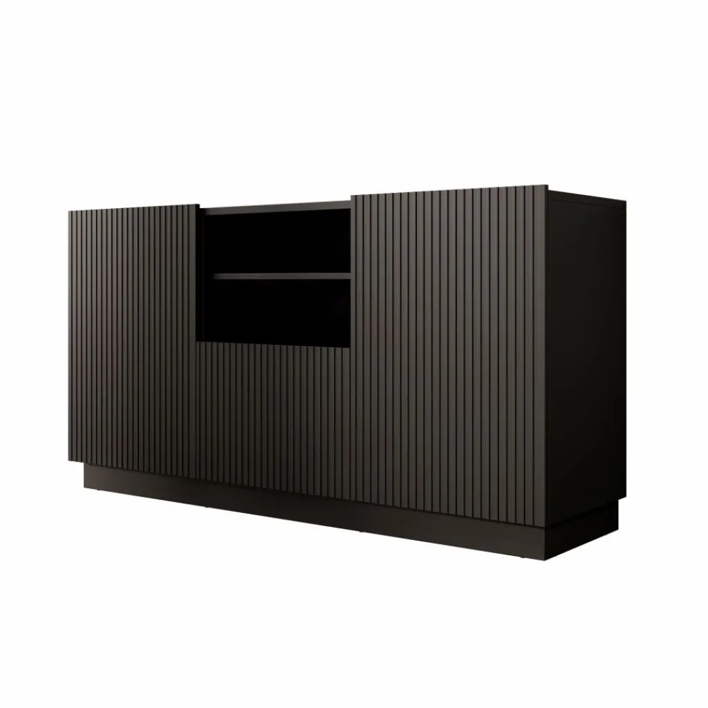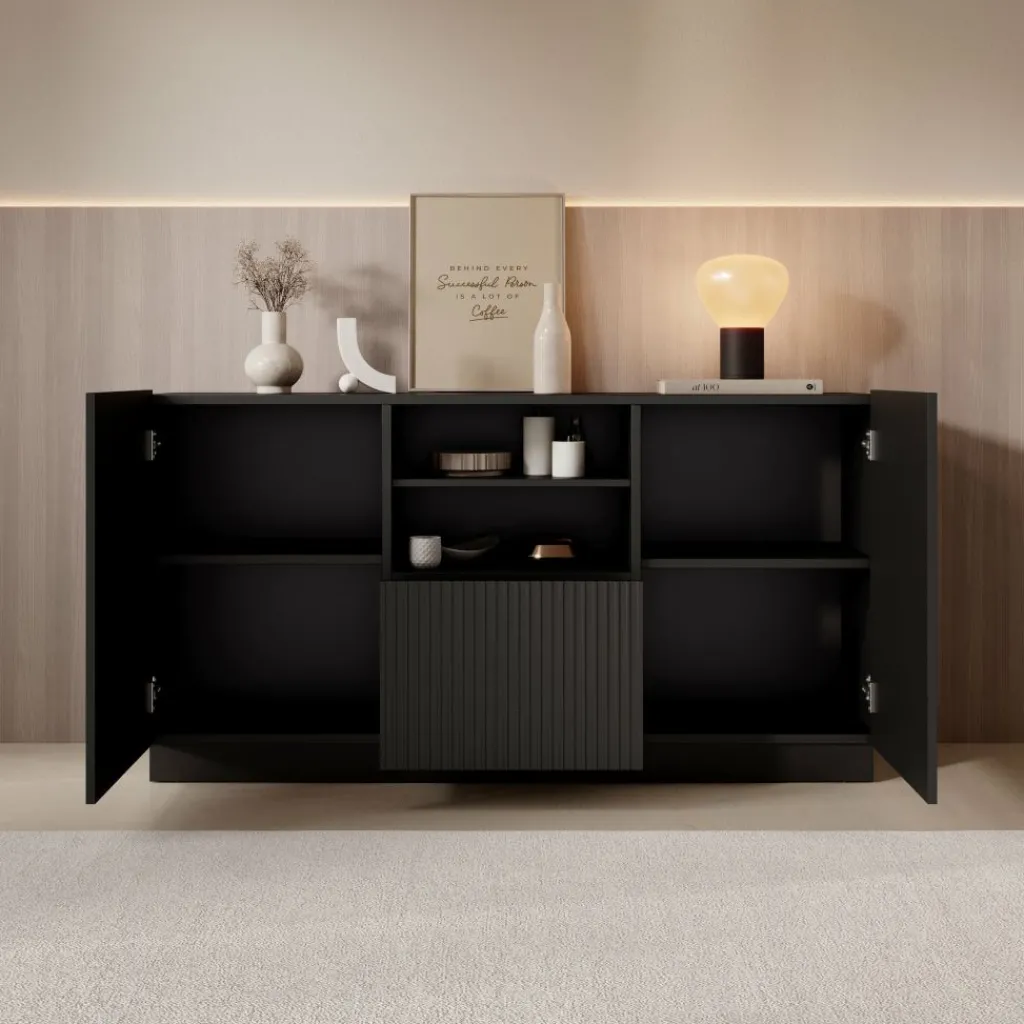 Het Lucera dressoir biedt praktische opbergruimte met een overzichtelijke indeling en een strak design. Met een breedte van 150 cm, een diepte van 42 cm en een hoogte van 78 cm is het meubel geschikt voor het opbergen van servies, woonaccessoires en andere spullen. Het bovenblad kan gebruikt worden voor decoratie zoals vazen, fotolijsten of een tafellamp.