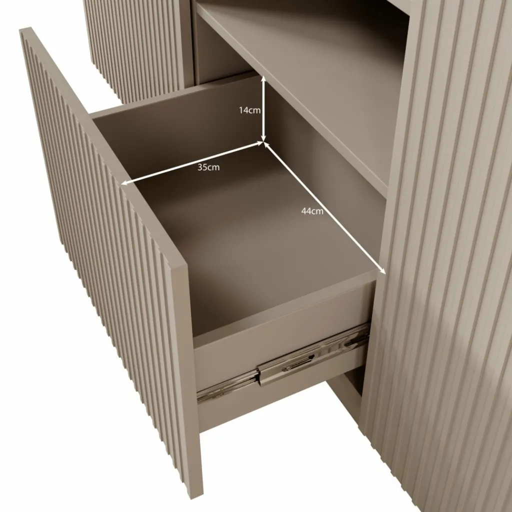 De behuizing is gemaakt van 16 mm gelamineerde plaat en de fronten zijn uitgevoerd in 18 mm gefreesd MDF met een verticale structuur. De achterwand is gemaakt van HDF en de randen zijn afgewerkt met ABS. Het meubel staat op een stabiele sokkel met glijders.