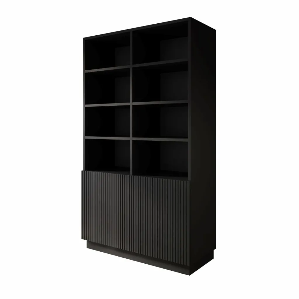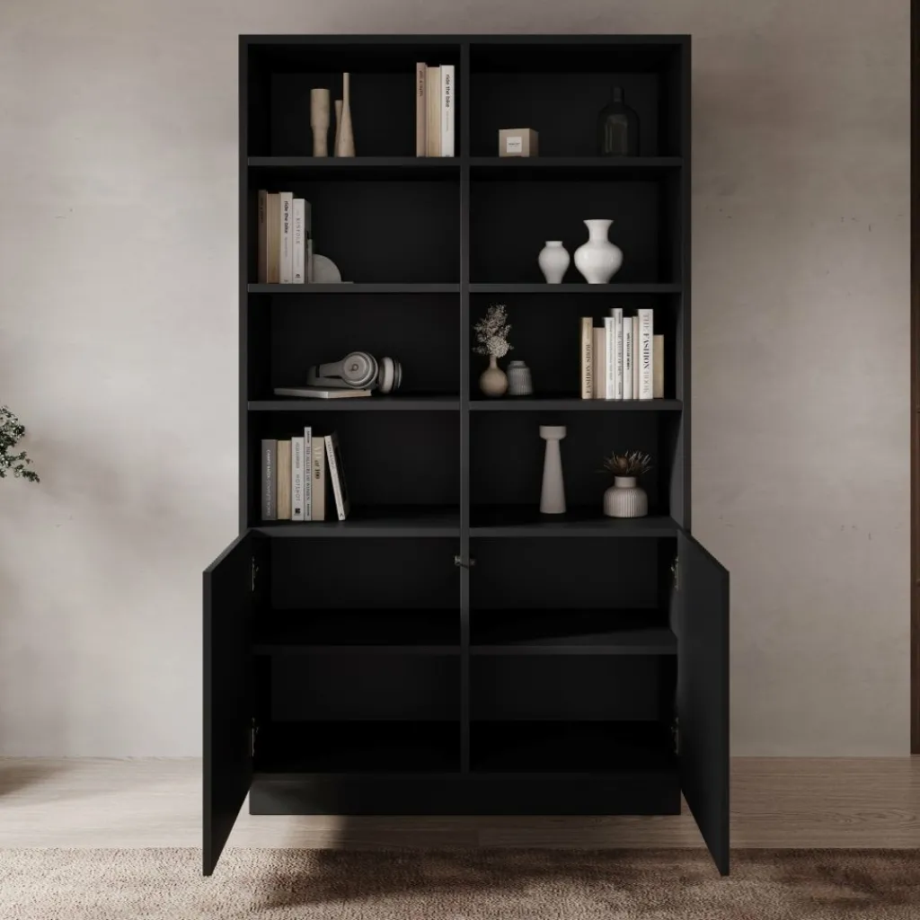 Het tv-meubel uit de Lucera serie in zwart is een ruim en strak vormgegeven meubel dat een stevige basis vormt onder je televisie. Met een breedte van 200 cm biedt het meubel veel ruimte voor een tv en verschillende media-apparaten. Achter de vier deuren bevinden zich opbergvakken met legplanken waarin je apparatuur, accessoires of andere spullen overzichtelijk kunt opbergen.