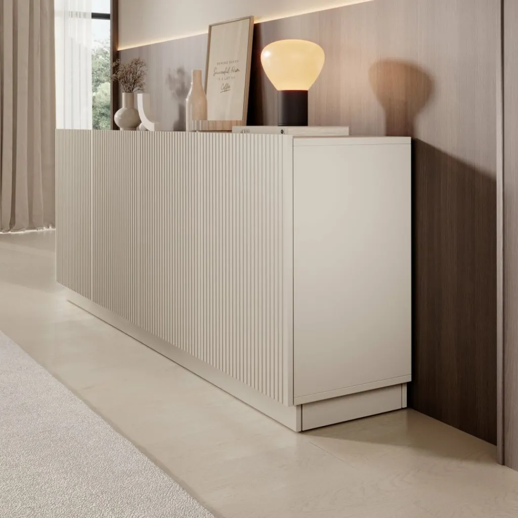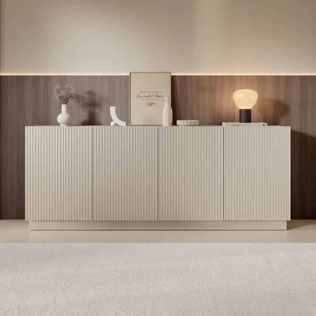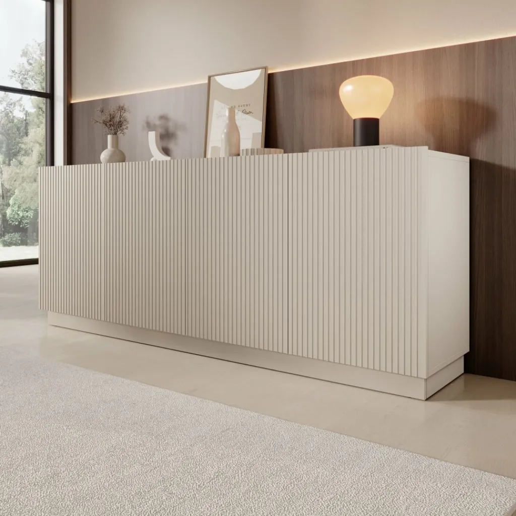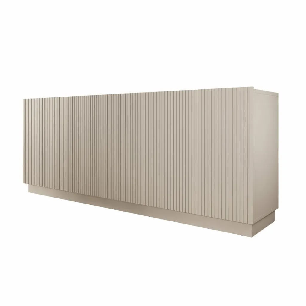Het Lucera dressoir in beige is een ruim opbergmeubel met een strak en modern ontwerp. Met een breedte van 200 cm biedt dit dressoir veel praktische opbergruimte voor servies, accessoires en andere woonitems. Achter de vier deuren bevinden zich meerdere compartimenten met legplanken, waardoor je spullen overzichtelijk kunt opbergen.