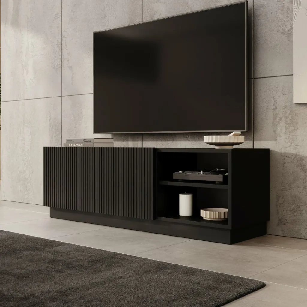 De fronten met verticale lijnen kunnen naar eigen keuze gemonteerd worden, zodat je zelf bepaalt aan welke zijde het gesloten gedeelte van het meubel zit. Dit maakt het meubel flexibel in gebruik en eenvoudig aan te passen aan de indeling van je woonkamer.