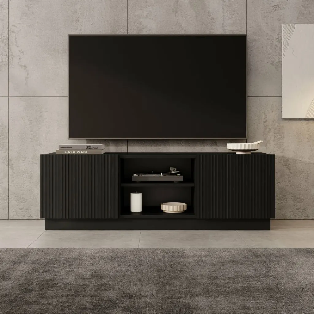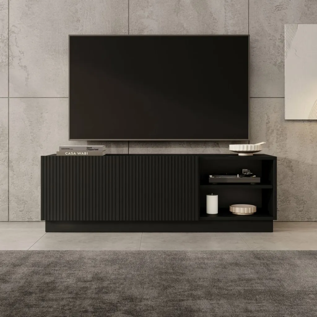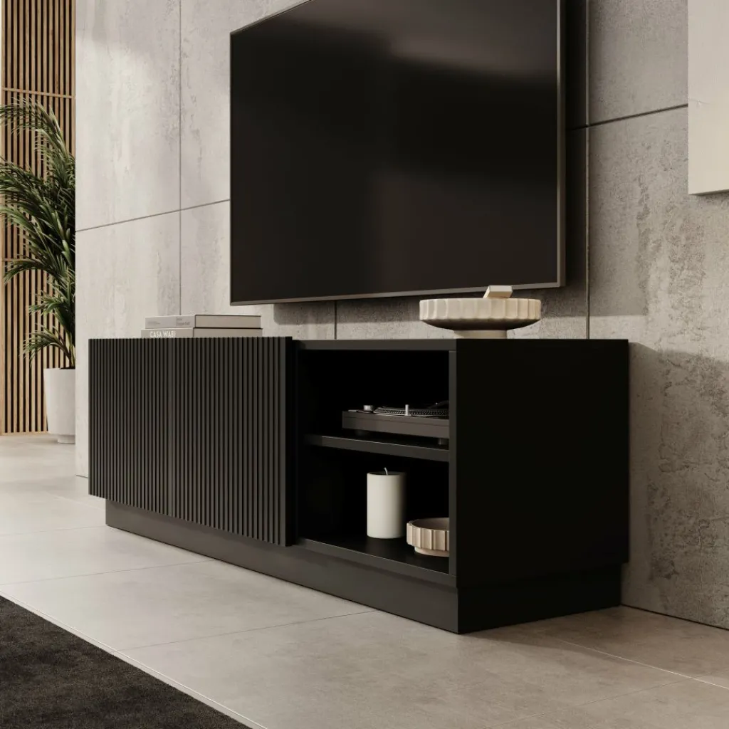 Het Lucera tv-meubel in zwart is een laag en strak vormgegeven meubel dat een stevige basis vormt onder je televisie. Met een breedte van 150 cm is er voldoende ruimte voor een tv en verschillende media-apparaten. Achter de twee deuren bevinden zich opbergvakken met legplanken, terwijl het open vak geschikt is voor apparatuur zoals een decoder, spelconsole of mediaspeler.