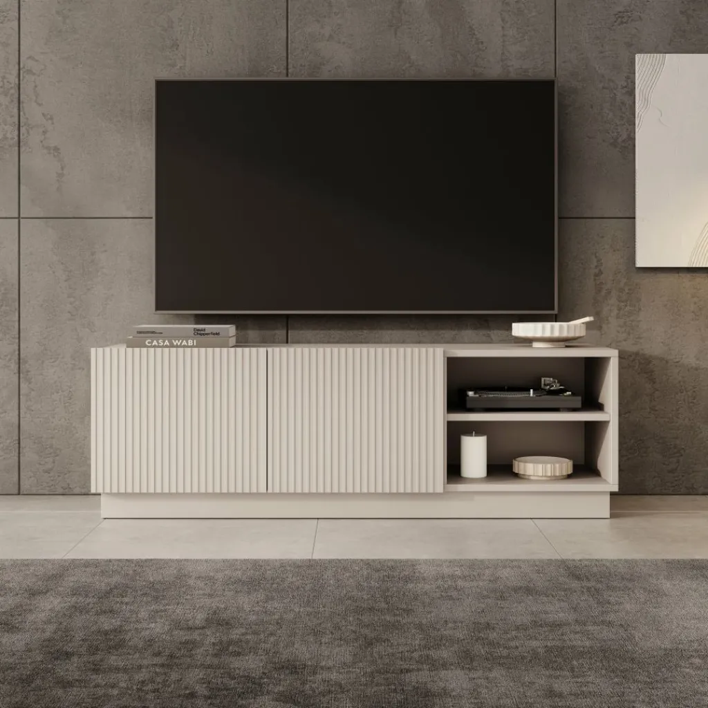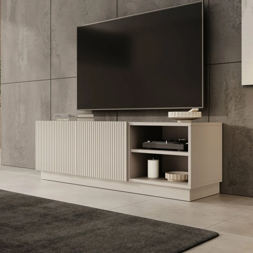 De fronten met verticale lijnen kunnen naar eigen keuze gemonteerd worden, zodat je zelf bepaalt aan welke zijde het gesloten gedeelte van het meubel zit. Dit maakt het meubel flexibel in gebruik en eenvoudig aan te passen aan de indeling van je woonkamer.
