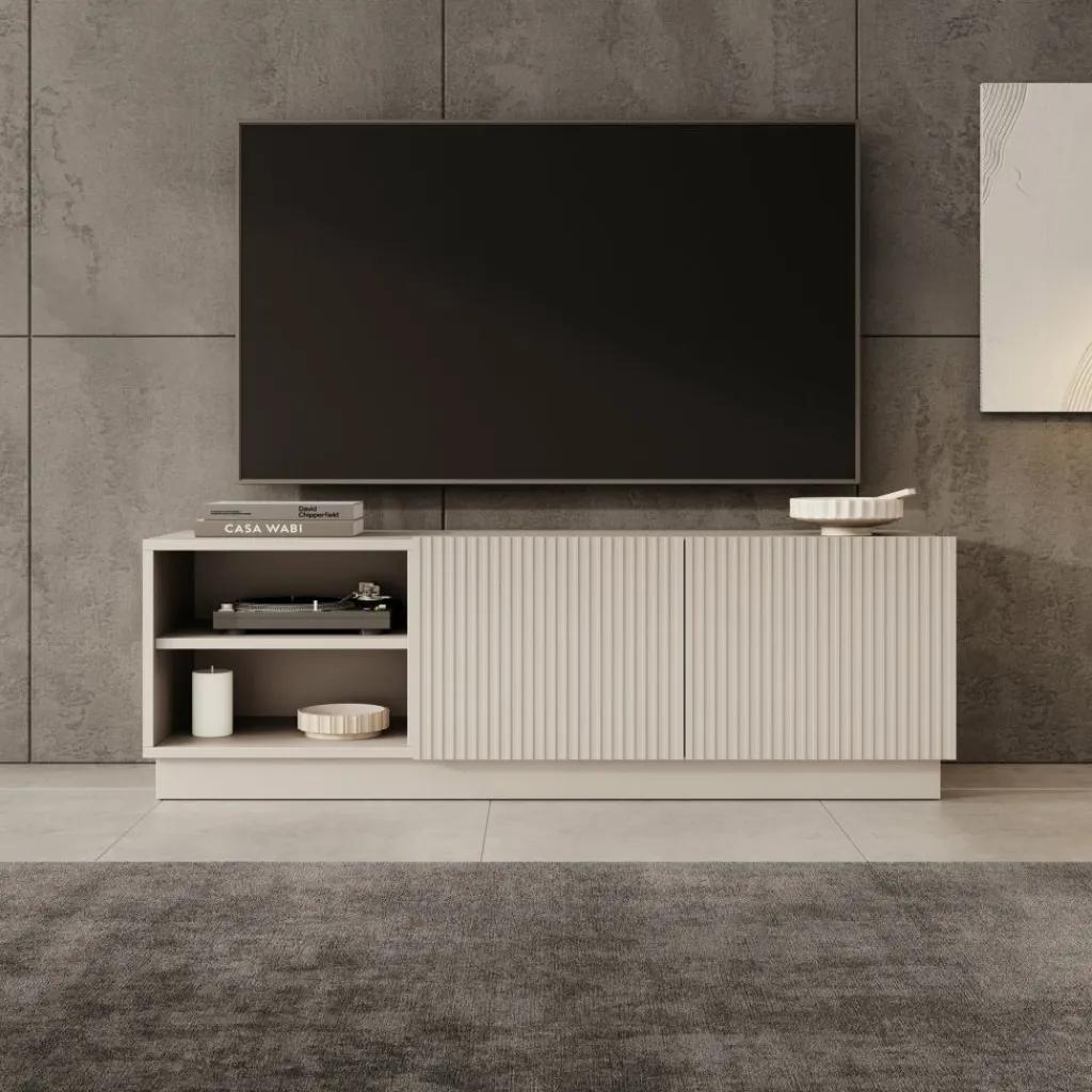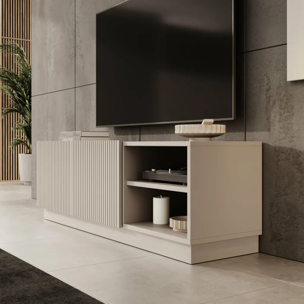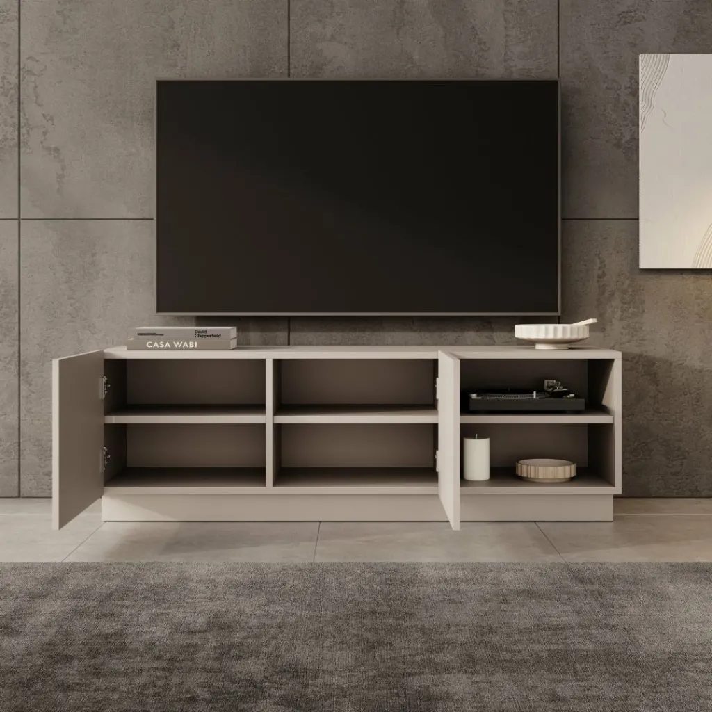 Het Lucera tv-meubel in beige is een laag en strak vormgegeven meubel dat een stevige basis vormt onder je televisie. Met een breedte van 150 cm is er voldoende ruimte voor een tv en verschillende media-apparaten. Achter de twee deuren bevinden zich opbergvakken met legplanken, terwijl het open vak geschikt is voor apparatuur zoals een decoder, spelconsole of mediaspeler.
