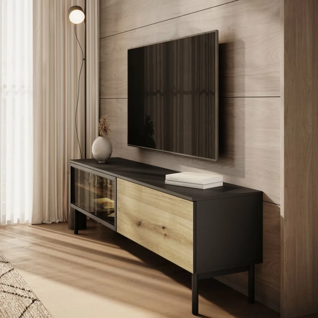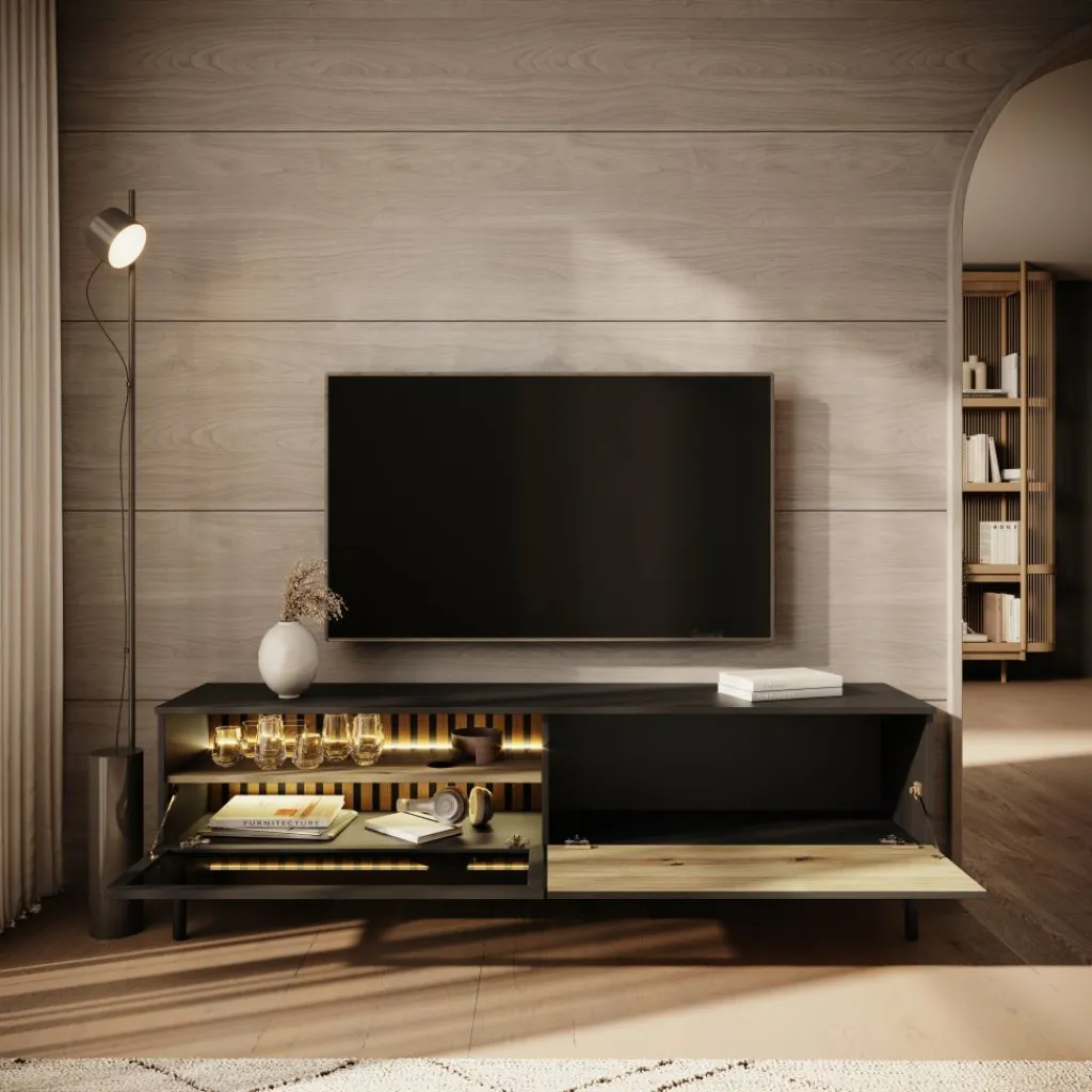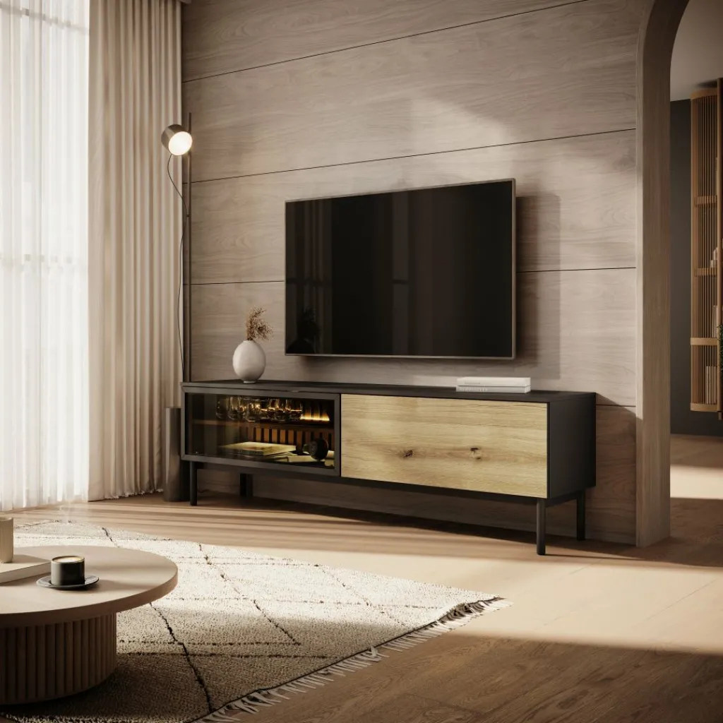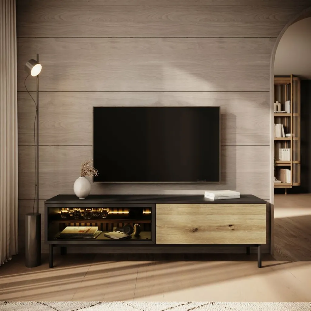 TV-meubel Ludwig is een opbergkast voor onder de tv in een moderne, industriële stijl. De TV-kast heeft 2 kleppen waarvan de linker uit glas bestaat. Achter het glas zit een legplank met LED-verlichting. De kleppen openen met het push to open systeem. Ten slotte staat het meubel op houten poten.