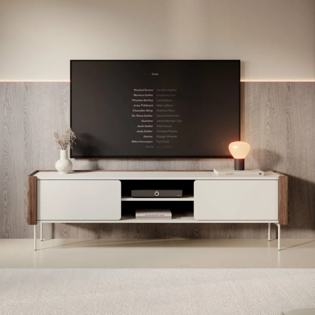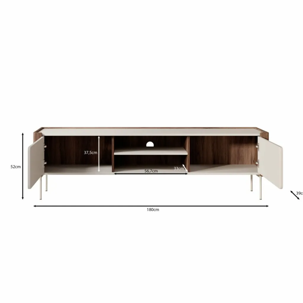 TV-Meubel Lux is een opbergkast voor onder de tv en staat op metalen poten. De TV-kast is gemaakt in een beige met eiken kleur. TV-Meubel Lux beschikt over 2 deuren waarachter in totaal 2 opbergvakken zitten. Deze deuren openen met het push to open systeem. Ook heeft het meubel nog 2 open vakken. Hier zit in de achterwand 1 uitsparing om bedrading te kunnen wegwerken.