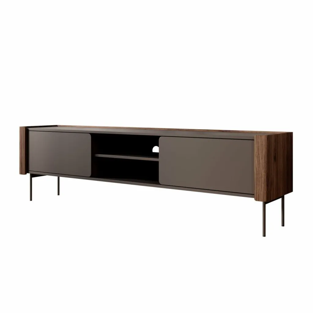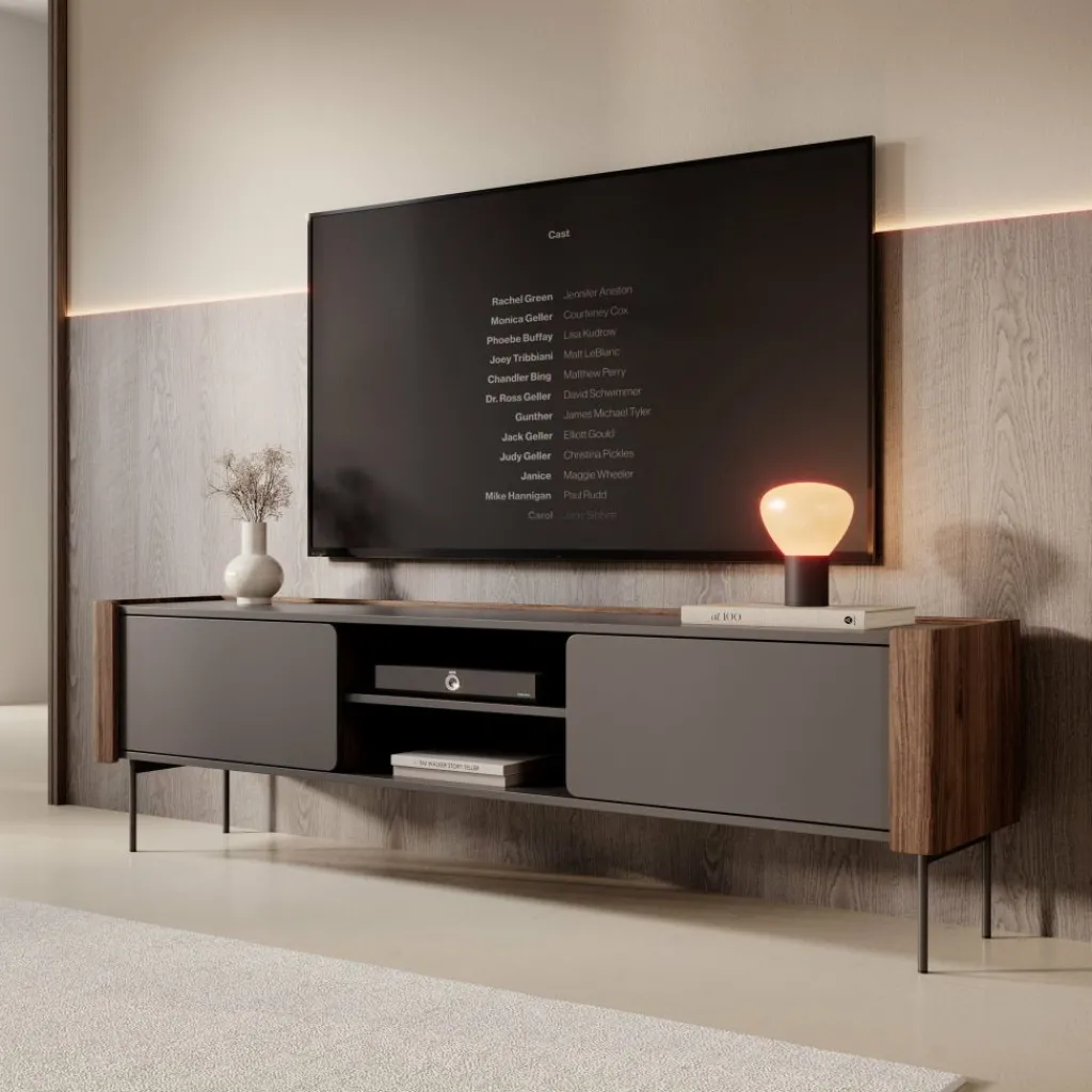 Het Lux tv-meubel combineert een matzwart front met warme houtaccenten aan de zijkanten. De afgeronde hoeken en strakke lijnen zorgen voor een rustige, moderne uitstraling die goed past in eigentijdse woonkamers. Dankzij de slanke metalen poten oogt het meubel licht en blijft de ruimte eromheen makkelijk toegankelijk.