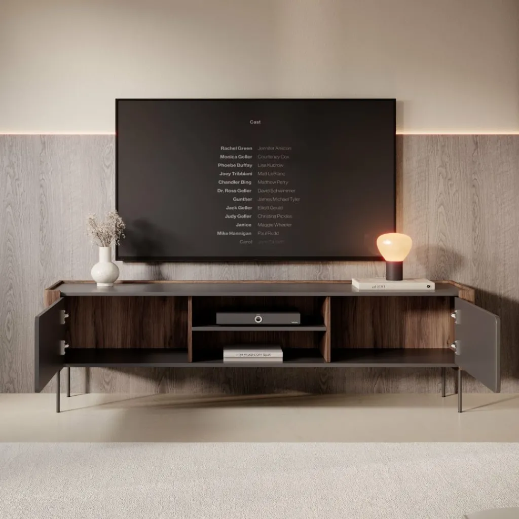 Het meubel beschikt over twee deuren aan de zijkanten en open vakken in het midden. Hierdoor heb je voldoende plek voor apparatuur, media-accessoires en decoratie. De brede legplanken achter de deuren bieden extra opbergruimte voor items die je uit het zicht wilt houden.