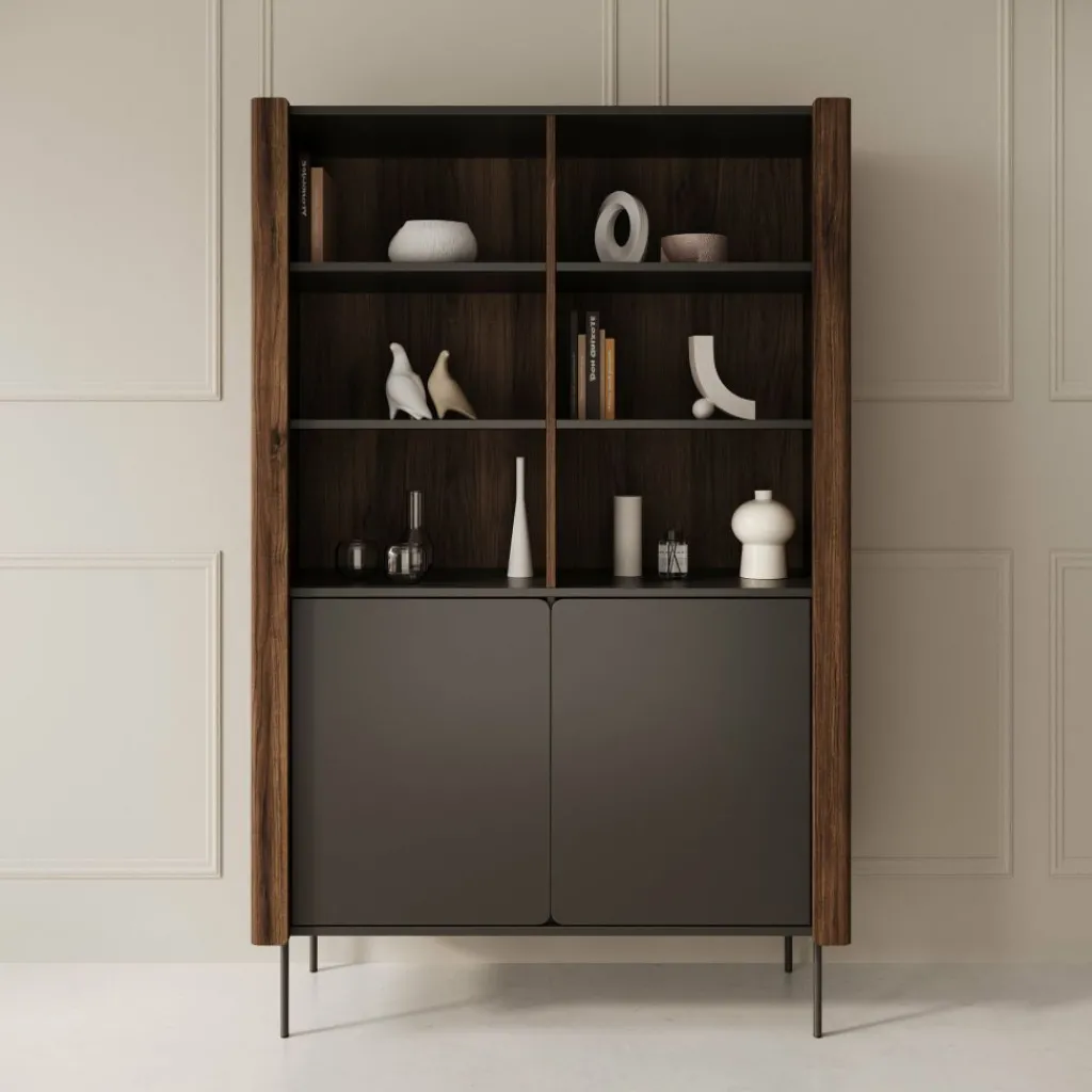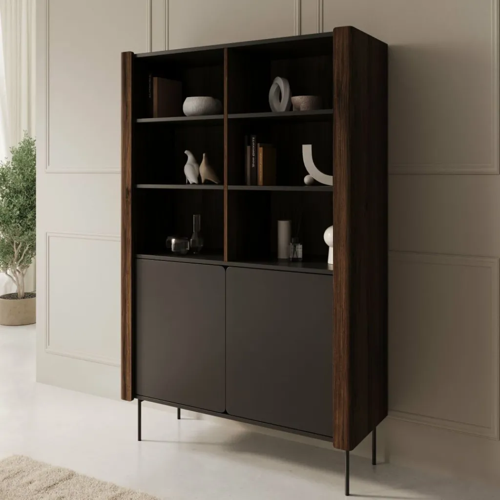 De Lux boekenkast is uitgevoerd in een matzwarte kleur en combineert open schappen met een gesloten onderkast. Hierdoor kun je zowel decoratieve items als spullen die je liever uit het zicht houdt netjes opbergen. De zijkanten hebben een warme houtstructuur, wat zorgt voor een duidelijk contrast met het zwarte front.