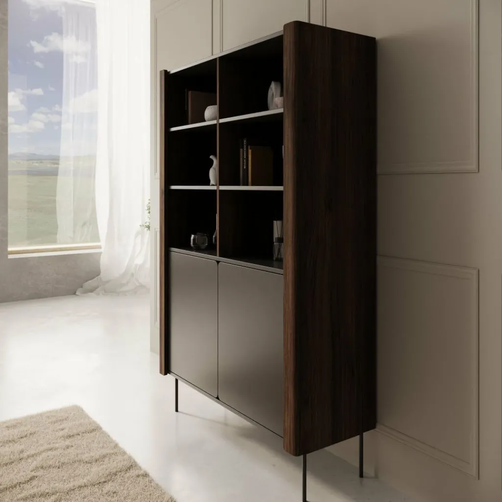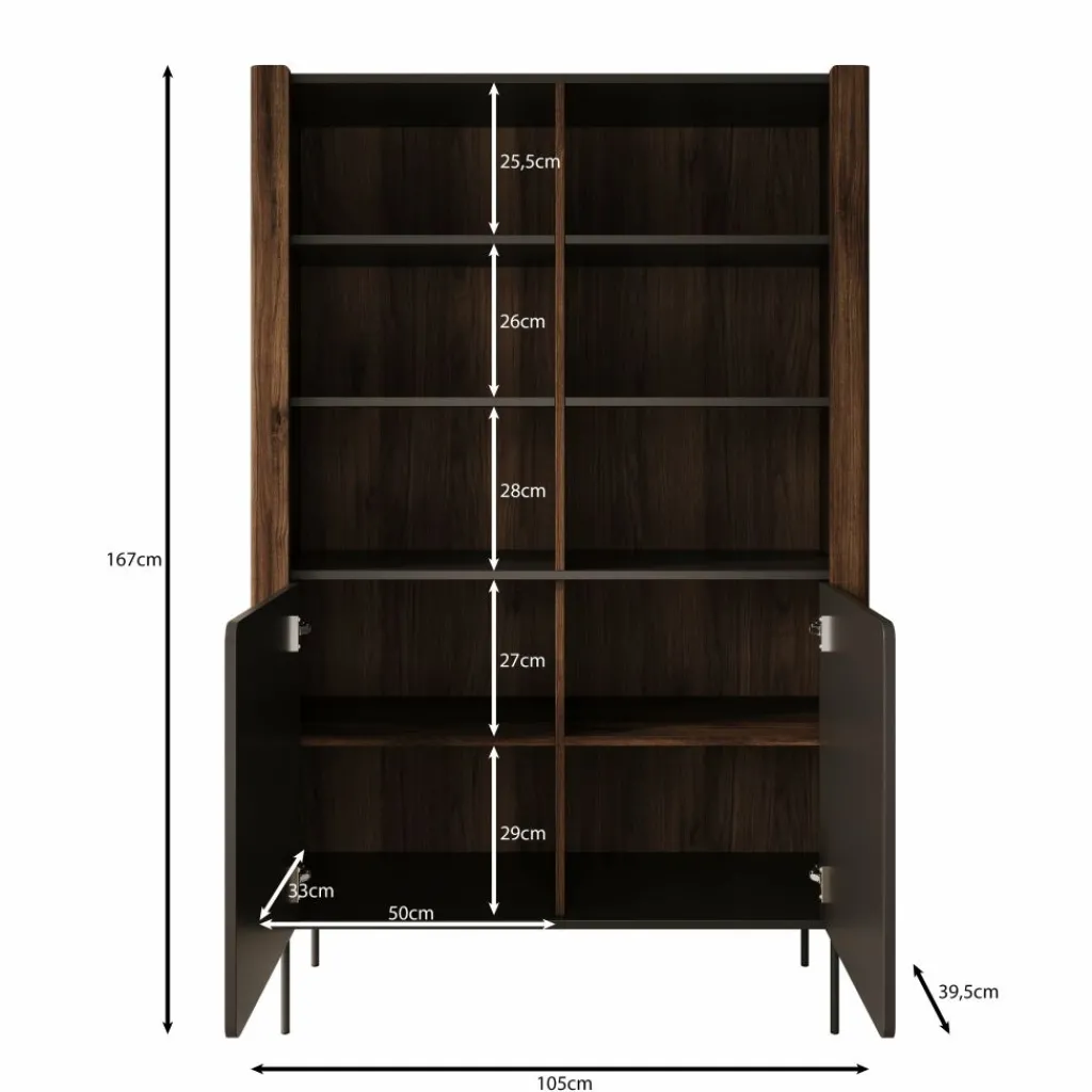 De open vakken bovenin zijn verdeeld in meerdere compartimenten, geschikt voor boeken, accessoires en decoratie. In het onderste gedeelte vind je twee deuren met daarachter extra opbergruimte voor items die je overzichtelijk wilt opbergen. De slanke metalen poten geven de kast een lichte en moderne uitstraling.