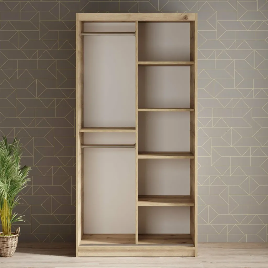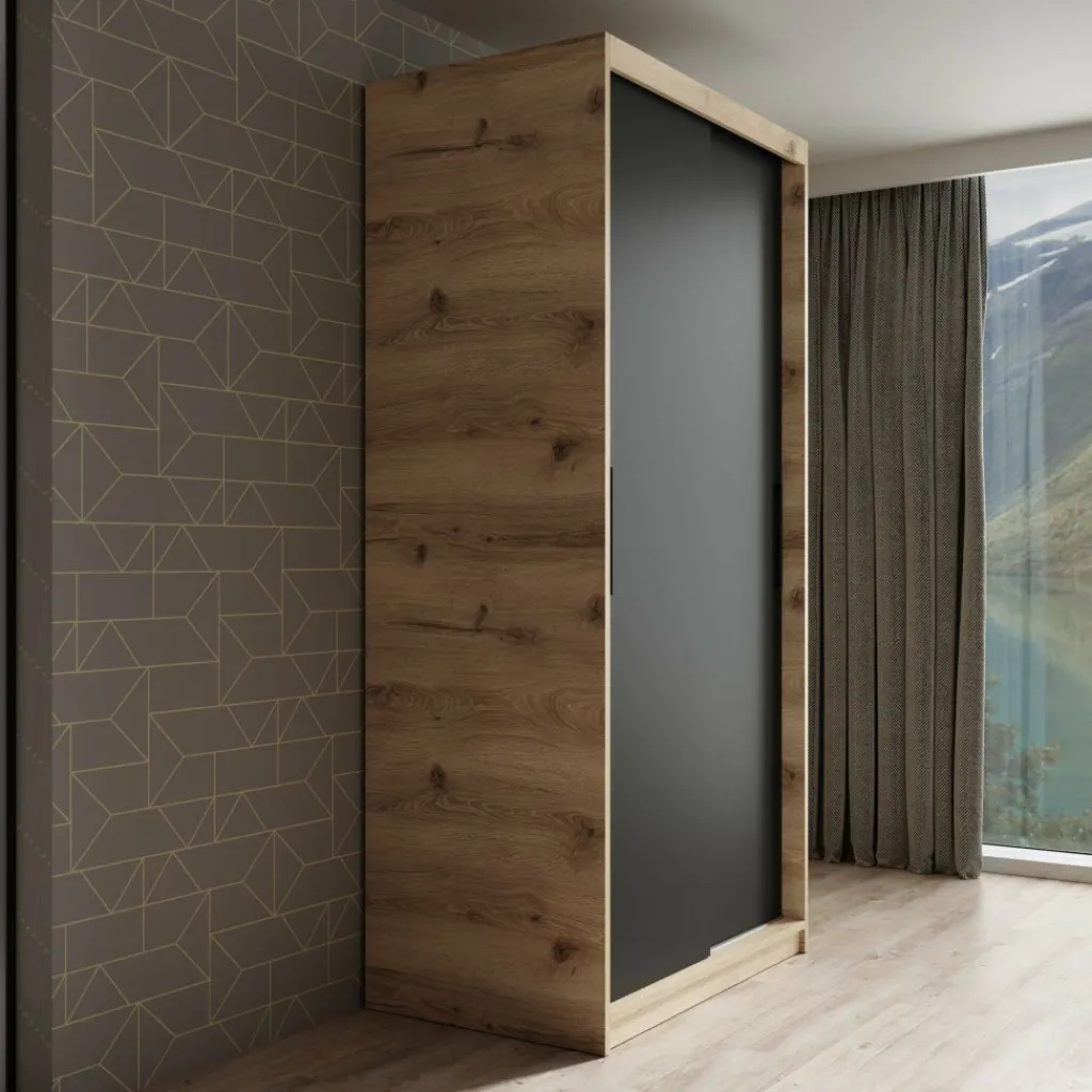 Garderobekast Luxor is een moderne kast met mat zwarte deuren en een eiken kleurige ombouw. De kledingkast heeft twee schuifdeuren die te bedienen zijn met stevige handgrepen. In de binnenkant vind je 5 opbergvakken en 2 stangen om kleding aan op te hangen.