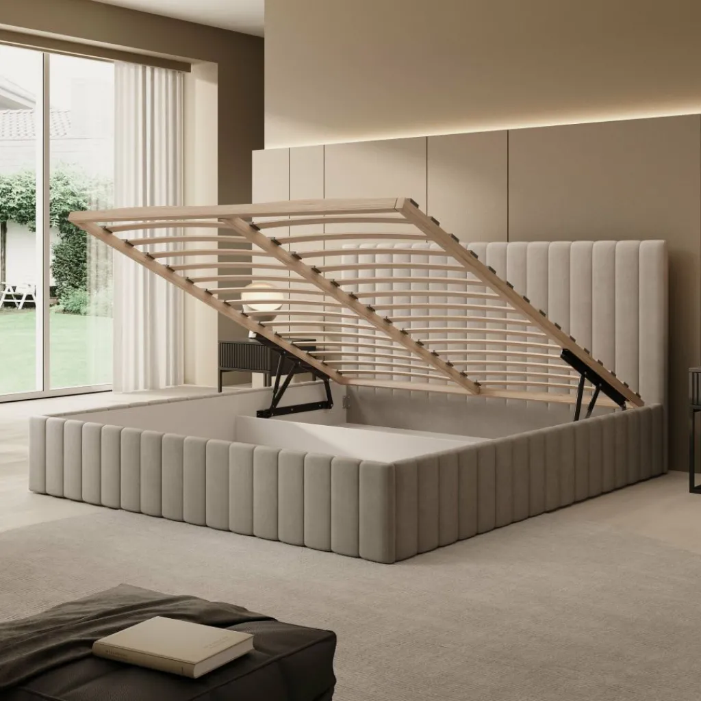 Het Luz bed van 180×200 cm is voorzien van een geïntegreerde opbergruimte onder het matrasgedeelte, bereikbaar via een opklapmechanisme. Dit biedt een groot en praktisch opbergvak voor het bewaren van bijvoorbeeld beddengoed of seizoensartikelen. Het bed is afgewerkt in beige velvet en heeft een hoofdbord met verticale banen.