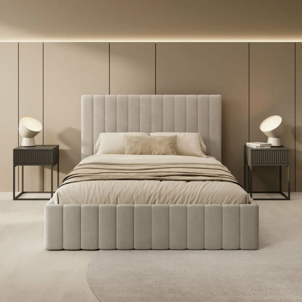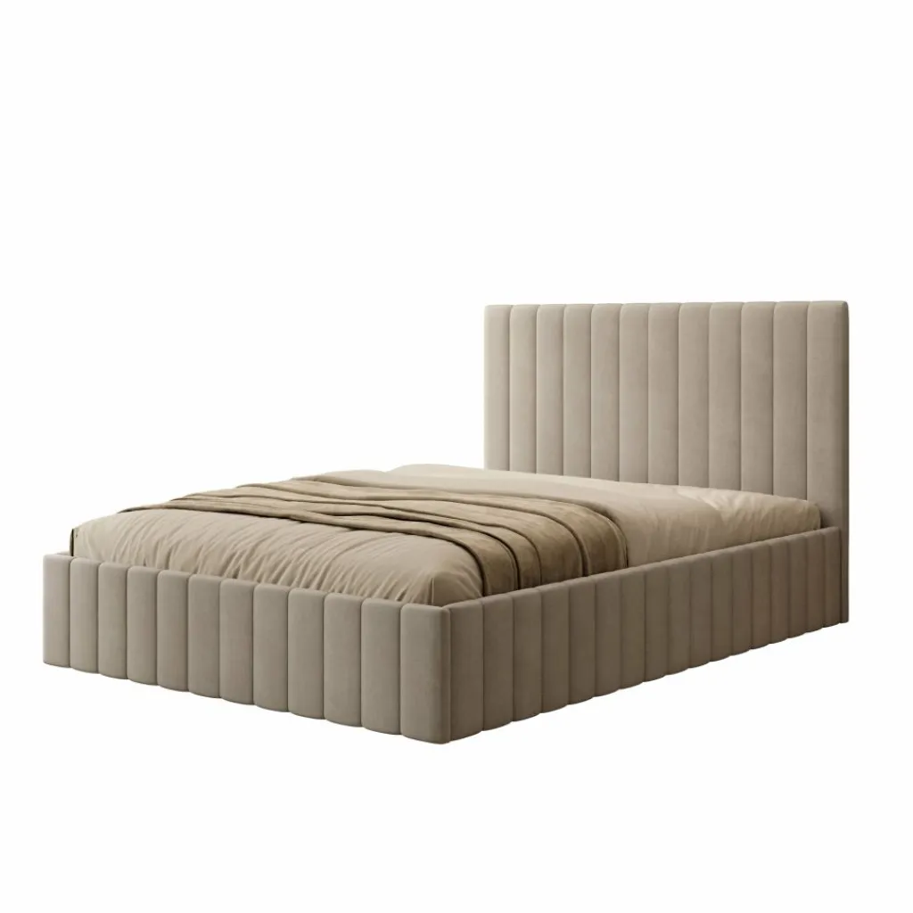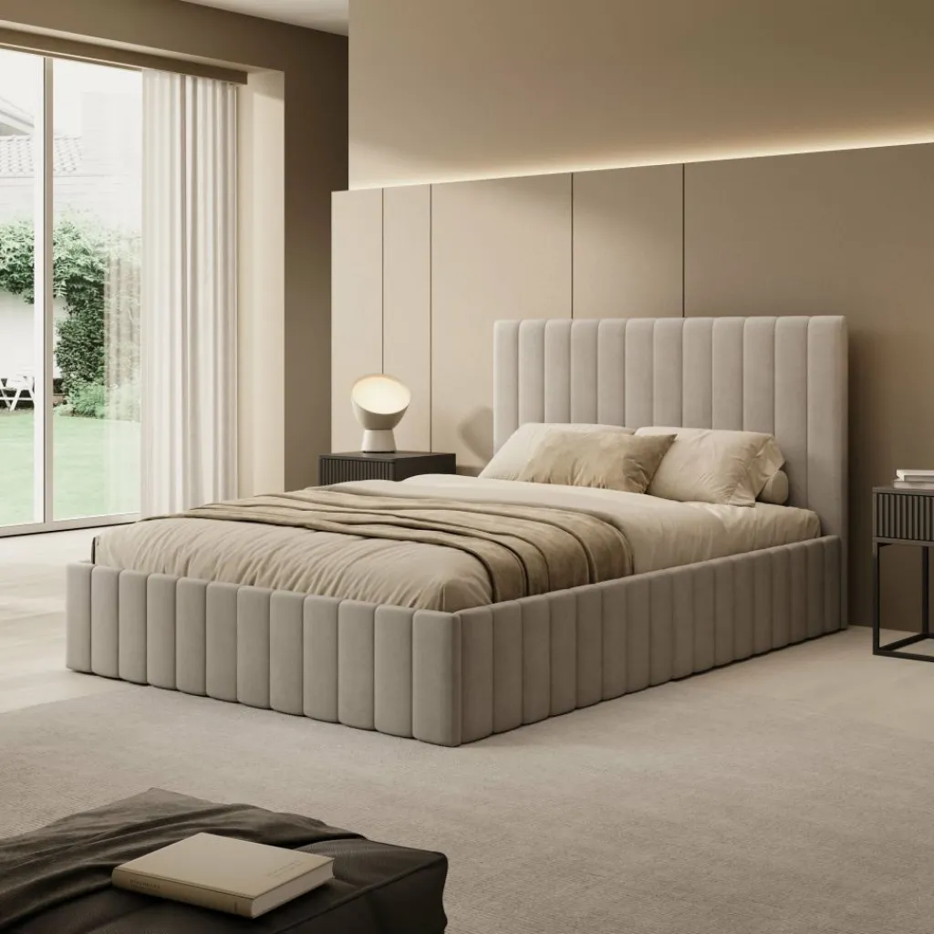 Het Luz bed biedt een combinatie van slaapcomfort en praktische opbergruimte. Het bed is uitgevoerd in beige velvet en heeft een recht en strak hoofdbord. Dankzij het liftmechanisme onder de lattenbodem ontstaat een ruime opbergbak, geschikt voor het opbergen van dekens, kussens of seizoensspullen.