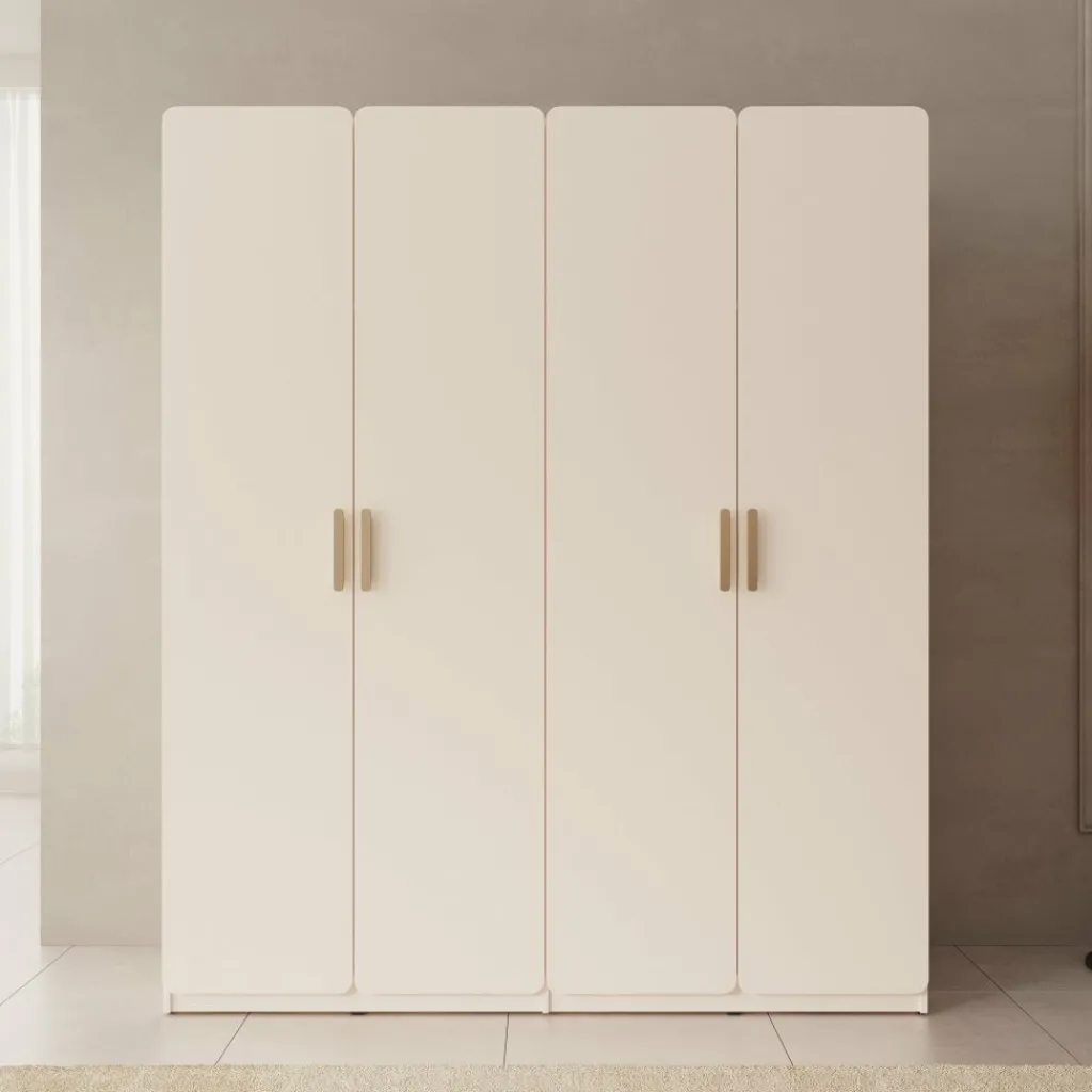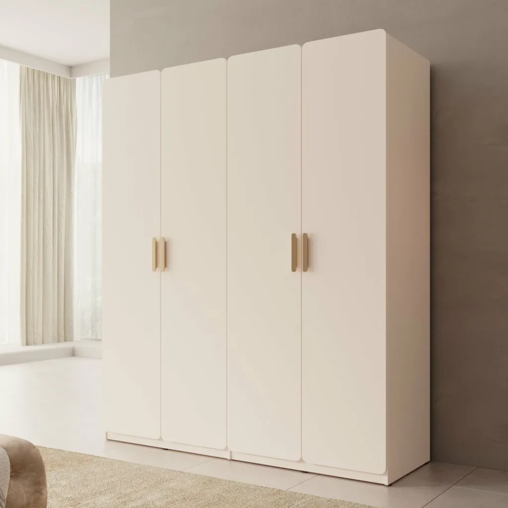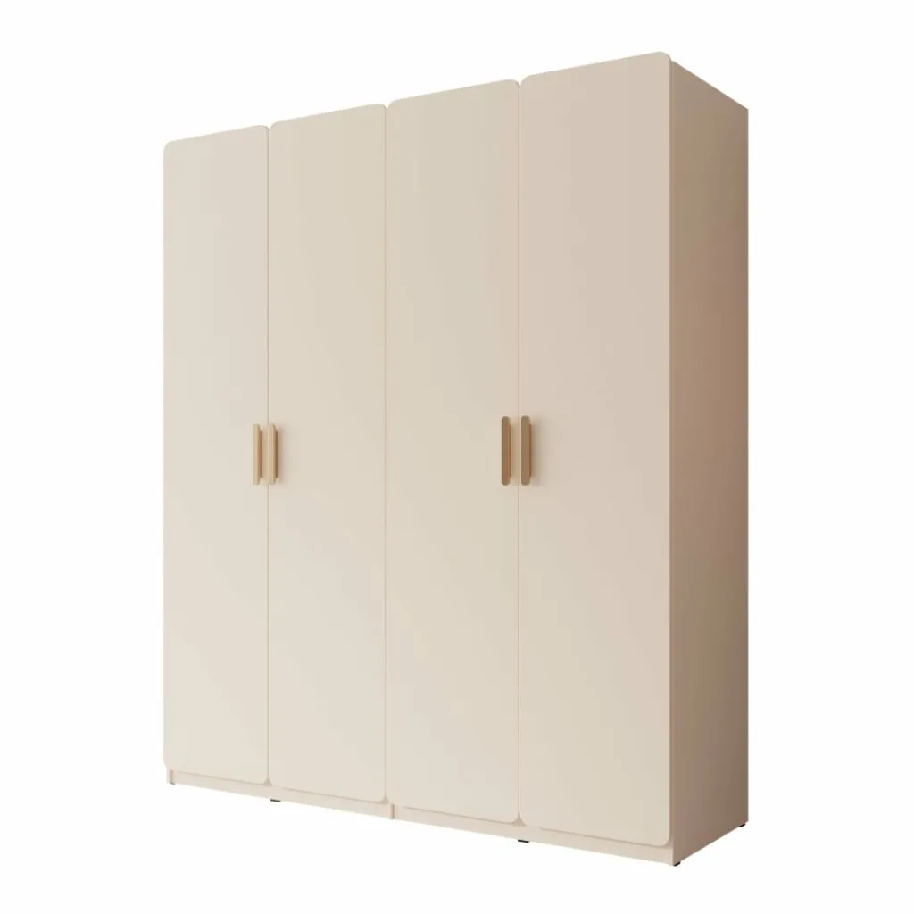 De Luzon kledingkast met 4 deuren in beige is een ruime en stijlvolle oplossing voor al je kleding en accessoires. Het rustige design met afgeronde hoeken en elegante handgrepen geeft de kast een moderne en zachte uitstraling, waardoor deze moeiteloos in verschillende slaapkamerstijlen past.