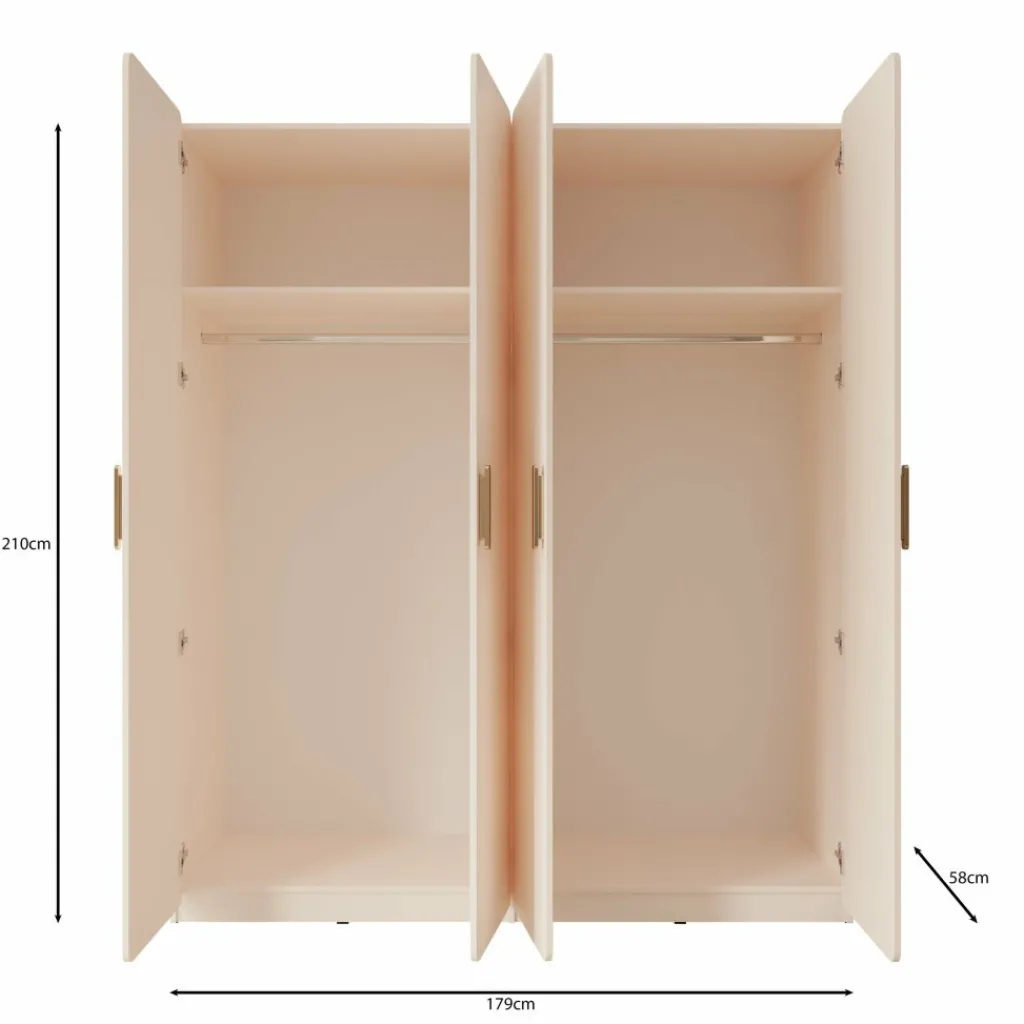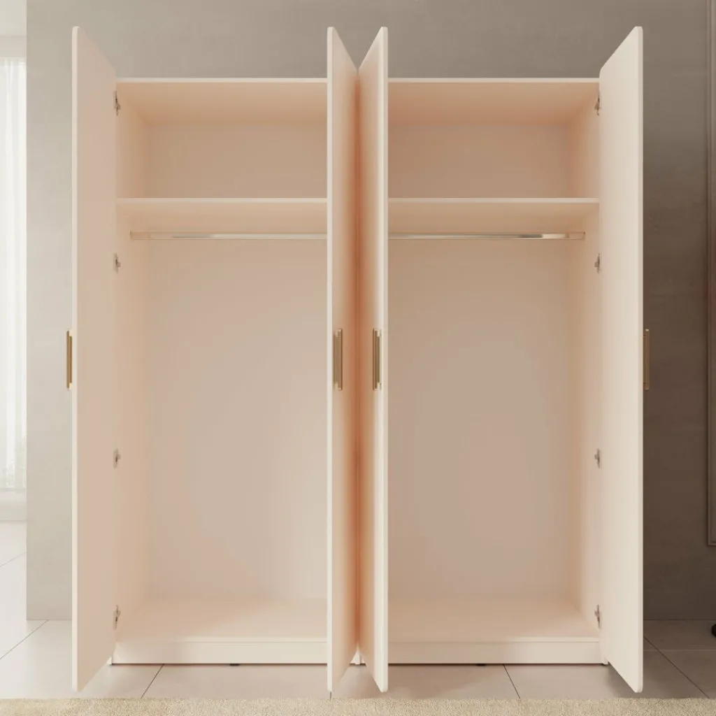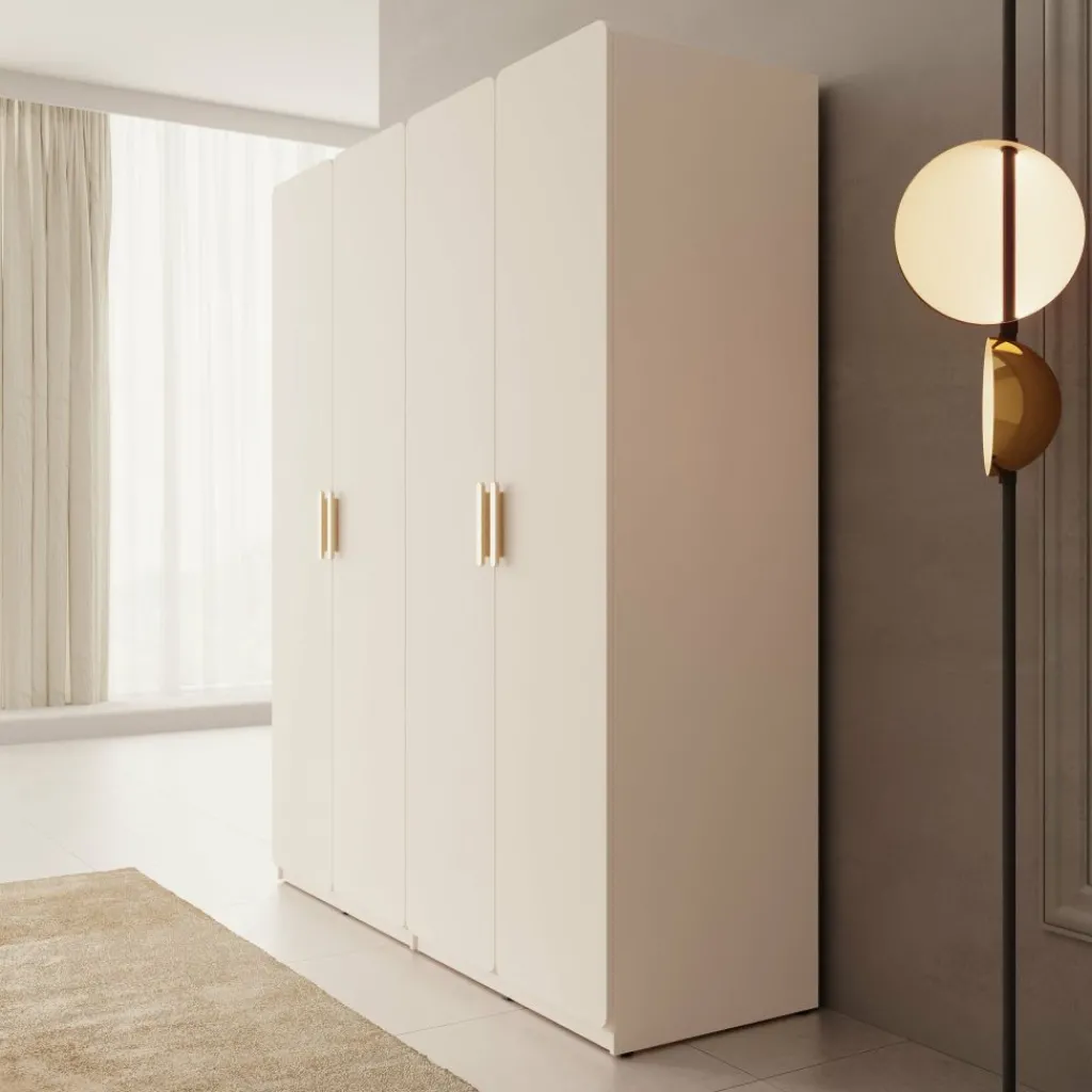 De Luzon kledingkast met 4 deuren in beige is een ruime en stijlvolle oplossing voor al je kleding en accessoires. Het rustige design met afgeronde hoeken en elegante handgrepen geeft de kast een moderne en zachte uitstraling, waardoor deze moeiteloos in verschillende slaapkamerstijlen past.