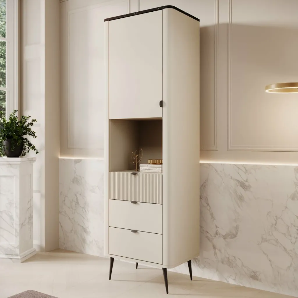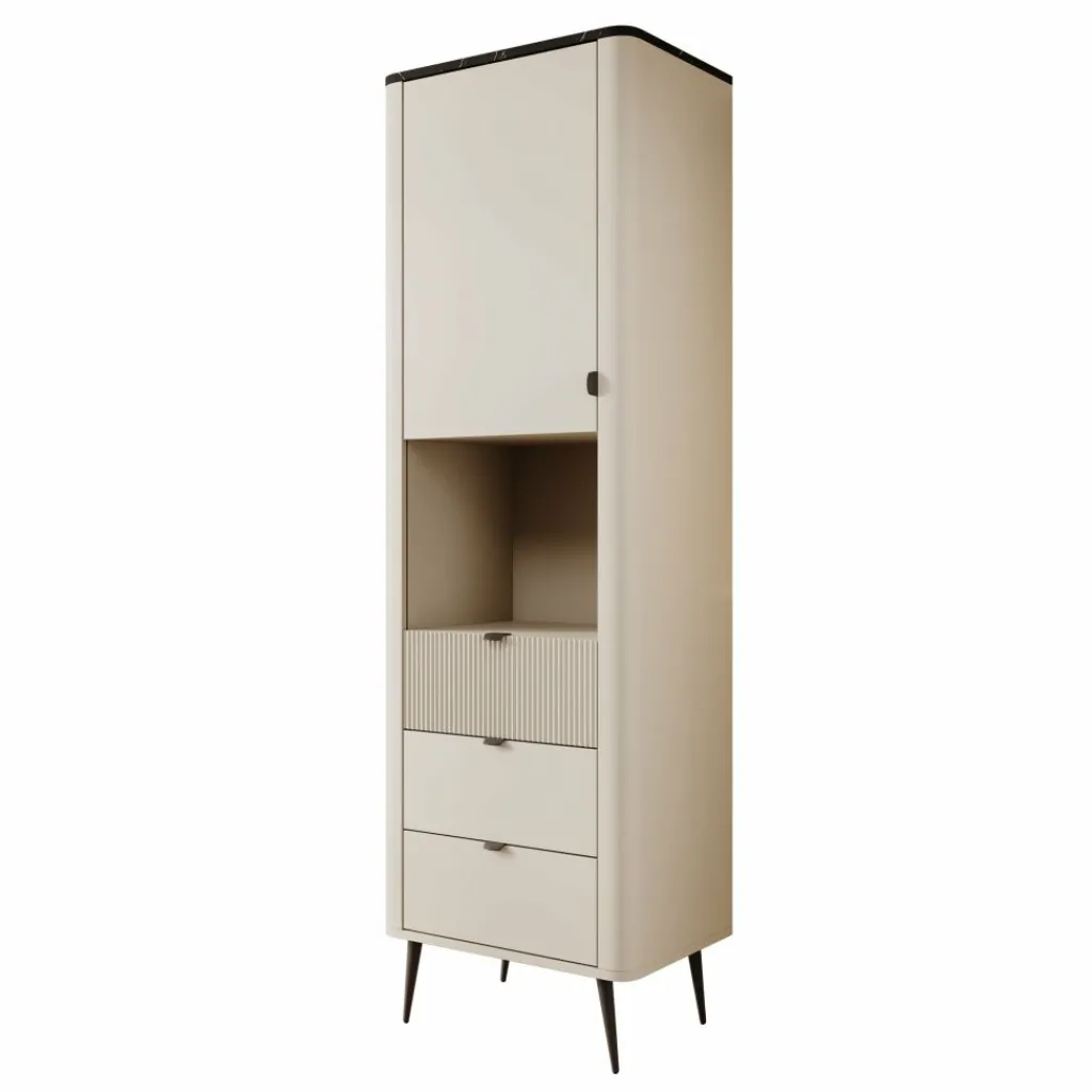 De Mace vitrinekast is een hoge opbergkast met een combinatie van gesloten en open opbergruimte. De kast is uitgevoerd in beige met zwart frame.
