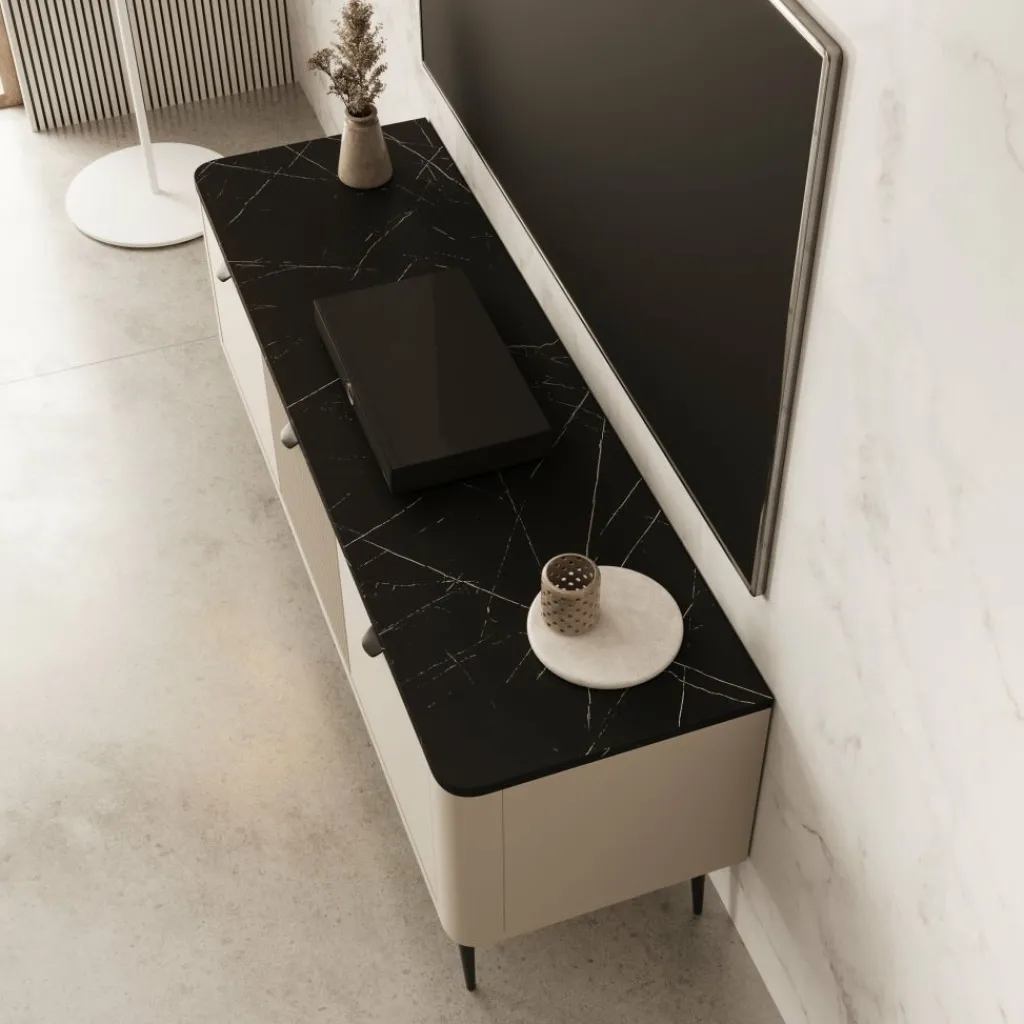 Het meubel staat op slanke, zwarte poten en heeft afgeronde hoeken aan de zijkanten. De middenklep is voorzien van een verticaal lattenfront voor een subtiel accent. De hoogte is 52 cm; dankzij de vrije ruimte onder het meubel is schoonmaken eenvoudig.