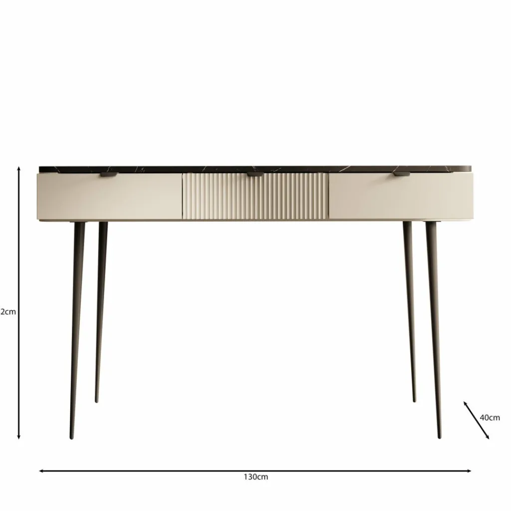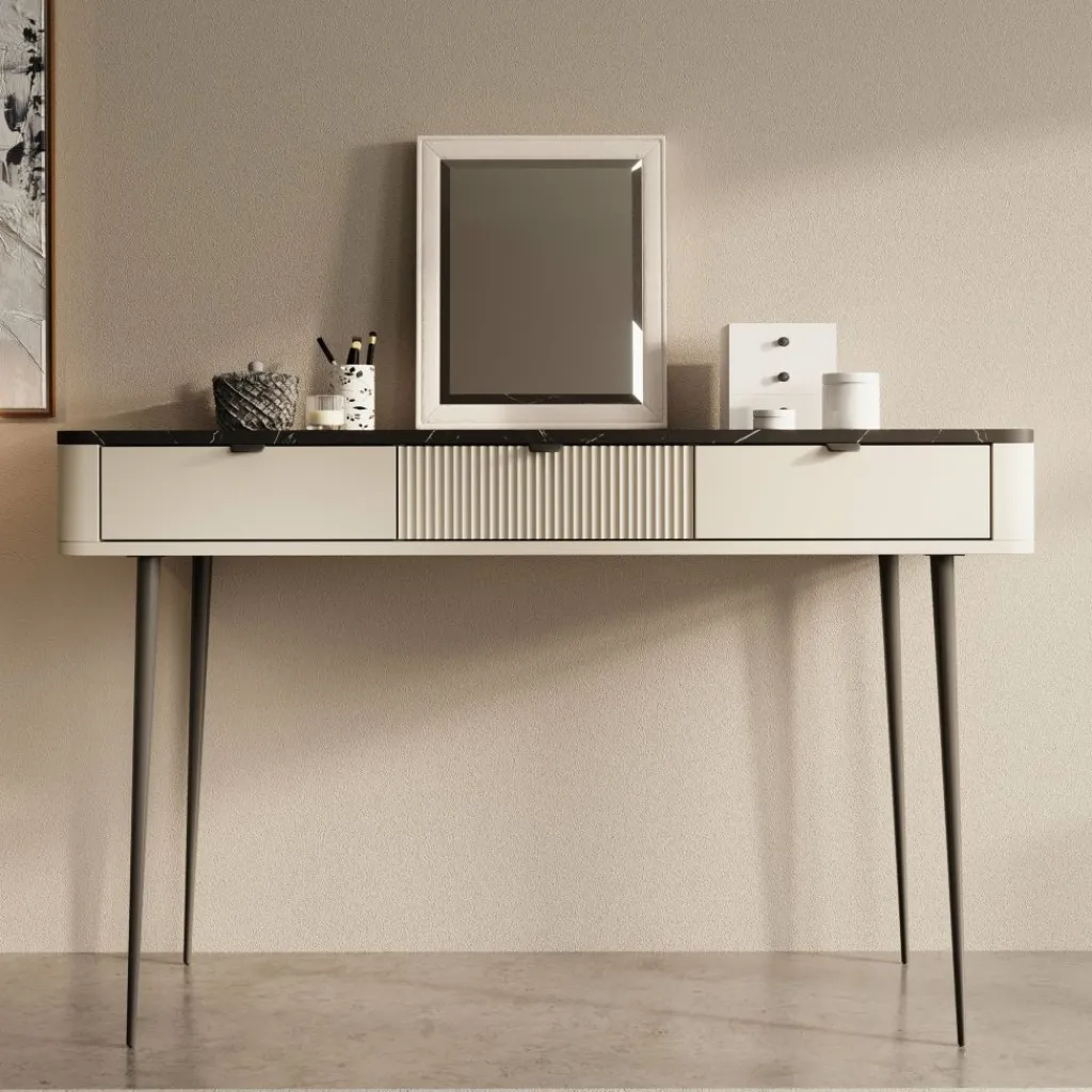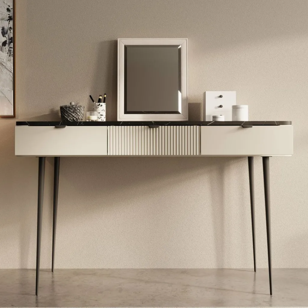 De kaptafel beschikt over drie lades in beige, elk voorzien van strakke zwarte handgrepen. De middelste lade is extra verfijnd met een verticaal lattenpatroon, dat zorgt voor een subtiel en exclusief detail. Ideaal voor het netjes opbergen van make-up, sieraden of dagelijkse benodigdheden.