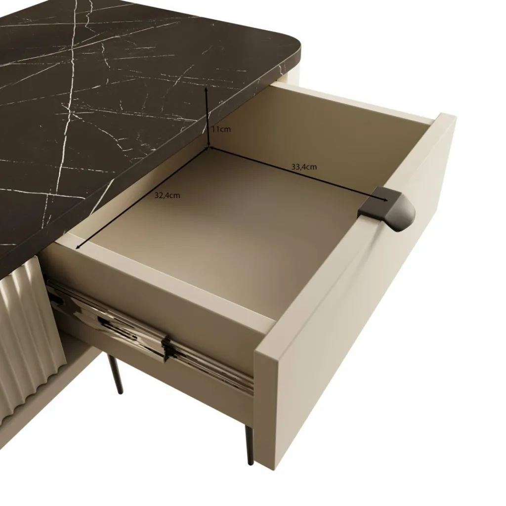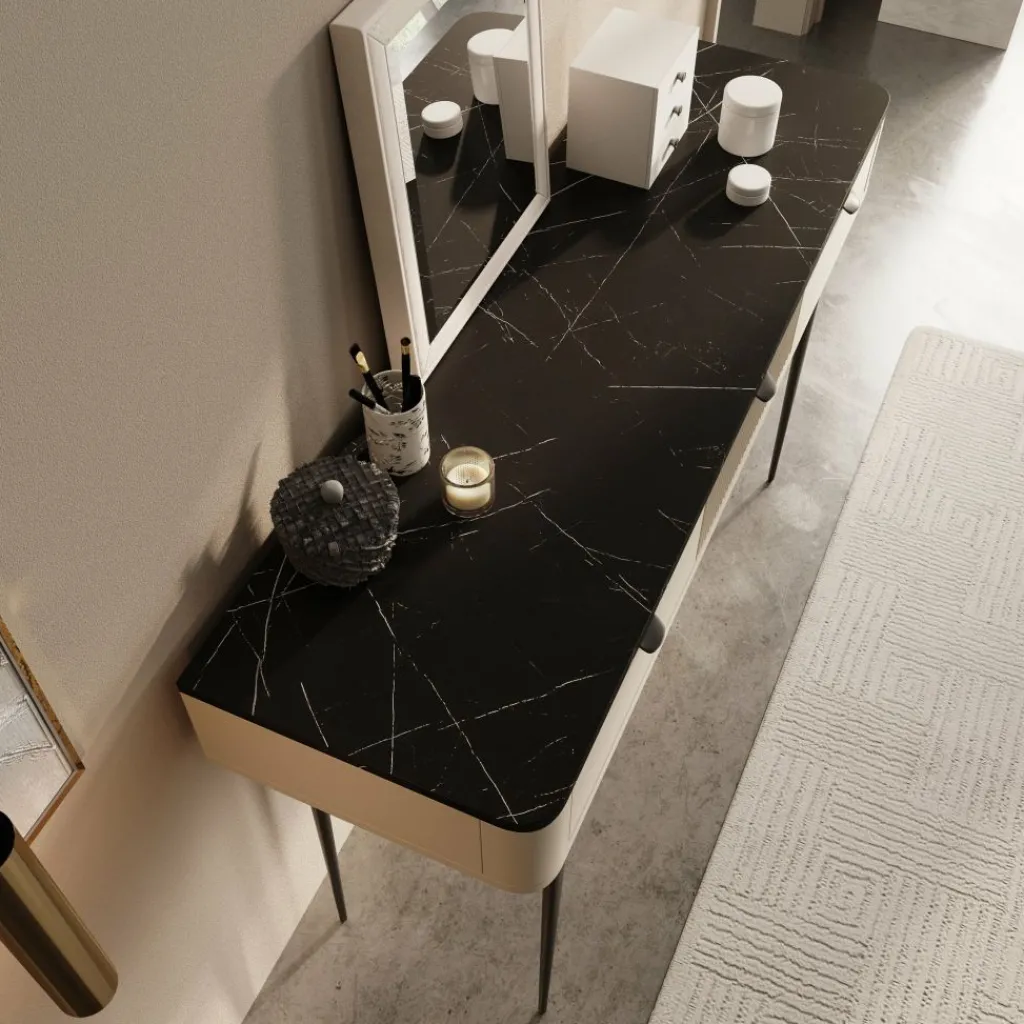 Geef je slaapkamer een stijlvolle upgrade met kaptafel Mace in luxe hotel chique stijl. Het royale bovenblad is afgewerkt in een elegante zwart marmerlook, wat direct een moderne en luxe sfeer neerzet.