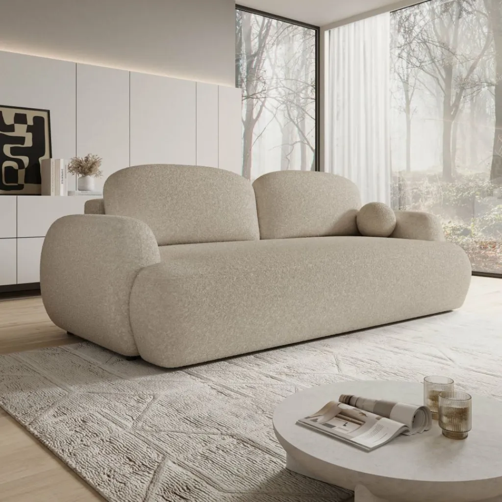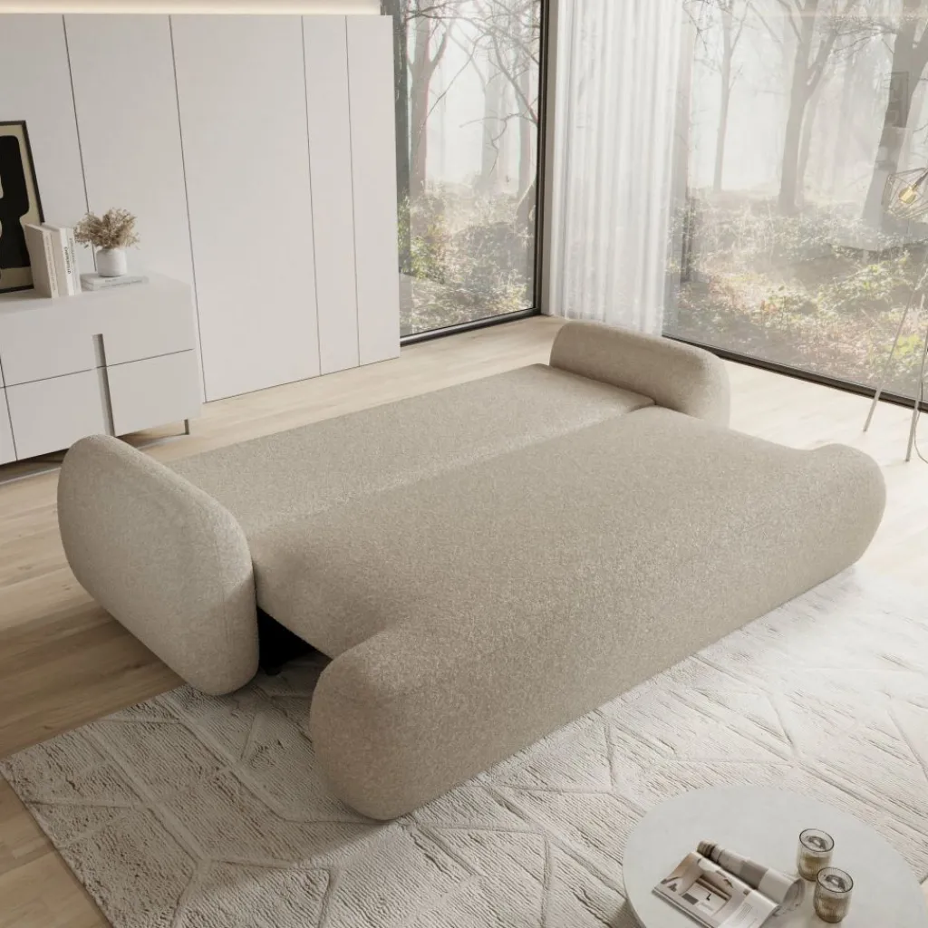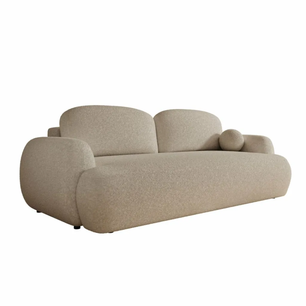 De Malaga slaapbank heeft een vol en afgerond ontwerp met brede armleuningen en een doorlopende zitting. De beige teddystof geeft de bank een rustige uitstraling die goed past in een lichte of moderne inrichting. Het silhouet bestaat uit zachte, ronde vormen zonder zichtbare naden of opvallende details.