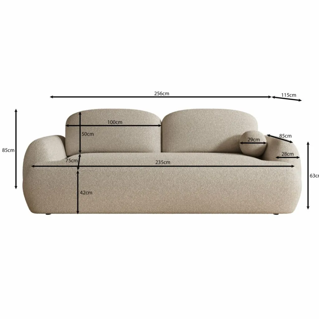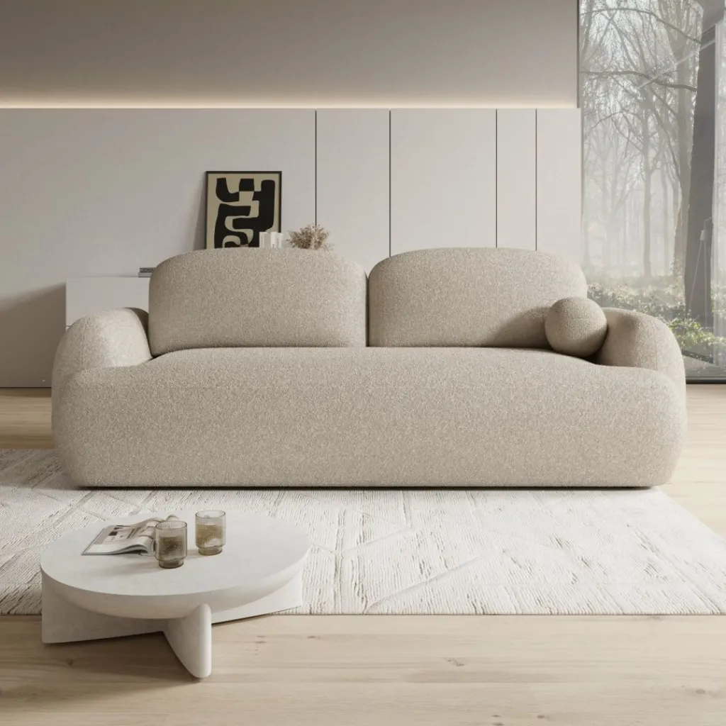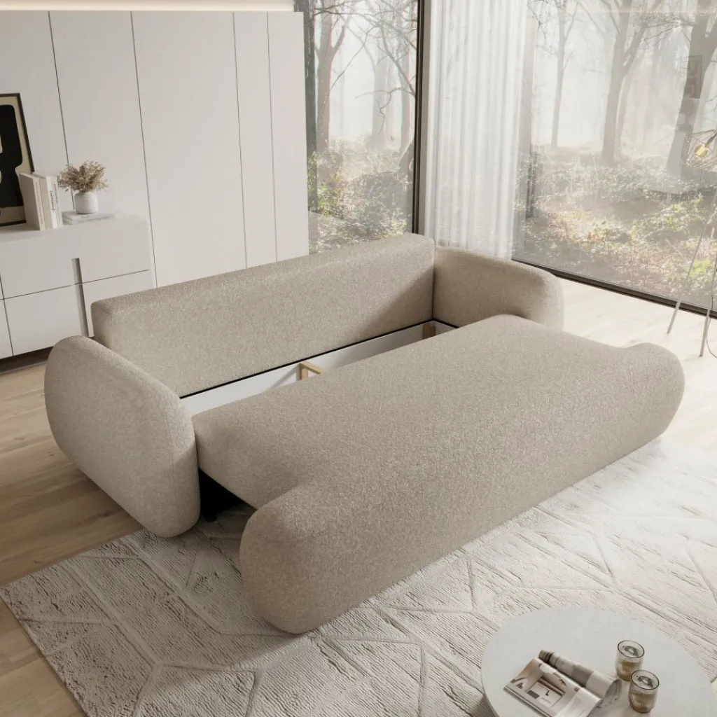 De Malaga slaapbank heeft een vol en afgerond ontwerp met brede armleuningen en een doorlopende zitting. De beige teddystof geeft de bank een rustige uitstraling die goed past in een lichte of moderne inrichting. Het silhouet bestaat uit zachte, ronde vormen zonder zichtbare naden of opvallende details.