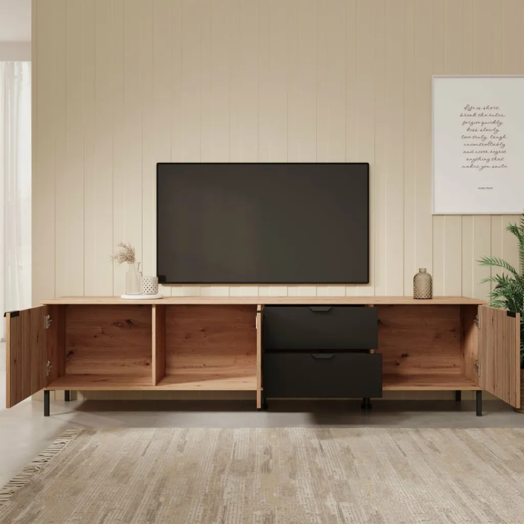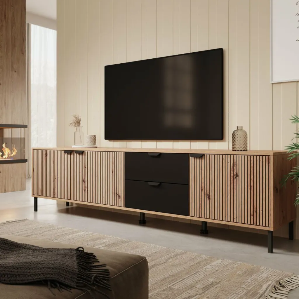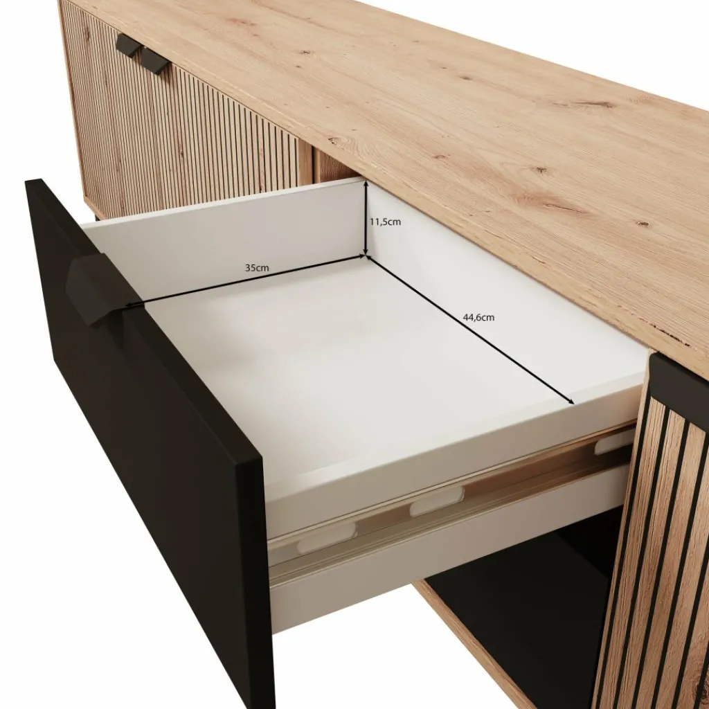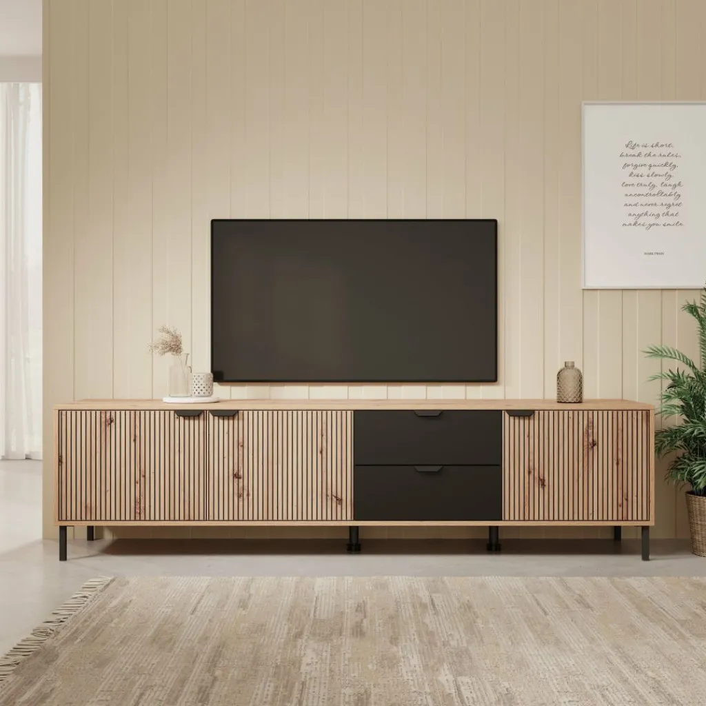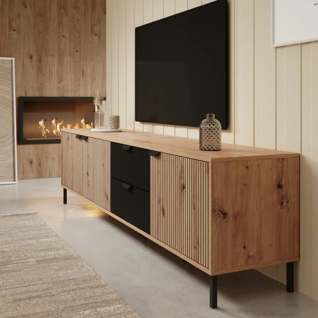 Het tv-meubel Malaika heeft een moderne uitstraling dankzij de combinatie van eikenlook en zwarte fronten. De deuren hebben een verticale latstructuur die onderdeel is van het oppervlak zelf, dus geen losse latjes en geen ingefreesde groeven. Dit zorgt voor een rustige en egale afwerking met een strak lijnenspel.