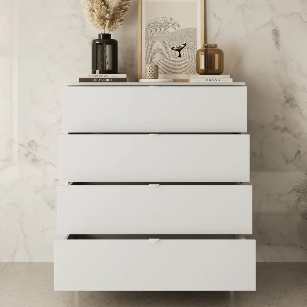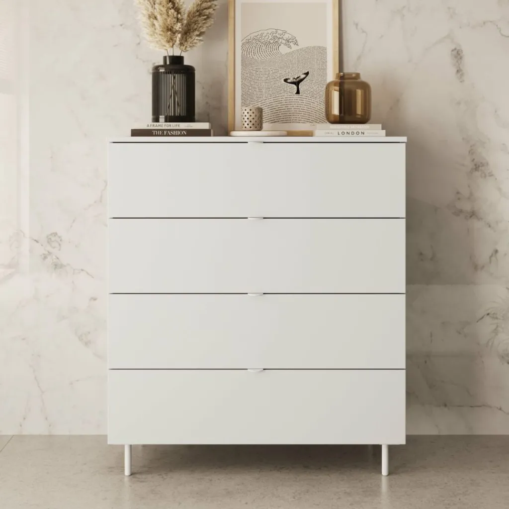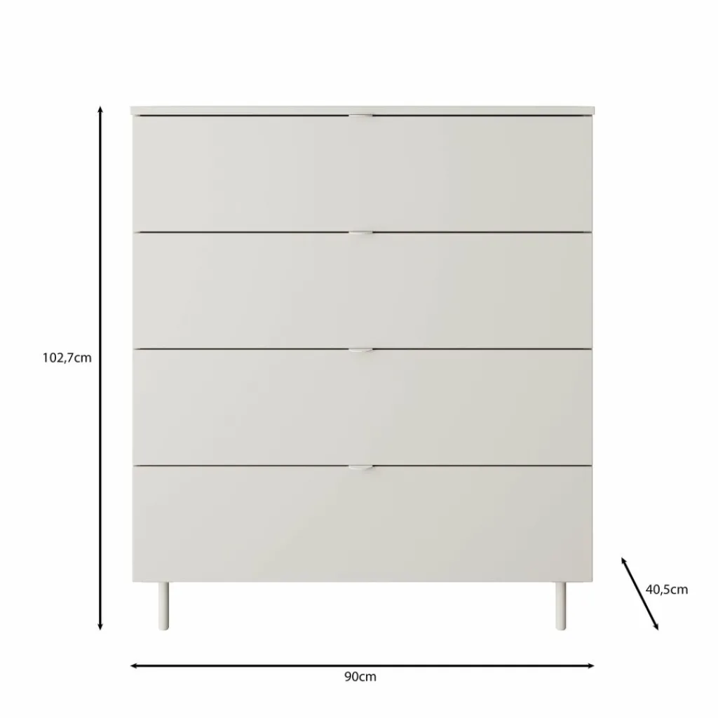De ladekast Malvare in wit is een stijlvolle en praktische opbergoplossing voor elke ruimte. Met een breedte van 90 cm biedt deze kast vier ruime lades waarin je al je spullen overzichtelijk kunt opbergen. Het strakke design in witte afwerking zorgt voor een moderne uitstraling, terwijl de greeploze fronten een minimalistische en rustige look creëren.