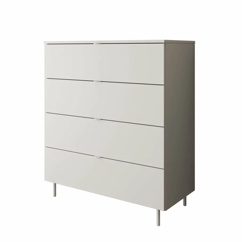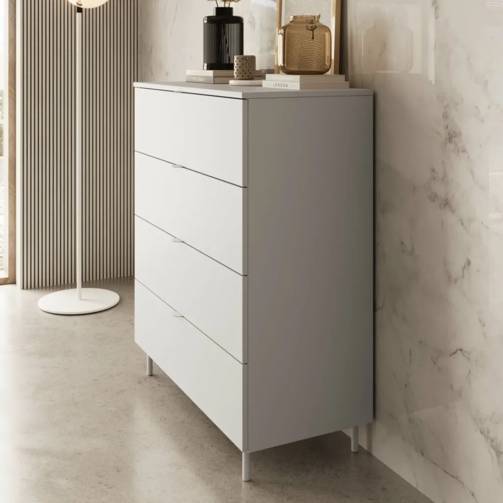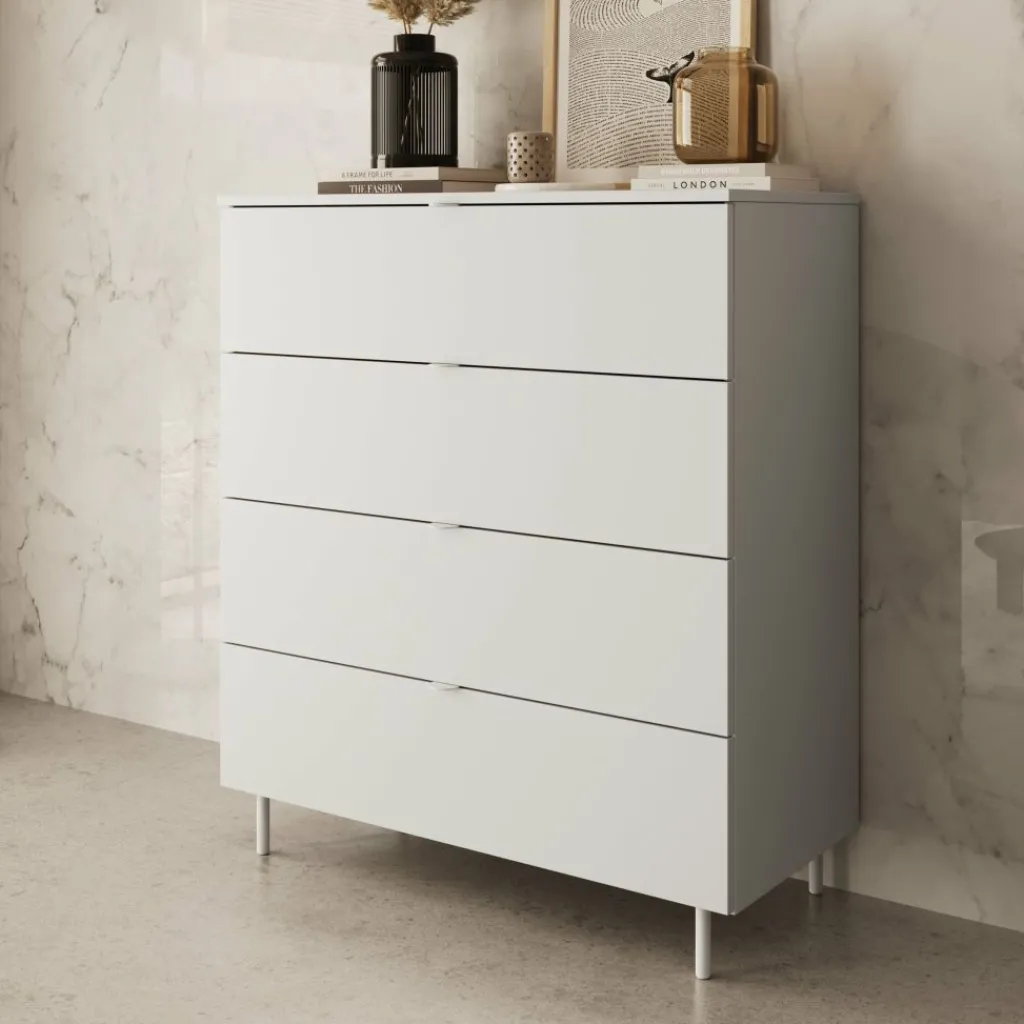 De ladekast Malvare in wit is een stijlvolle en praktische opbergoplossing voor elke ruimte. Met een breedte van 90 cm biedt deze kast vier ruime lades waarin je al je spullen overzichtelijk kunt opbergen. Het strakke design in witte afwerking zorgt voor een moderne uitstraling, terwijl de greeploze fronten een minimalistische en rustige look creëren.