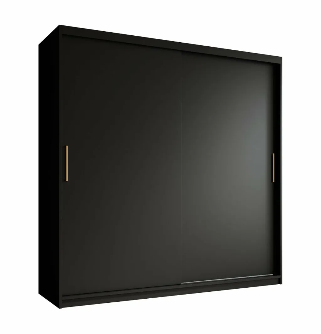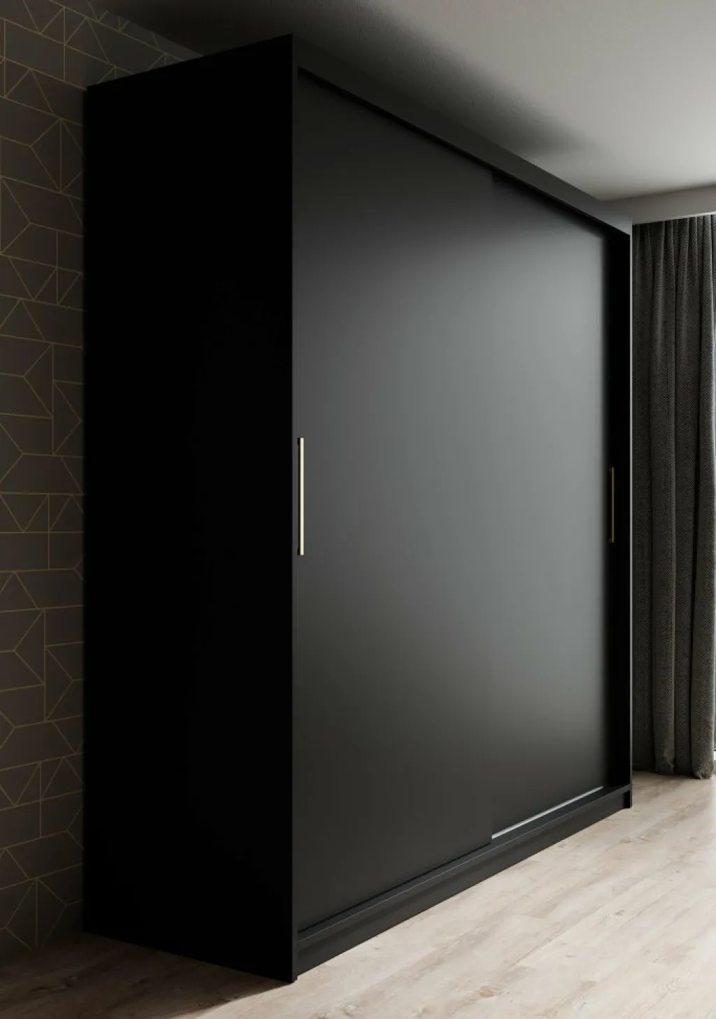 Garderobekast Mandalin is een moderne kast uitgevoerd in mat zwarte kleur. De kledingkast heeft twee schuifdeuren met daarachter veel opbergruimte, namelijk 10 opbergvakken en 2 kledingroedes om kleren aan op te hangen. De deuren zijn te openen middels goudkleurige handgrepen.