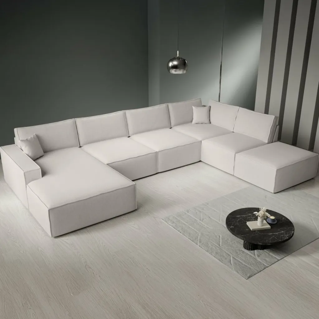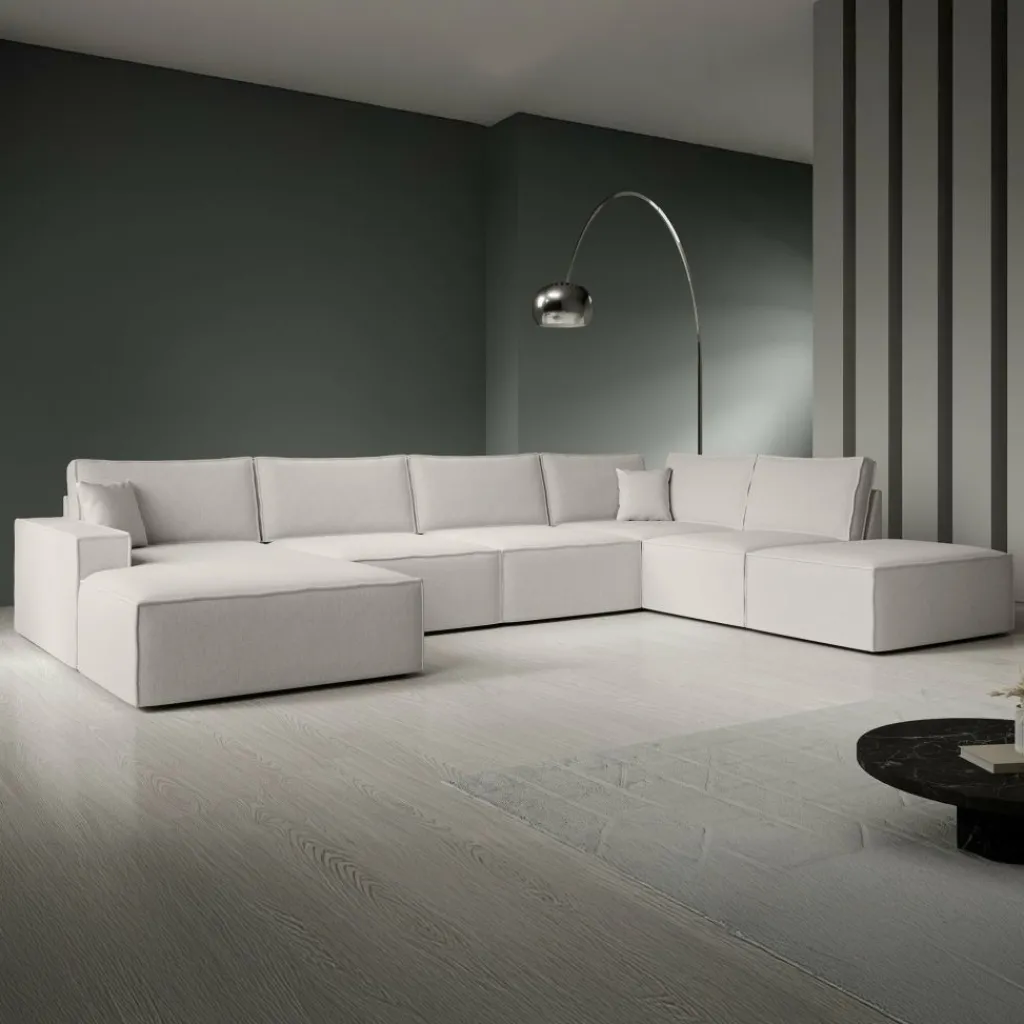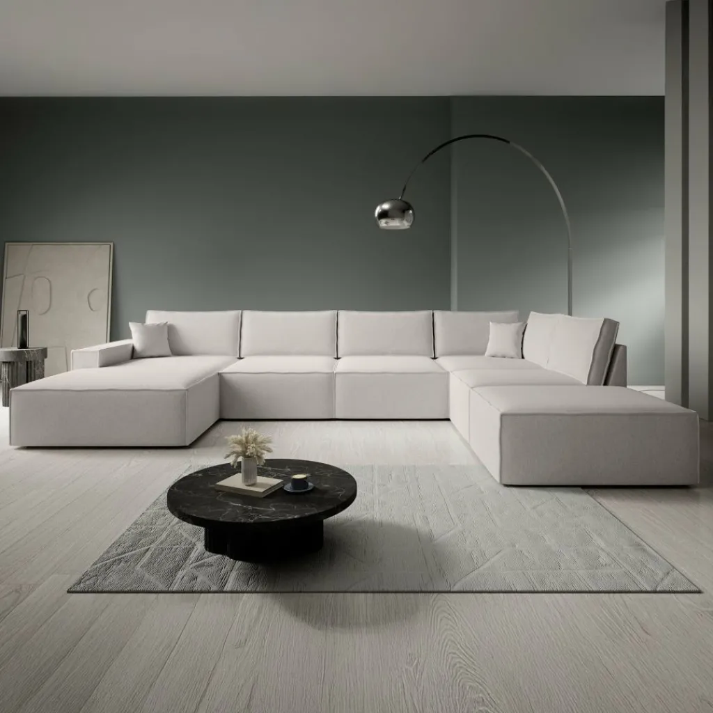 Hoekbank Manolo is een strakke, moderne hoekbank met een naar buiten gestikte siernaad op de randen. De Manolo is een U-vormige hoekbank en geschikt voor 6 tot 7 personen. Deze hoekbank beschikt over vaste zitkussens en grote, losse rugkussens. De bank bestaat uit een lounge-gedeelte, 2-zitsbank, hoekelement en 1,5 zitter. De bank staat op lage, kunststof pootjes.