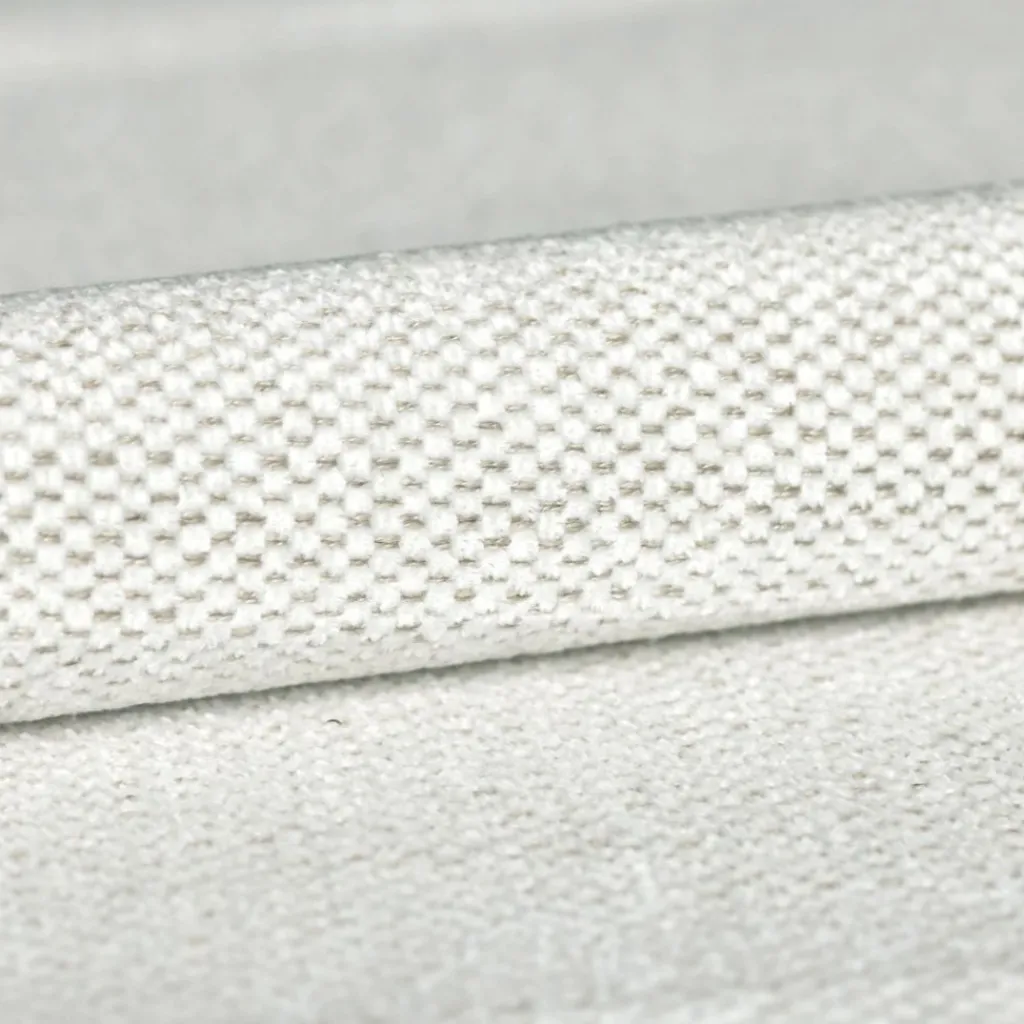 De bank is gemaakt van stof in een beige kleur.