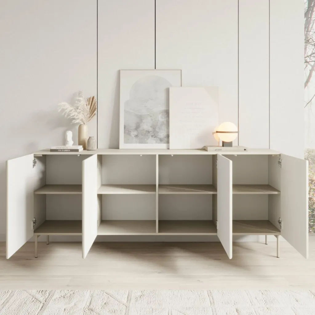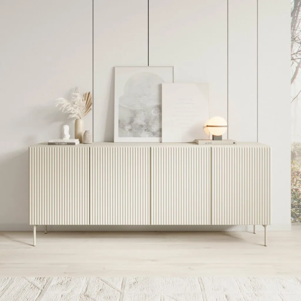 De vier deuren openen via geïntegreerde handgrepen en verbergen praktische opbergvakken. De verticale latstructuur geeft het front een stijlvolle, ritmische uitstraling, terwijl de beige kleur het geheel een elegante en tijdloze look geeft. Het dressoir staat op metalen poten voor extra stabiliteit en een luchtige uitstraling.