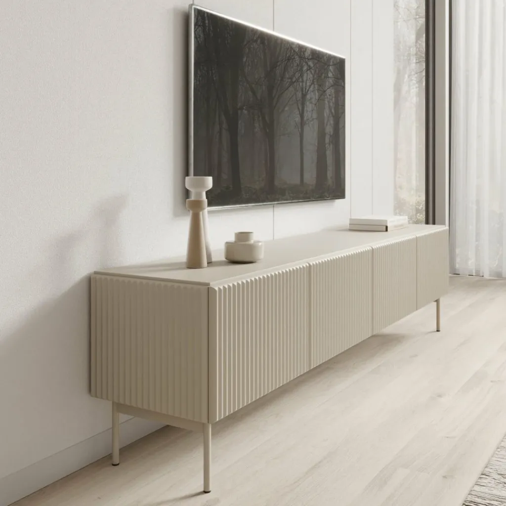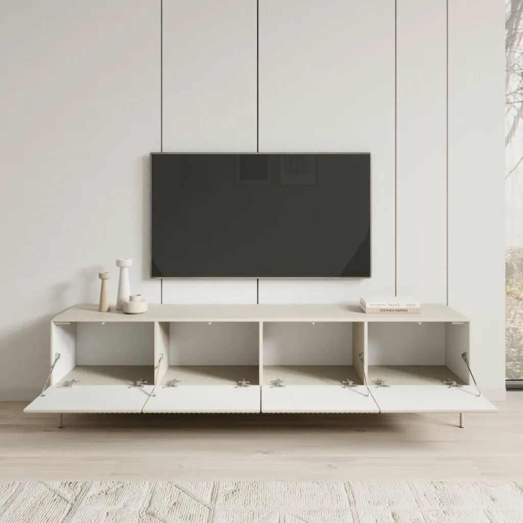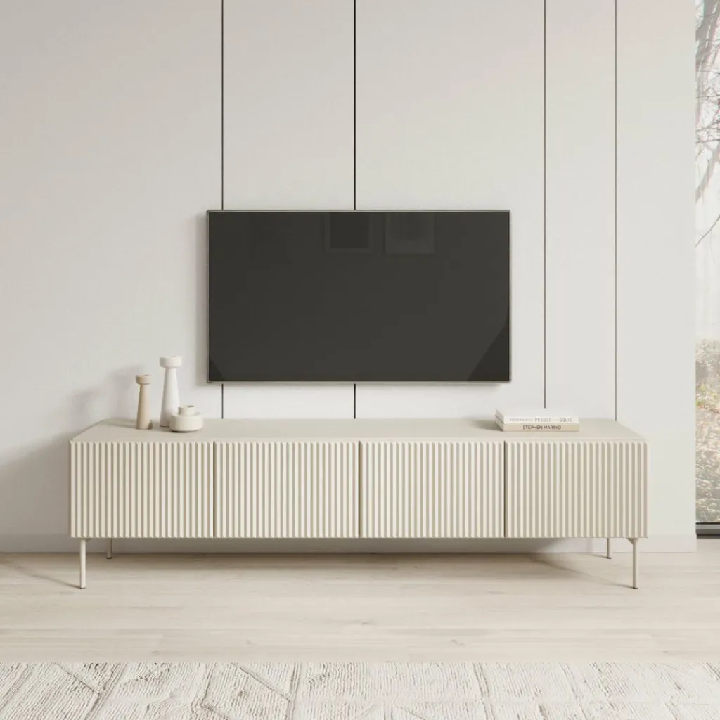 Het Marajo tv-meubel heeft een breedte van 195 cm, een diepte van 40 cm en een hoogte van 51 cm. De kast is uitgevoerd in beige en voorzien van vier deuren met een verticale latstructuur aan de voorzijde. Achter de deuren bevinden zich ruime vakken voor het opbergen van apparatuur, kabels en andere accessoires.