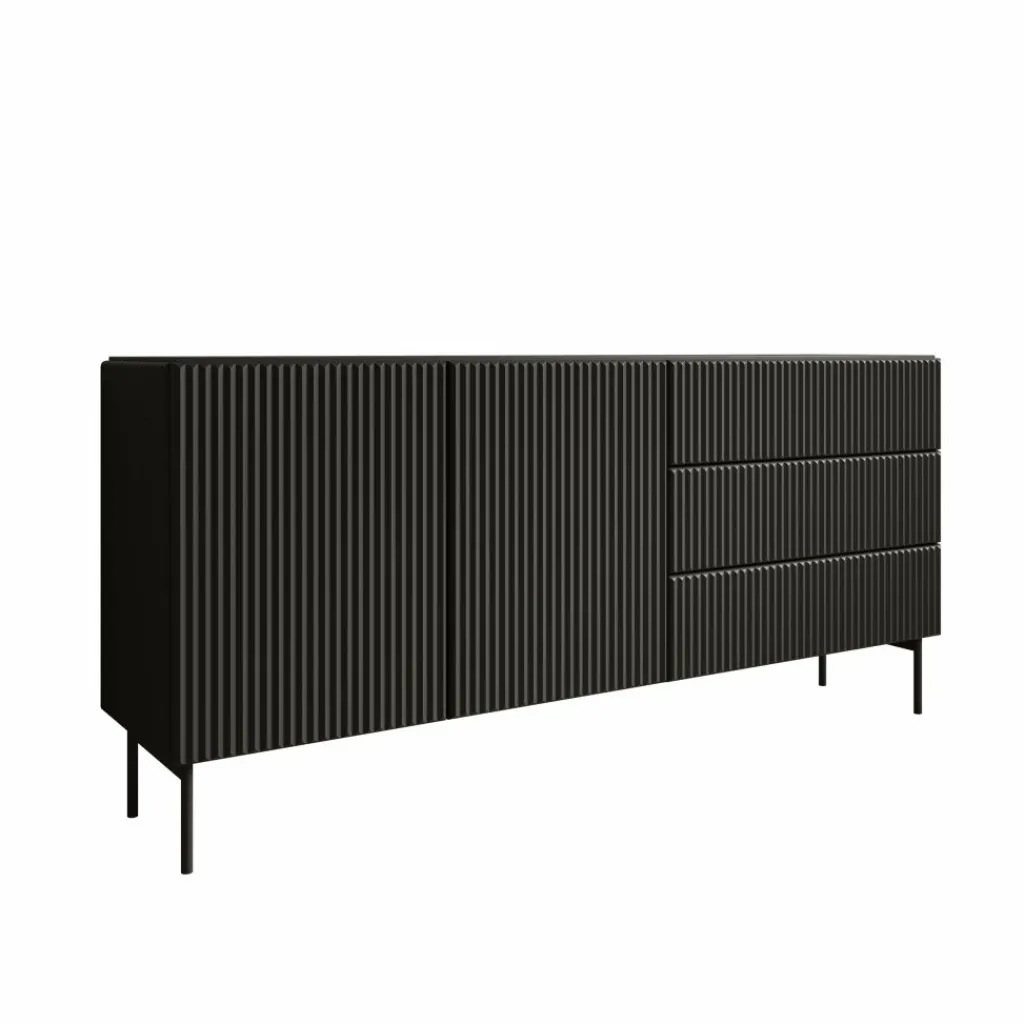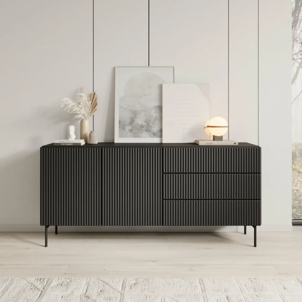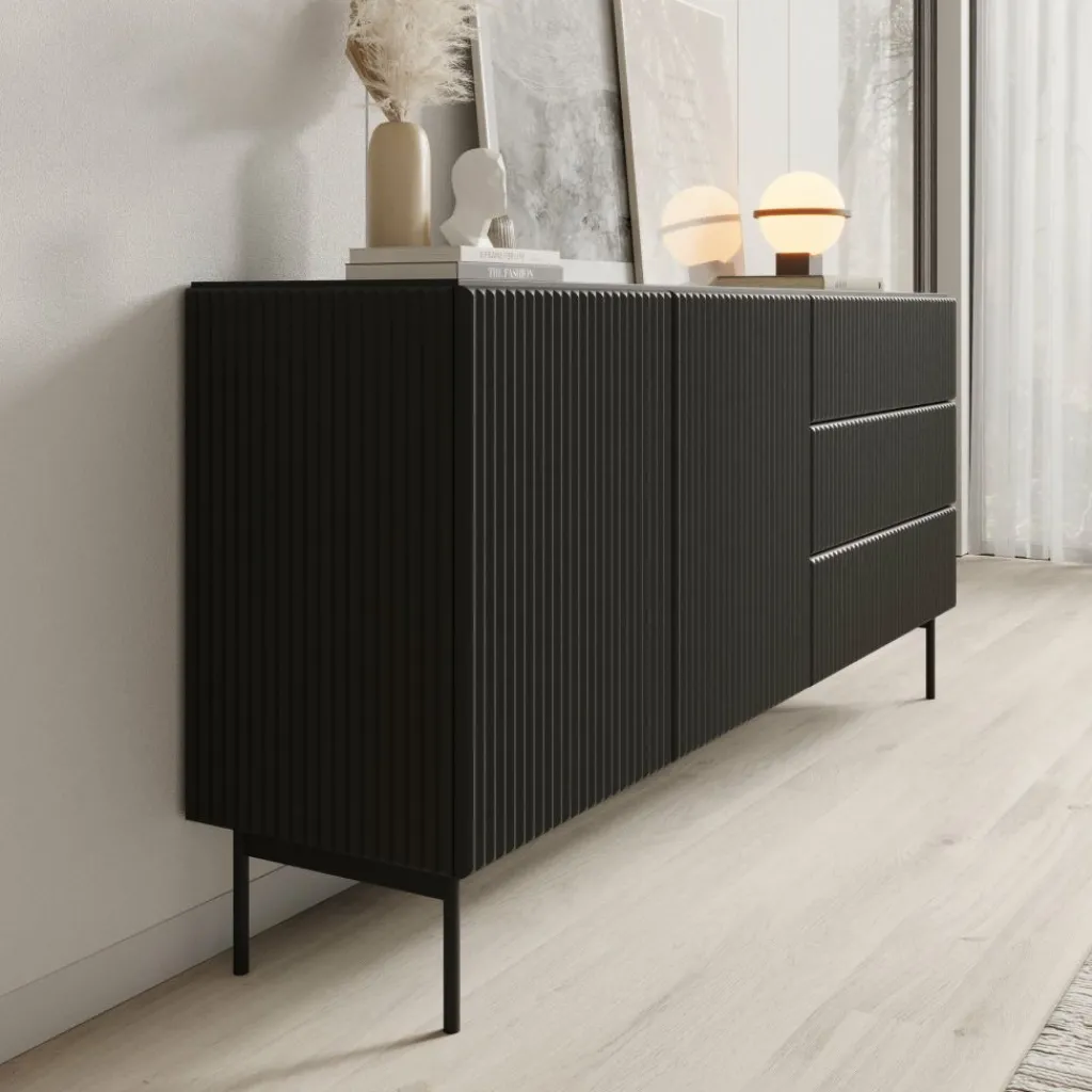 De verticale latstructuur op de fronten geeft het meubel een strak lijnenspel, terwijl de zwarte afwerking zorgt voor een moderne uitstraling. De metalen poten dragen bij aan de stevigheid en stabiliteit van het geheel. De deuren en lades openen eenvoudig via geïntegreerde handgrepen.