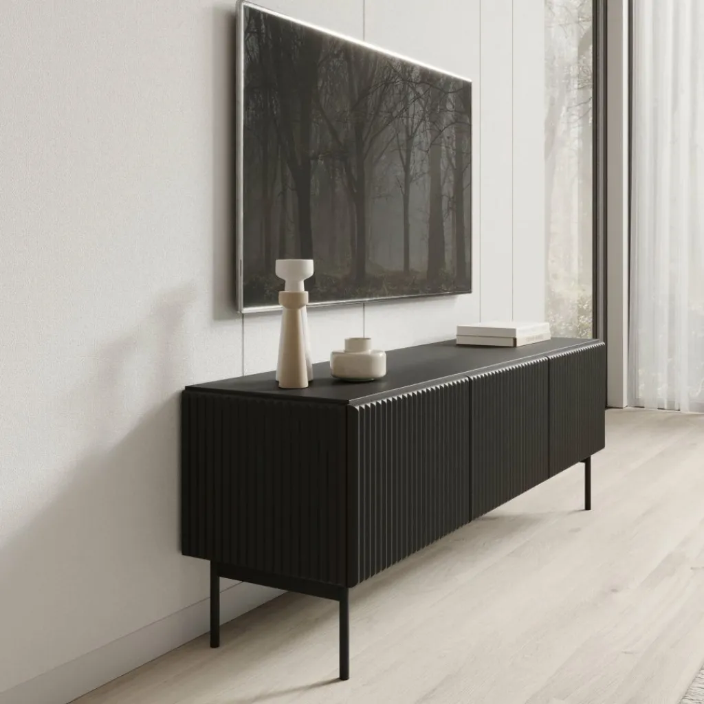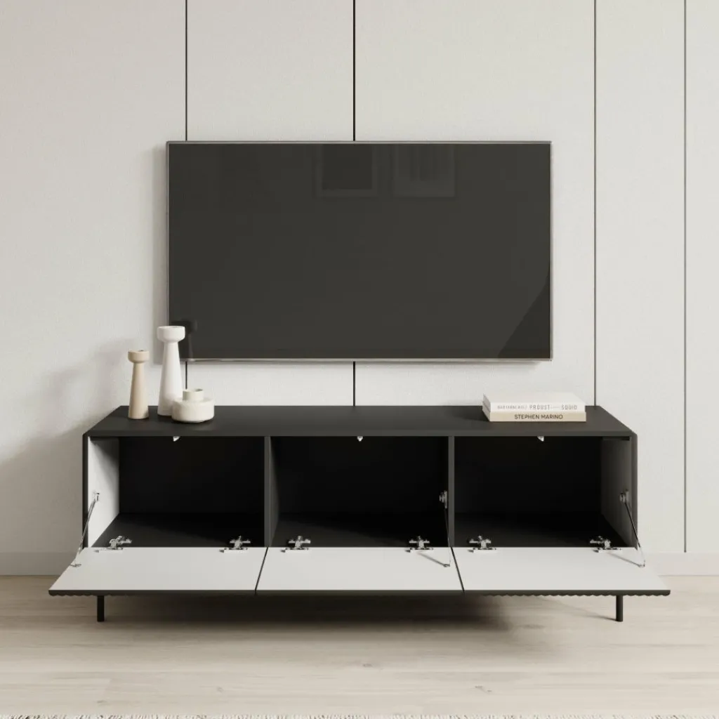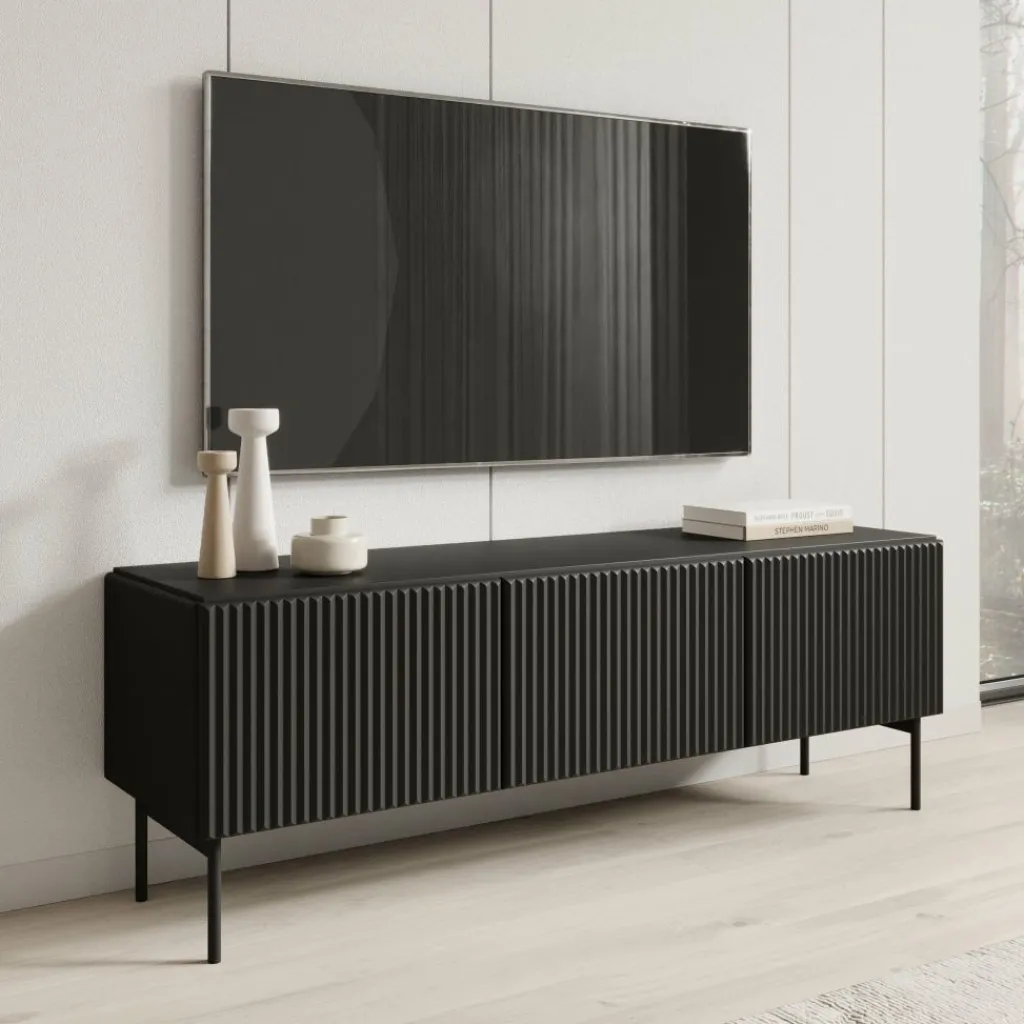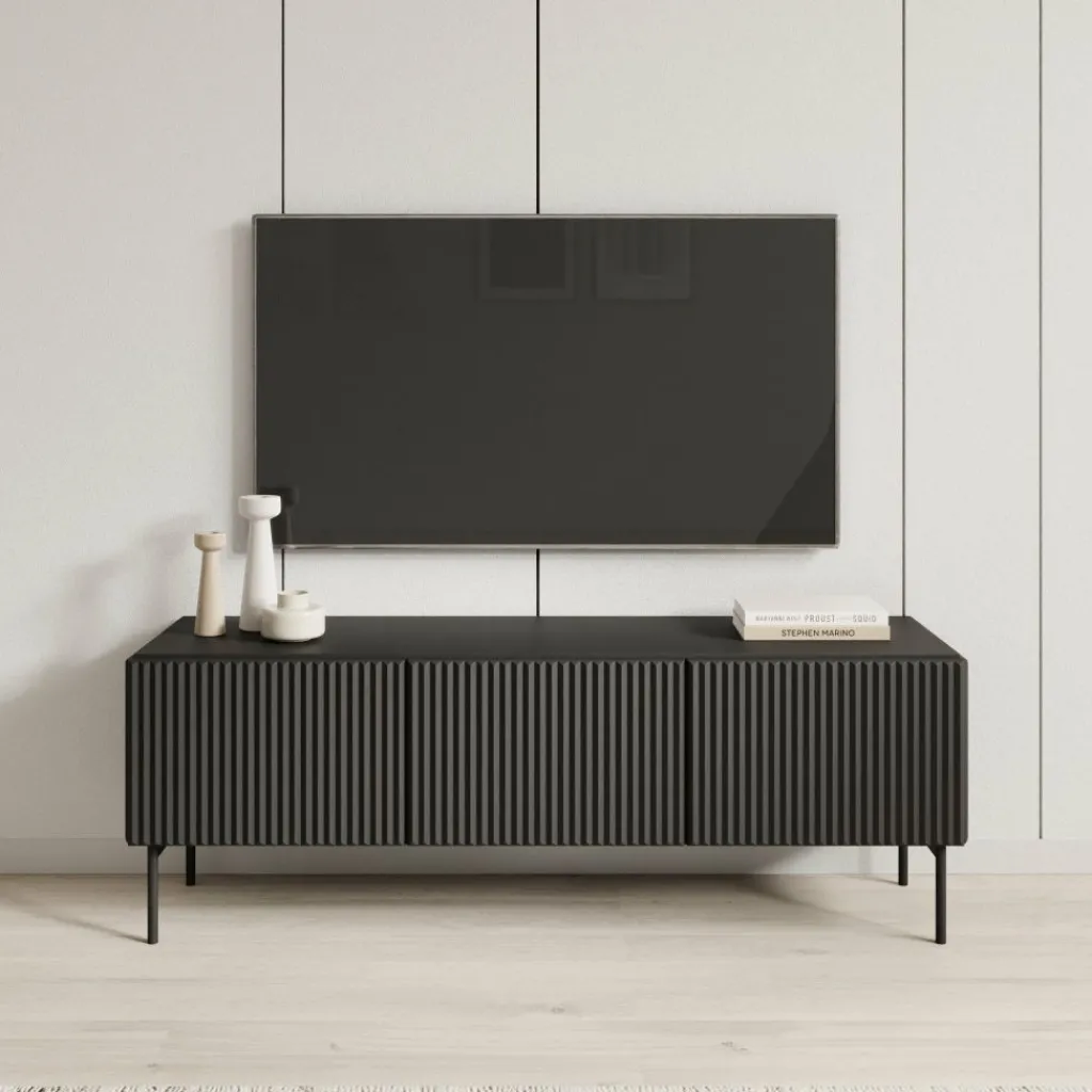 Het Marajo tv-meubel heeft een breedte van 147 cm, een diepte van 40 cm en een hoogte van 51 cm. De kast is uitgevoerd in zwart en voorzien van drie deuren met een verticale latstructuur aan de voorzijde. Achter de deuren bevinden zich ruime vakken voor het opbergen van apparatuur en accessoires.