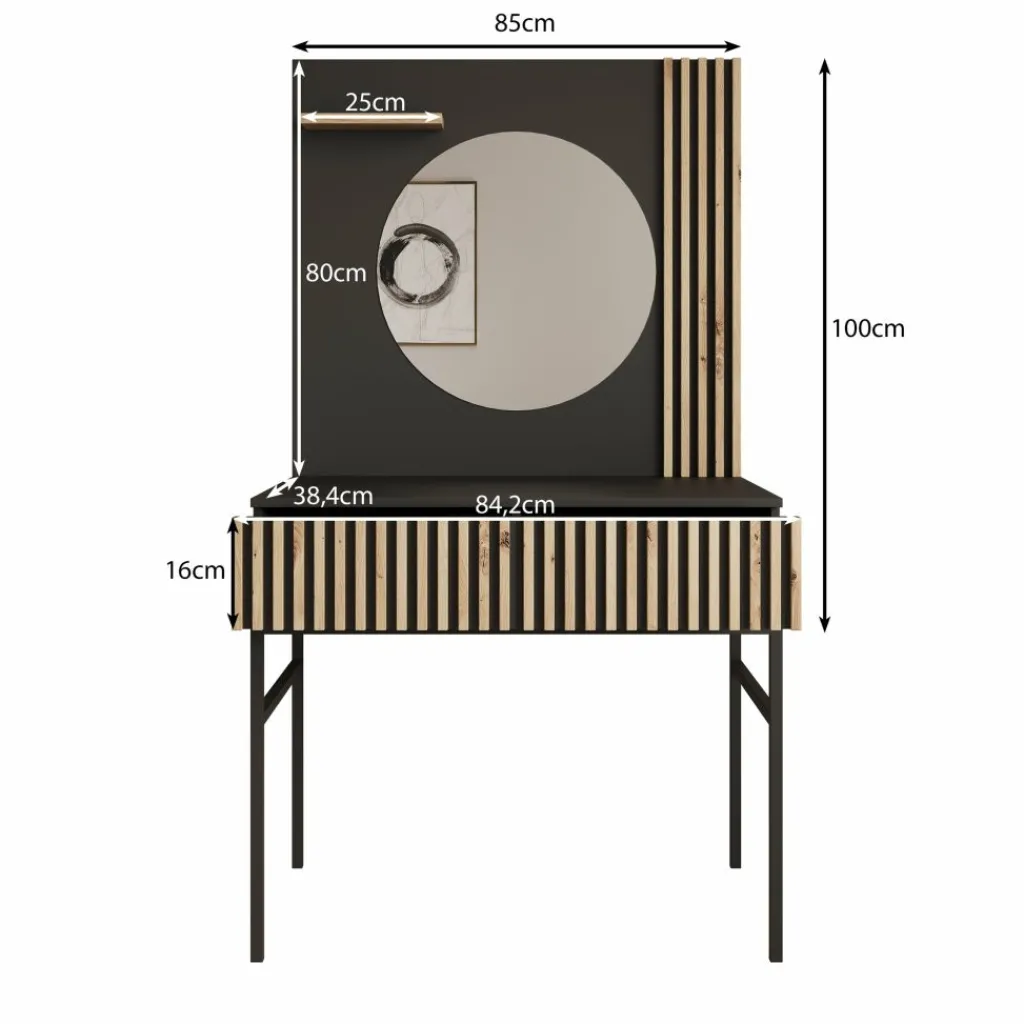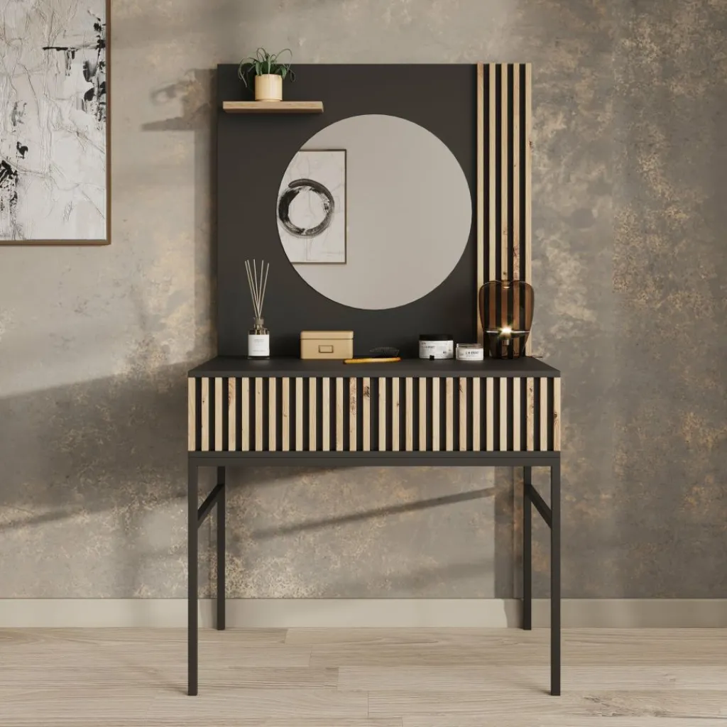 Kaptafel Marbella is moderne, industriële kaptafel uitgevoerd in een zwarte kleur. De kaptafel beschikt over een greeploze opberglade waarvan de voorkant eiken kleurige latjes heeft. Het blad is 85×38 cm en biedt daardoor genoeg plek voor alle make-up, sieraden en accessoires. Ook beschikt de Marbella over een mooie zwarte achterwand met latjes waar een ronde spiegel op is geplaatst. Ten slotte staat dit meubel op een metalen onderstel.