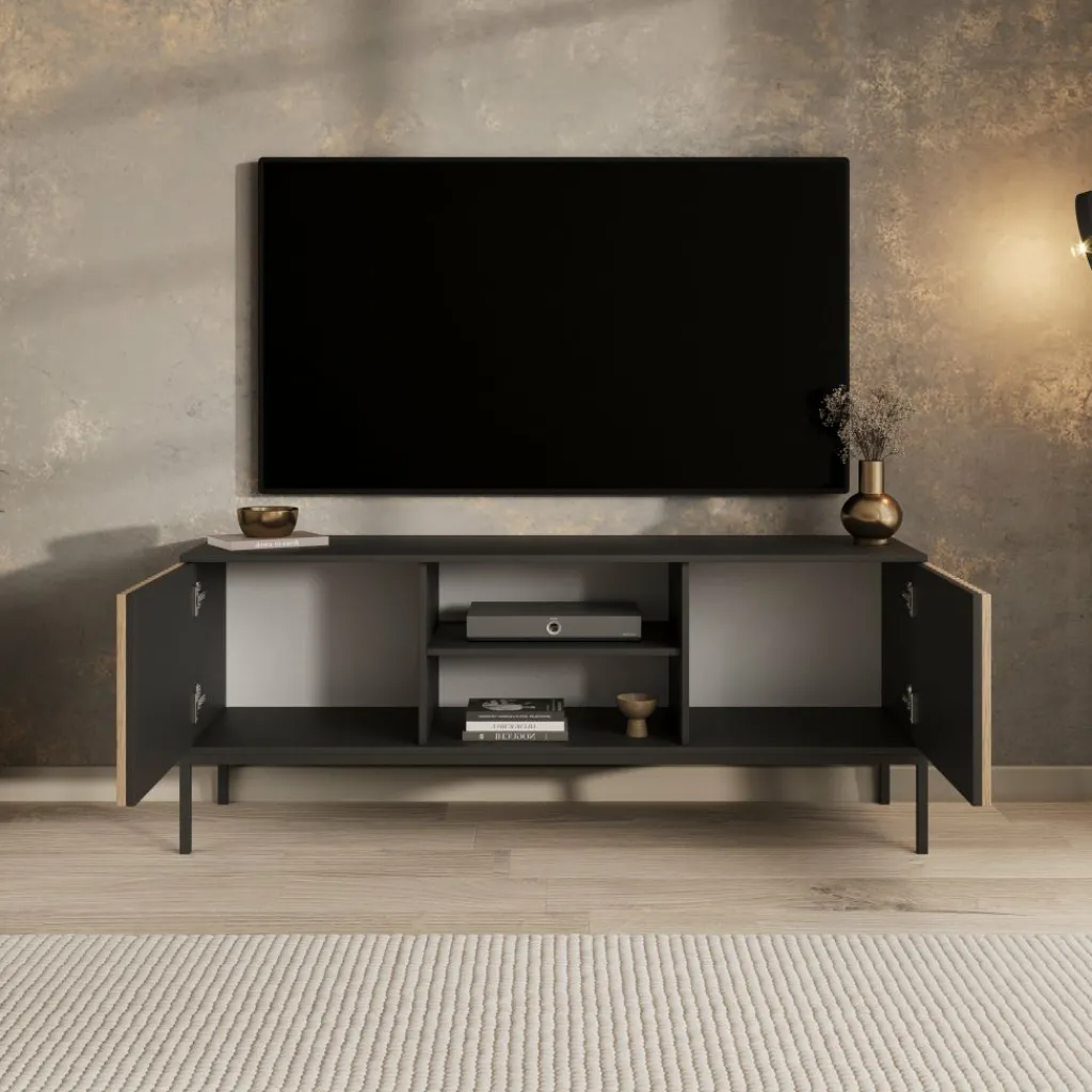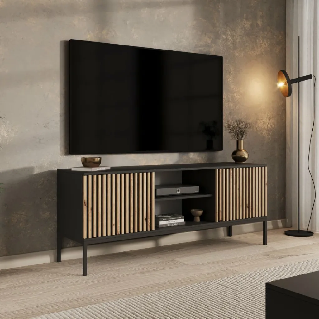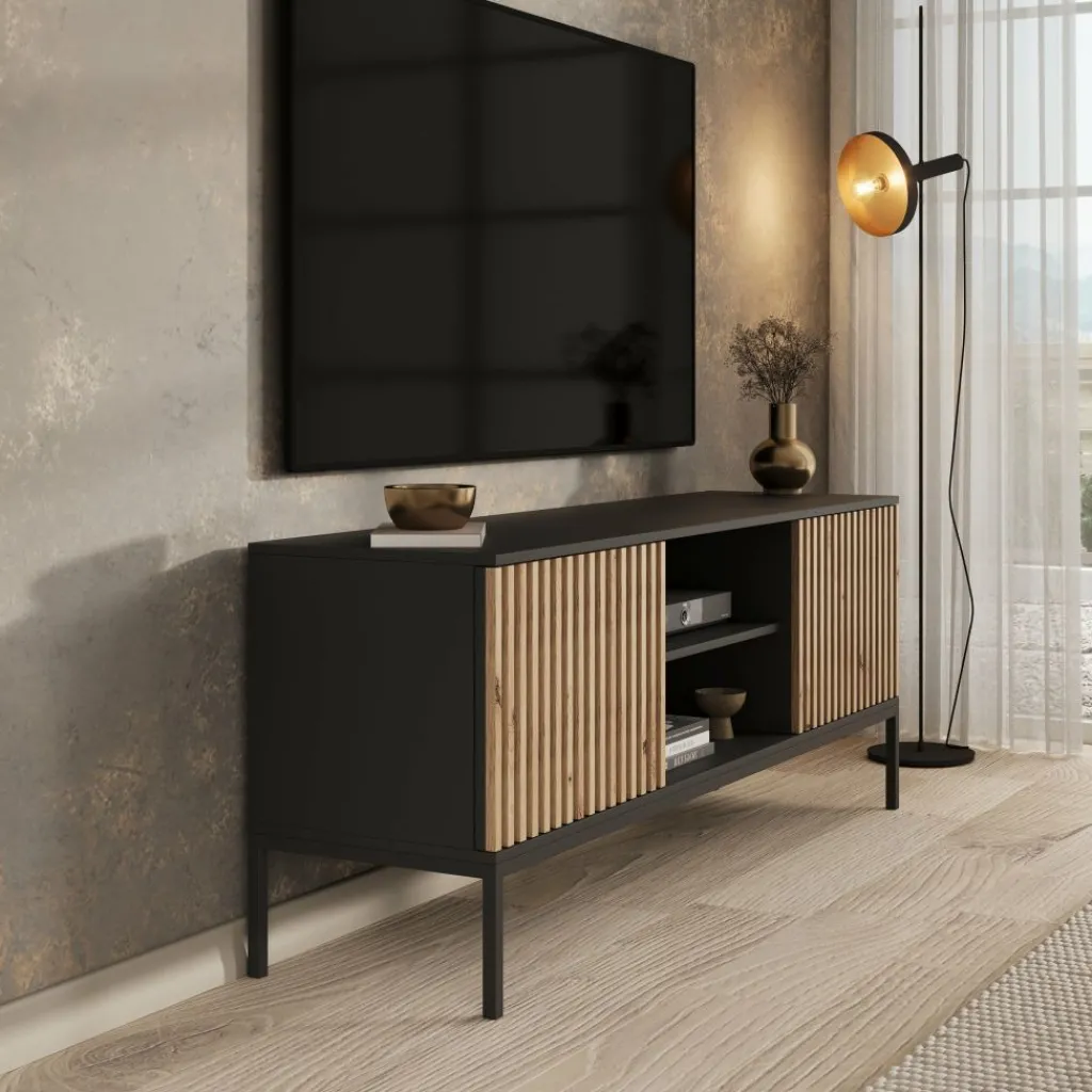 TV-Meubel Marbella is een opbergkast voor onder de tv in een moderne, industriële stijl. De TV-kast is gemaakt in een mat zwarte kleur. De Marbella beschikt over 2 open vakken en 2 deuren. Deze deuren hebben op de voorkant eiken kleurige latjes. De kast staat op een metalen onderstel. Er zit geen uitsparing voor bedrading in de achterwand van dit meubel.